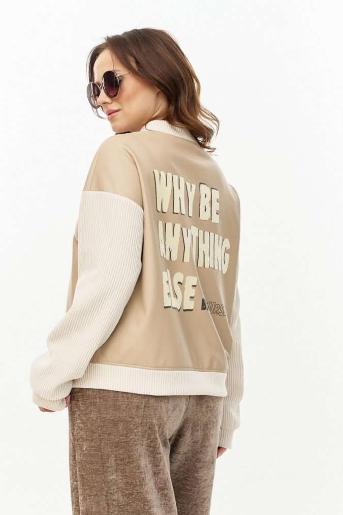 Бомбер из мягкой и эластичной экокожи, длиной до линии бедер, с застежкой на молнию, горловиной со стойкой и боковыми карманами в швах. Рукава, стойка и манжета низа из отделочного вельветового трикотажа. Спинка декорированаавторским принтом с использованием флока. Изделие на подкладке.