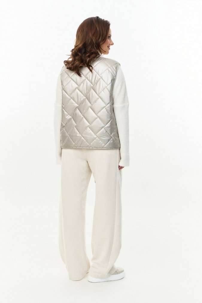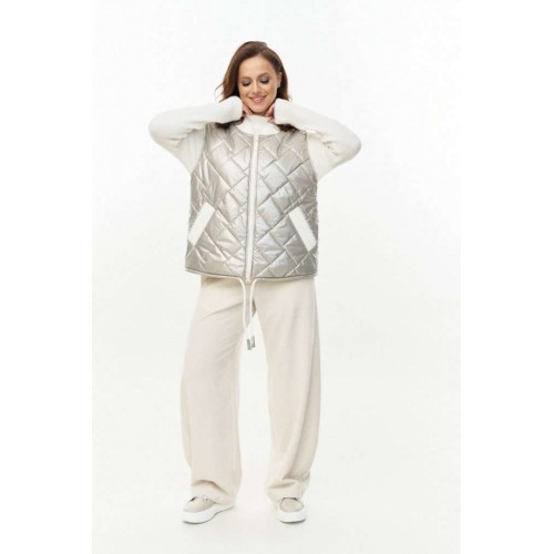 Стеганый жилет из водоотталкивающей плащевки на синтепоне, длиной до линии бедер, прямого силуэта, с застежкой на молнию и горловиной со стойкой. Стойка и листочки карманов из плотного трикотажного довяза "альпака". Низ жилета с кулисой и шнуром. Изделие на подкладке.