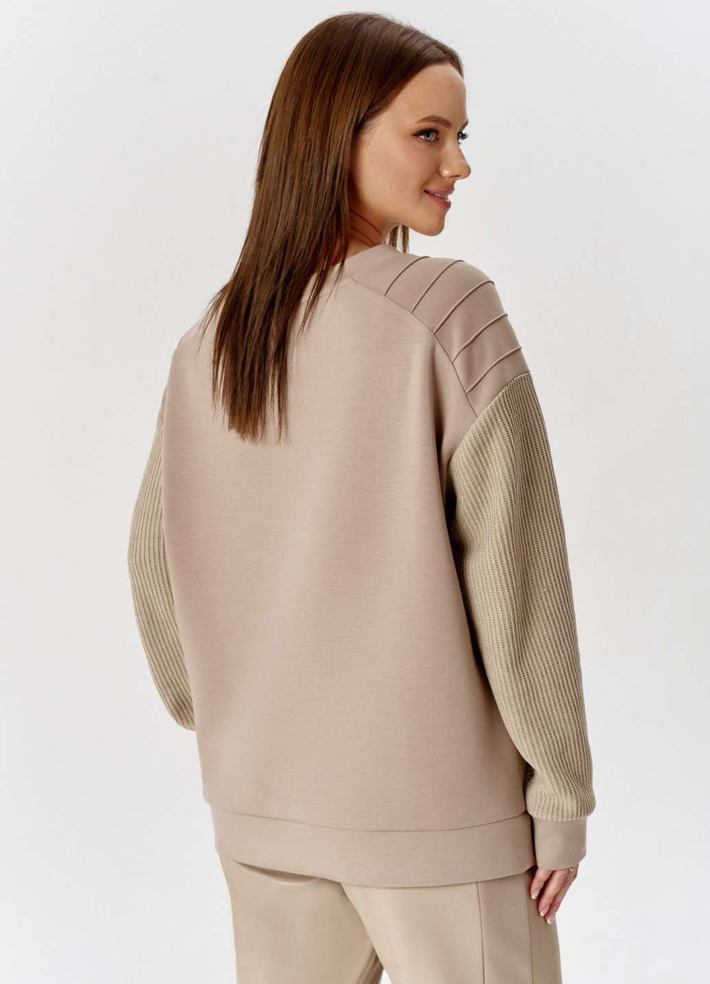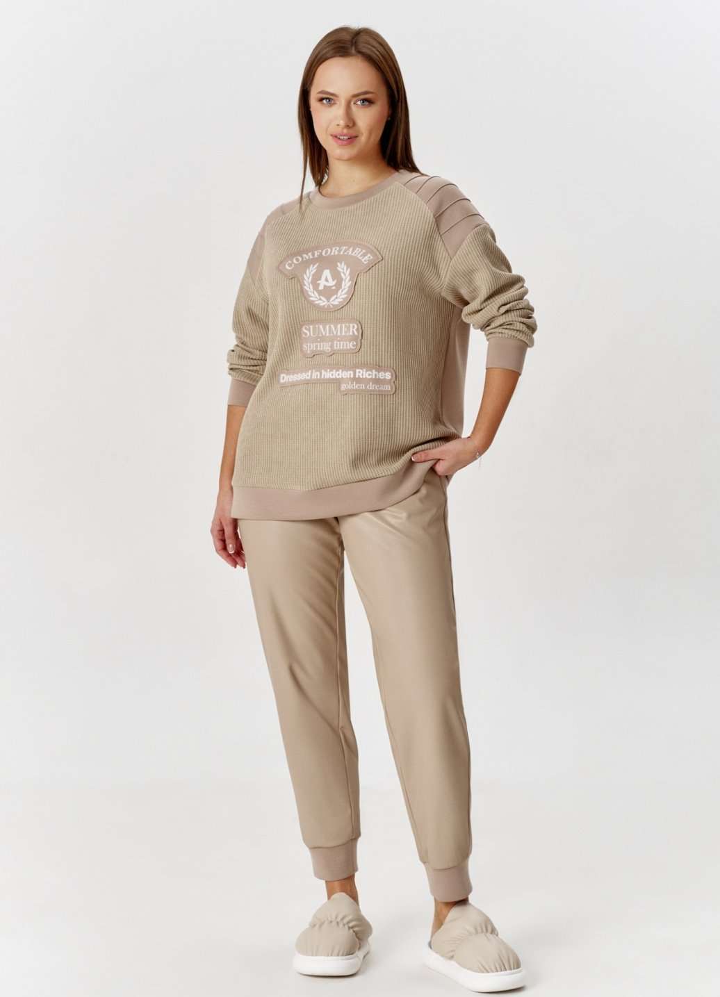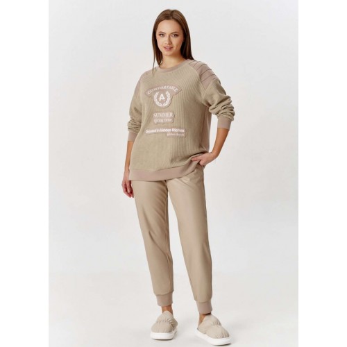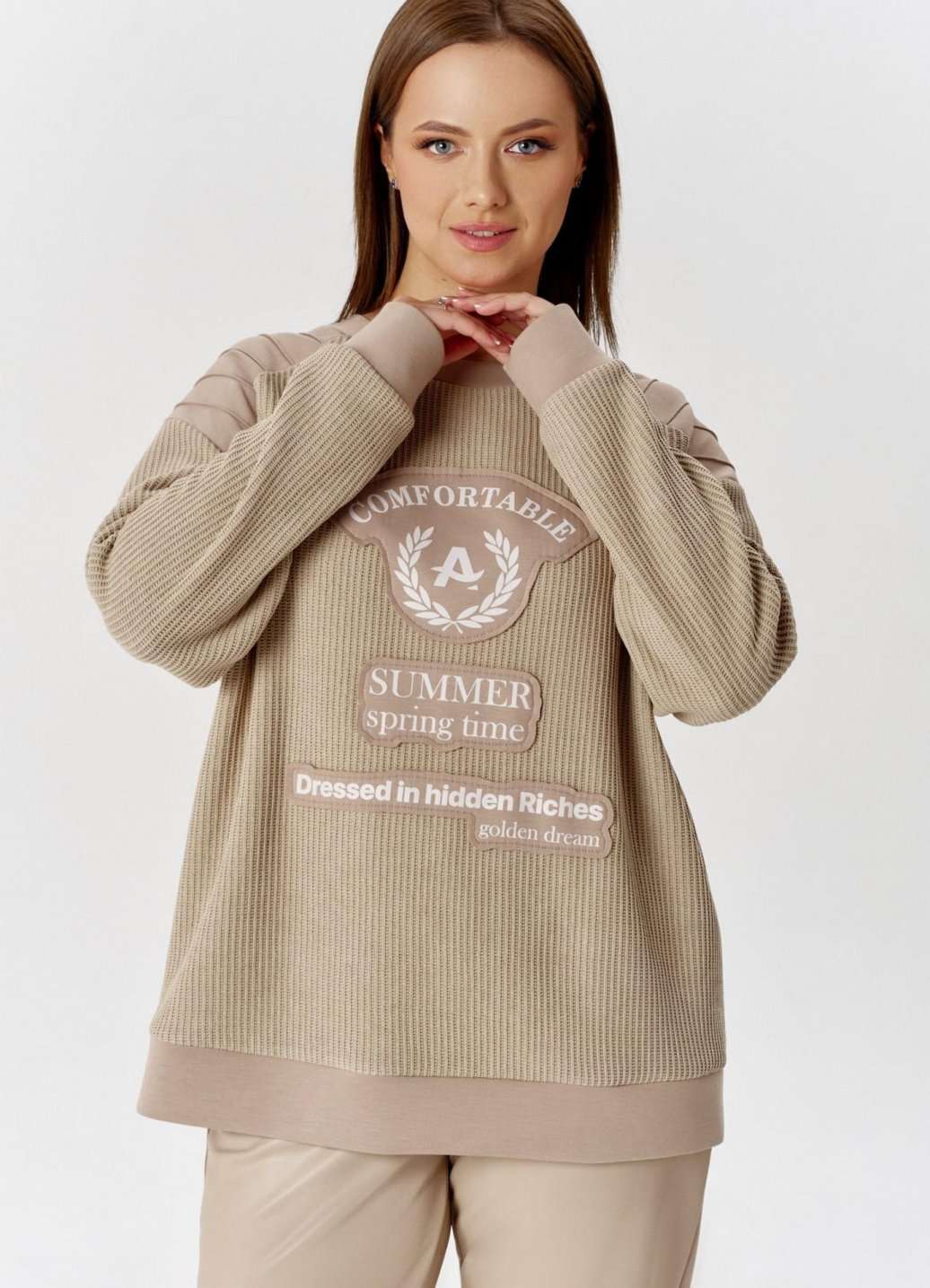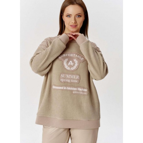 Свитшот с эффектной комбинацией двух видов трикотажа: вязка и гладкий, свободного силуэта, с круглой горловиной. Рукав длинный, с притачной манжетой. По линии плеча отрезные кокетки с защипами. На переде изделия аппликация с необработанными срезами с авторским шрифтовым принтом.