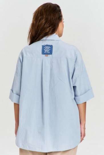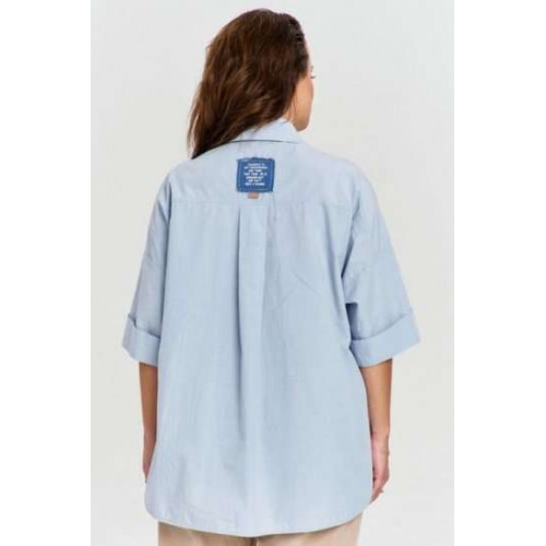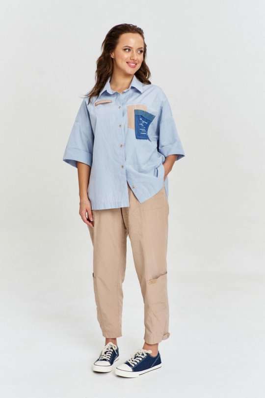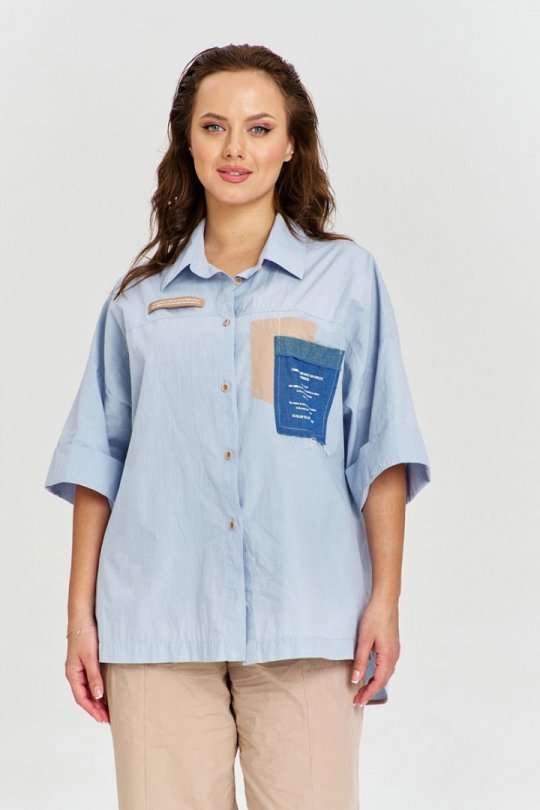Рубашка из 100% хлопковой ткани с легким крэш эффектом, свободного силуэта, удлиненной спинкой, застежкой на пуговицы спередии рубашечным воротником. Спинка с отрезной кокеткой и бантовой складкой. Линия плеча спущена, рукав широкий, короткий, с отложной манжетой. На переде отрезные кокетки и декоративные накладные карманы из отделочных материалов с авторским принтом.