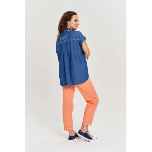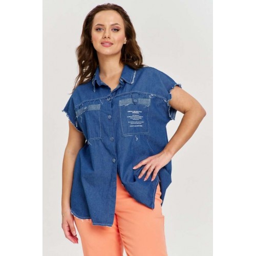 Рубашка из тонкого хлопкового джинса, свободного силуэта, удлиненной спинкой, застежкой на пуговицы спереди и рубашечным воротником. Спинка с отрезной кокеткой и бантовой складкой. Рукав короткий, цельнокроеный. На переде отрезные кокетки и накладные карманы с авторским принтом. Некоторые швы изделия необработаны, при энзимной стирке обретают стильную вытрепанность.
