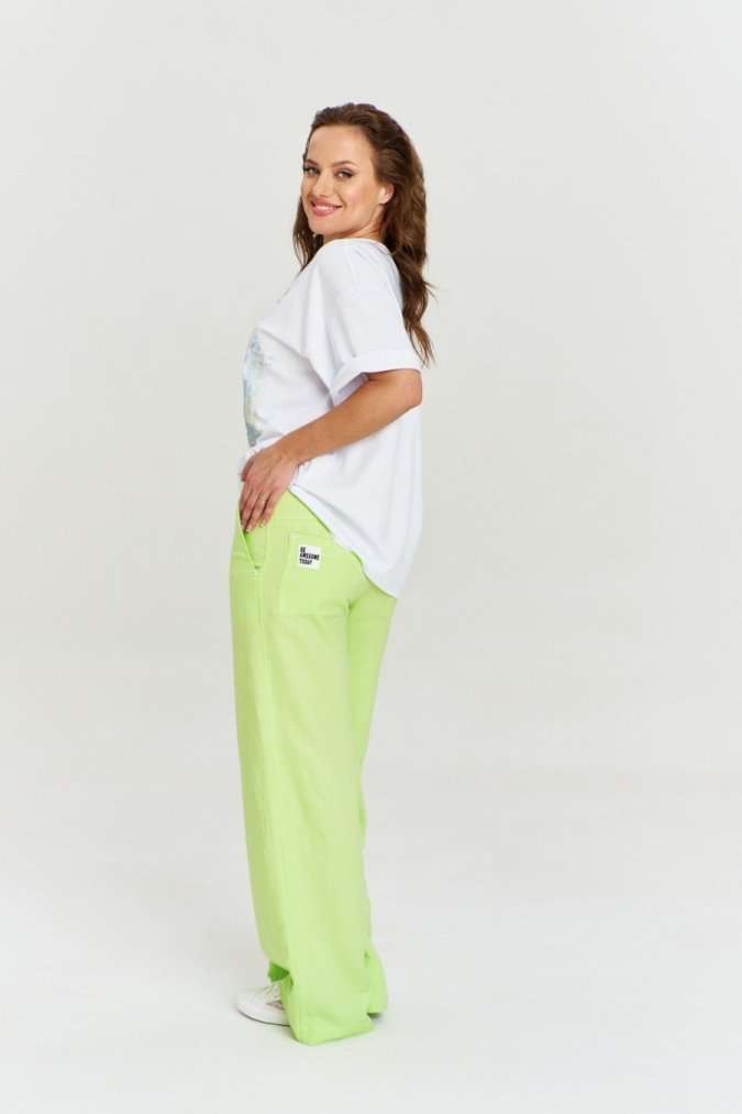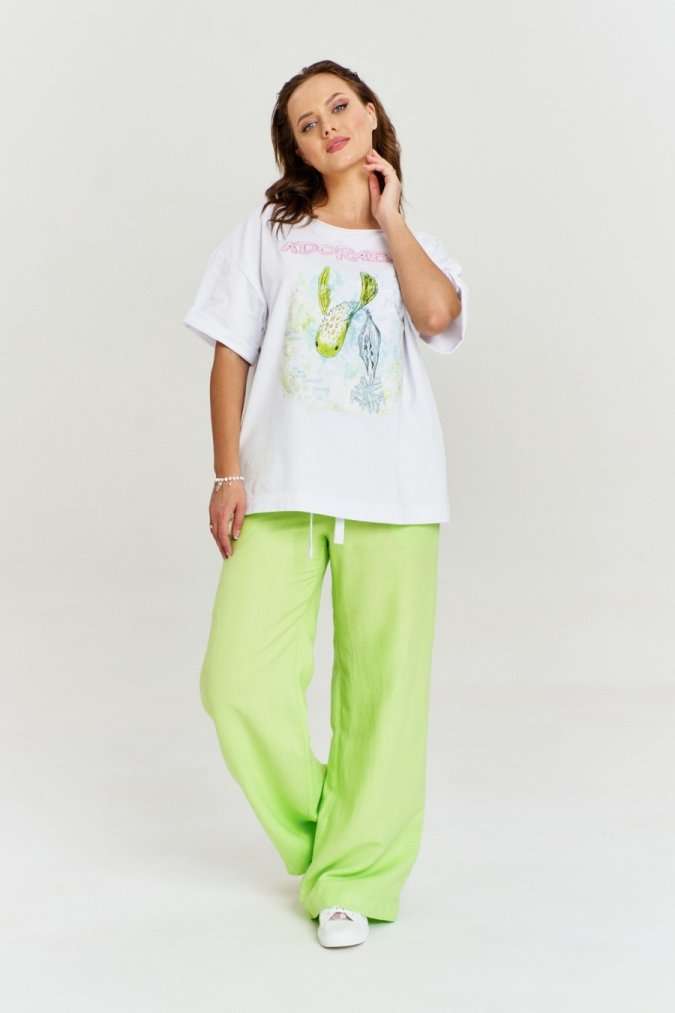 Футболка из хлопковой кулирки, умеренный оверсайз, со спущенным плечом и коротким рукавом. Вырез горловиныкруглый, с необработанной бейкой. Перед декорирован авторским принтом.