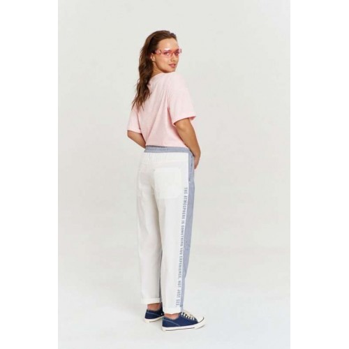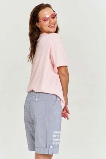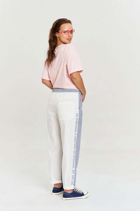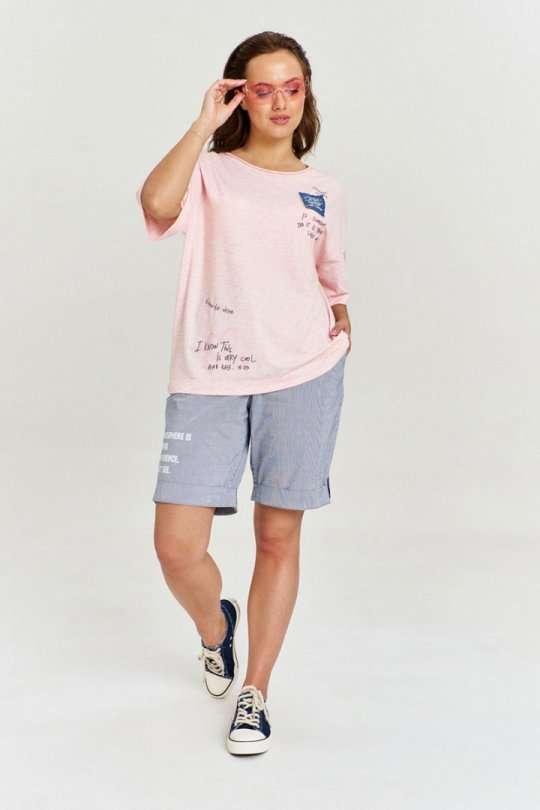 Футболка из хлопковой кулирки, умеренный оверсайз, со спущенным плечом и коротким рукавом. Вырез горловины круглый, с необработанной бейкой. Изделие декорировано авторскими принтами и джинсовой нашивкой с необработанными срезами.