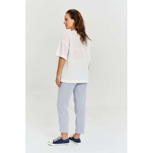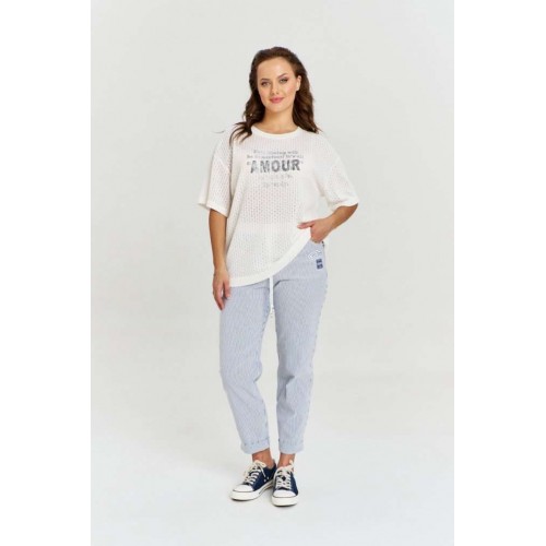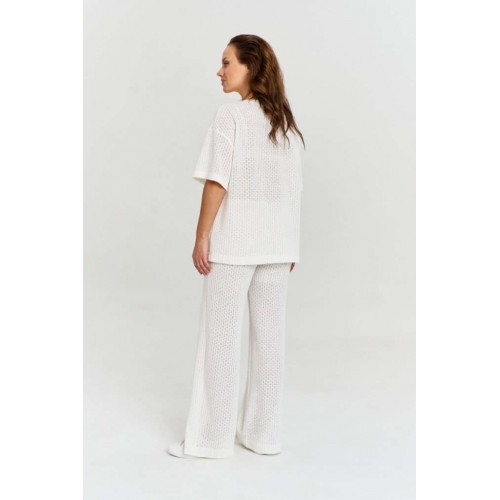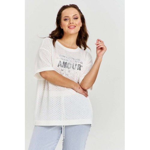 Джемпер из ажурного вискозного трикотажа, свободного силуэта, с коротким рукавом и круглой горловиной с декоративным довязом. На переде изделия авторский объемный принт.