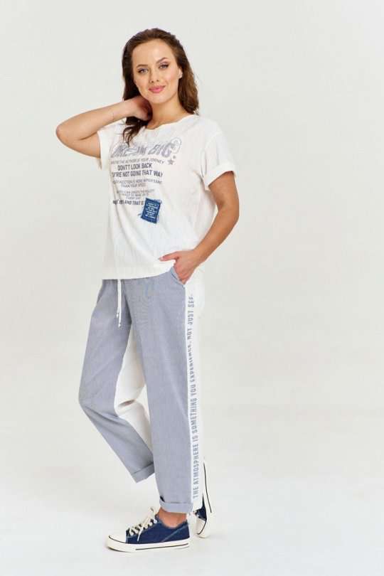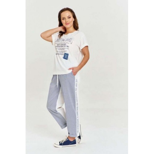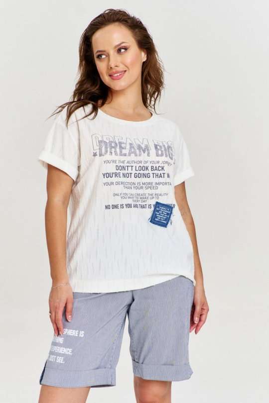 Футболка из вискозного трикотажа с фактурой "дырочки", свободного силуэта с коротким рукавом и круглой горловиной. На переде авторский принт и джинсовая нашивка с необработанным срезом.