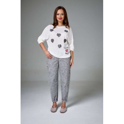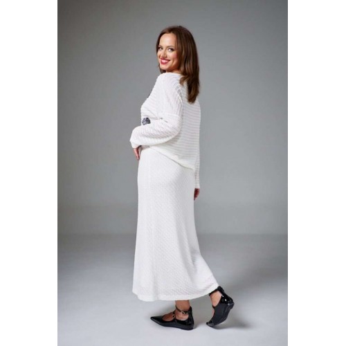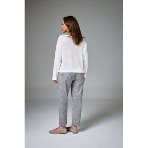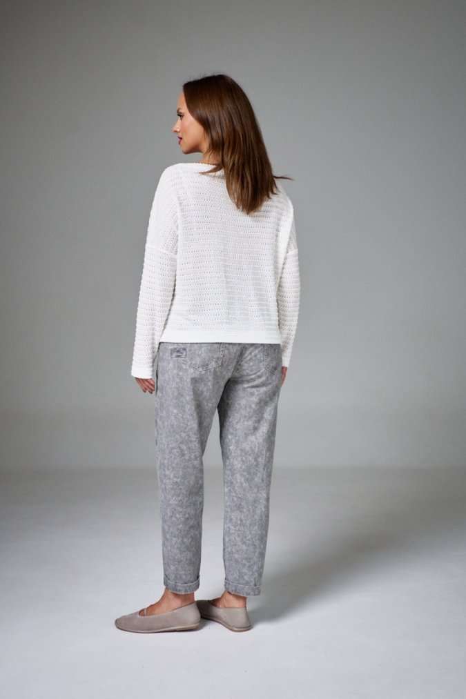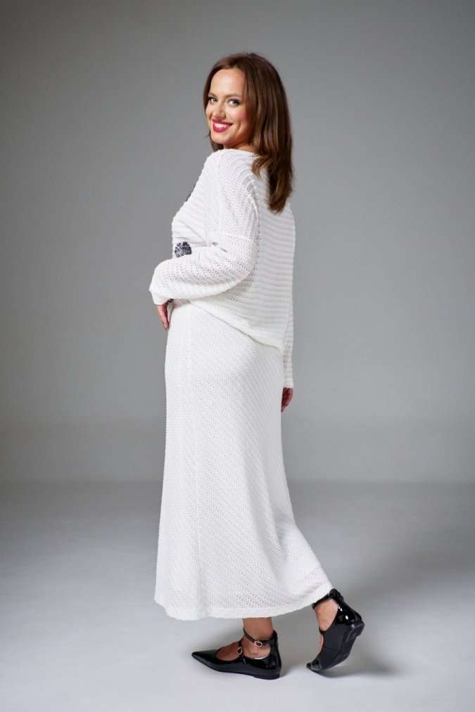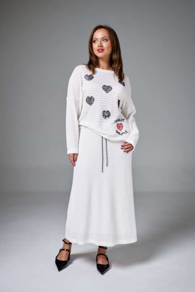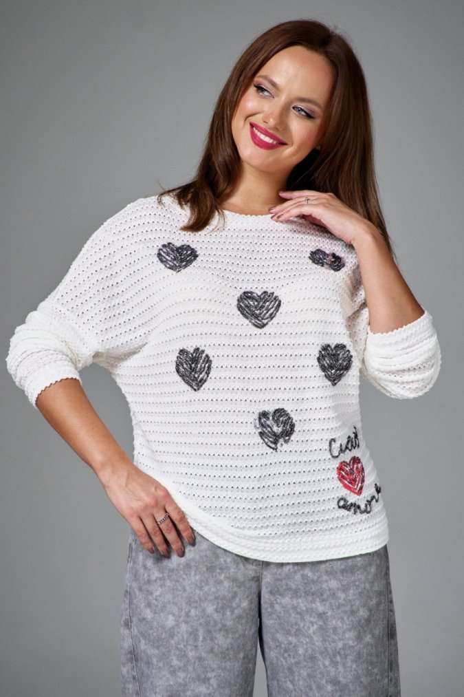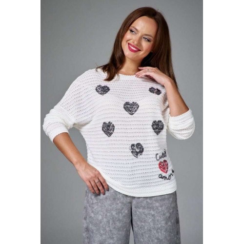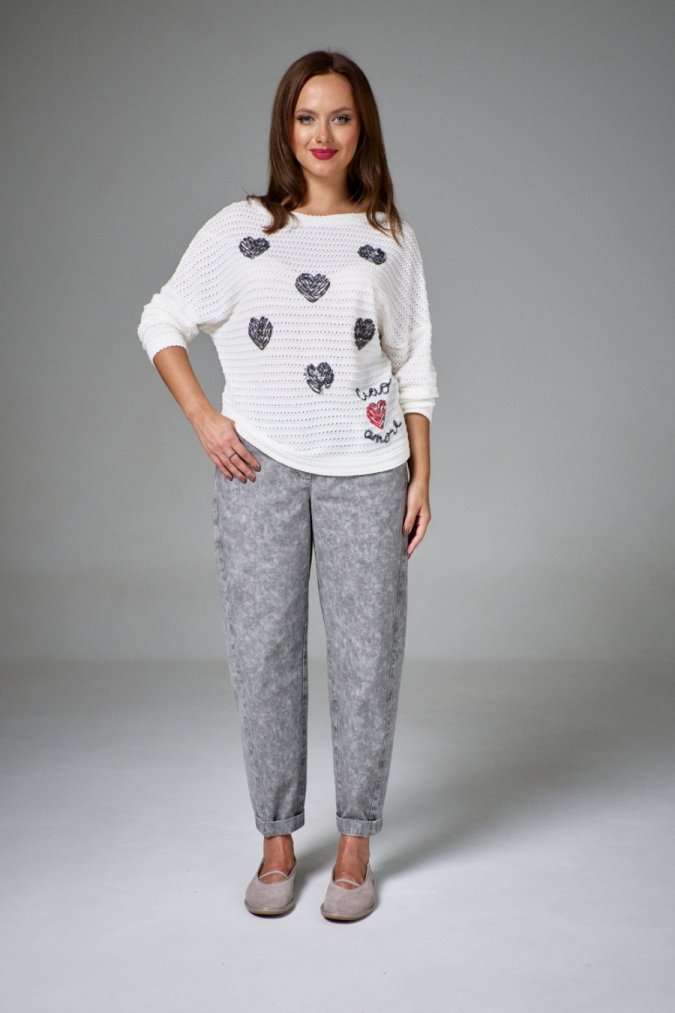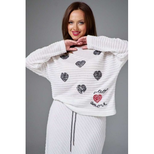 Джемпер из ажурного трикотажа, свободного силуэта, с длинным рукавом и горловиной "лодочка". Перед изделия декорированавторской вышивкой с применением пайеток и серебристых нитей.