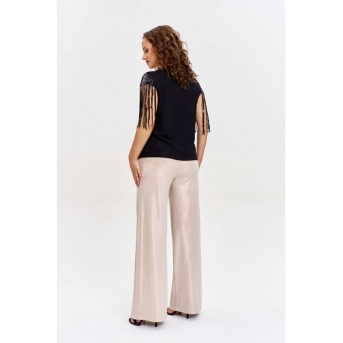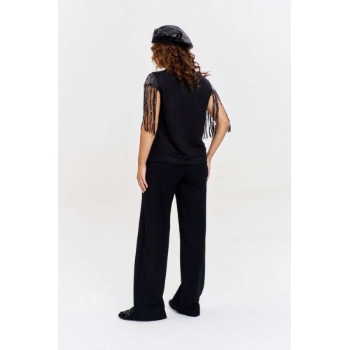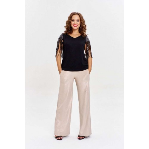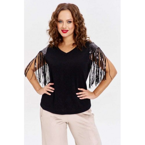 Джемпер из эластичного трикотажа с легким мерцанием, полуприлегающего силуэта, с коротким рукавом и V-образной горловиной. Рукава из сетки с пайетками с эффектной длинной бахромой.