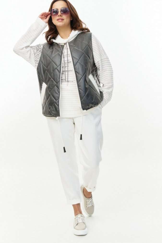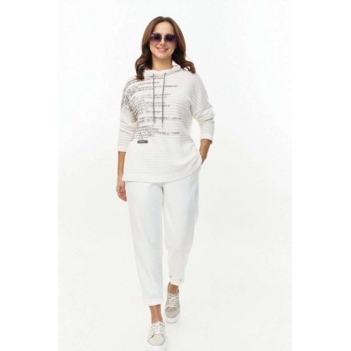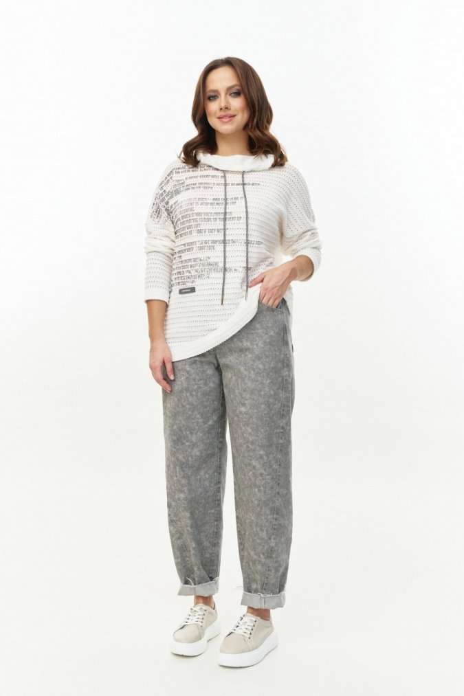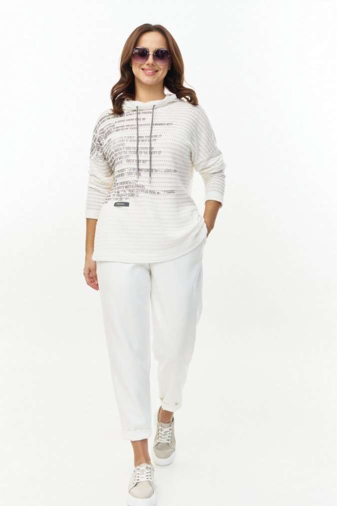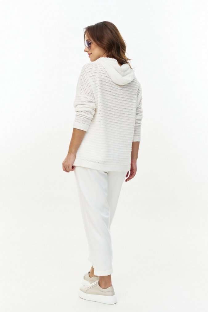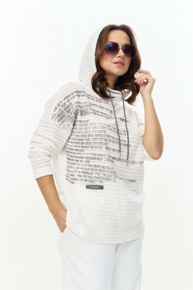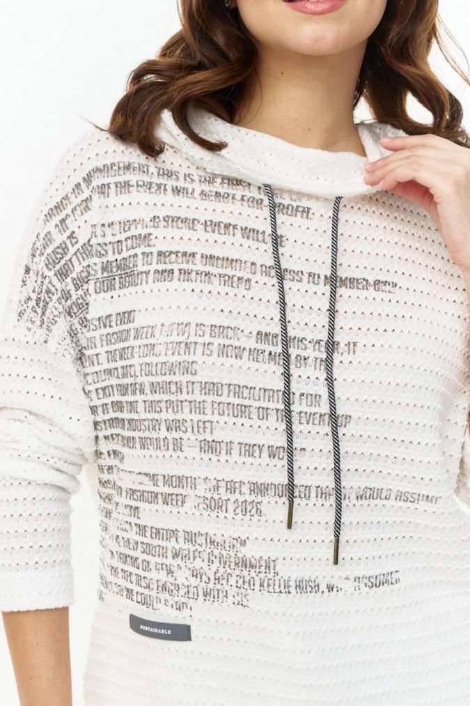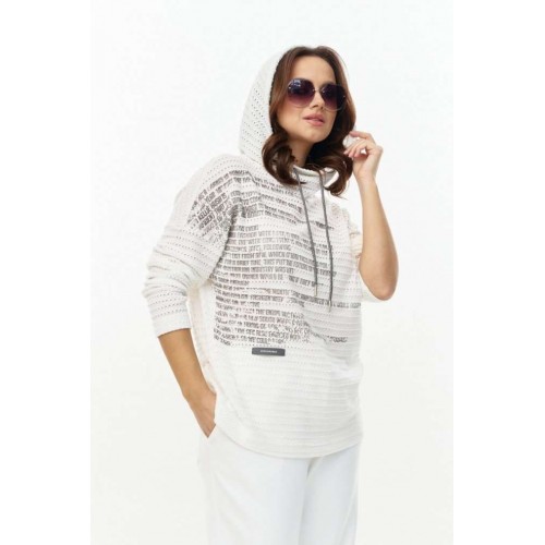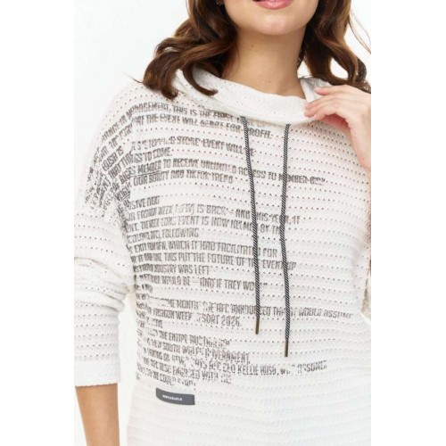 Джемпер из ажурного вискозного трикотажа, свободного силуэта, с капюшоном, переходящим в стойку спереди. Рукав длинный, линия плеча спущена. Перед декорирован авторским принтом. Капюшон с кулисой и шнуром.