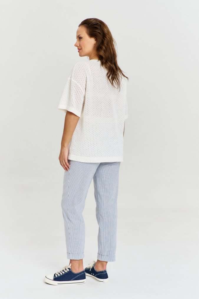 Супер комфортные брюки из стрейчевого материала в полоску, с четырьмя функциональными карманами, трикотажным поясом на резинке. Изделие декорировано авторскими нашивками.