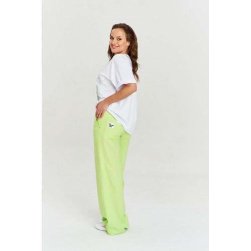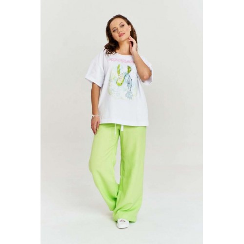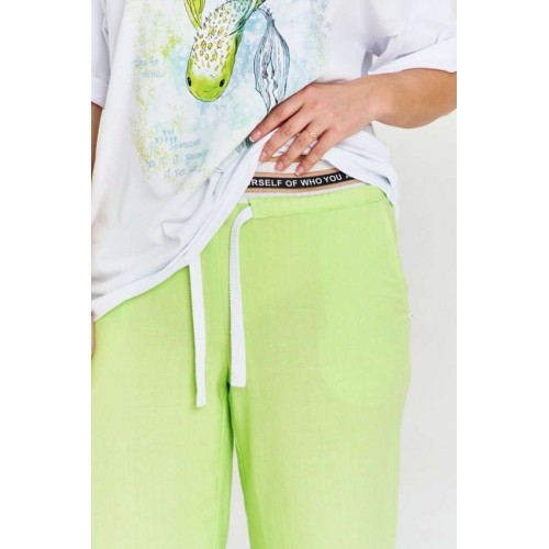 Брюки-палаццо из мягкого и пластичного льна с добавлением вискозы, с удобными боковыми карманами спереди и накладными сзади. Пояс - декоративная резинка и кулиса со шнуром. Изделие декорировано нашивкой и металлическими хольнитенами.
