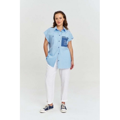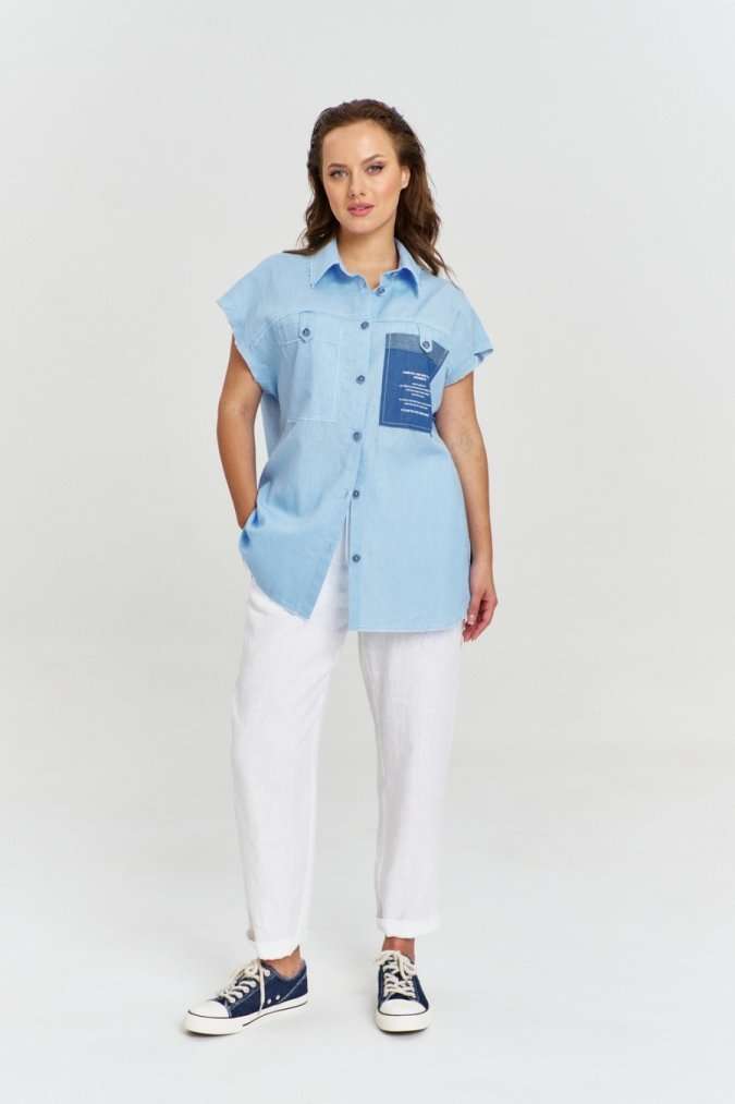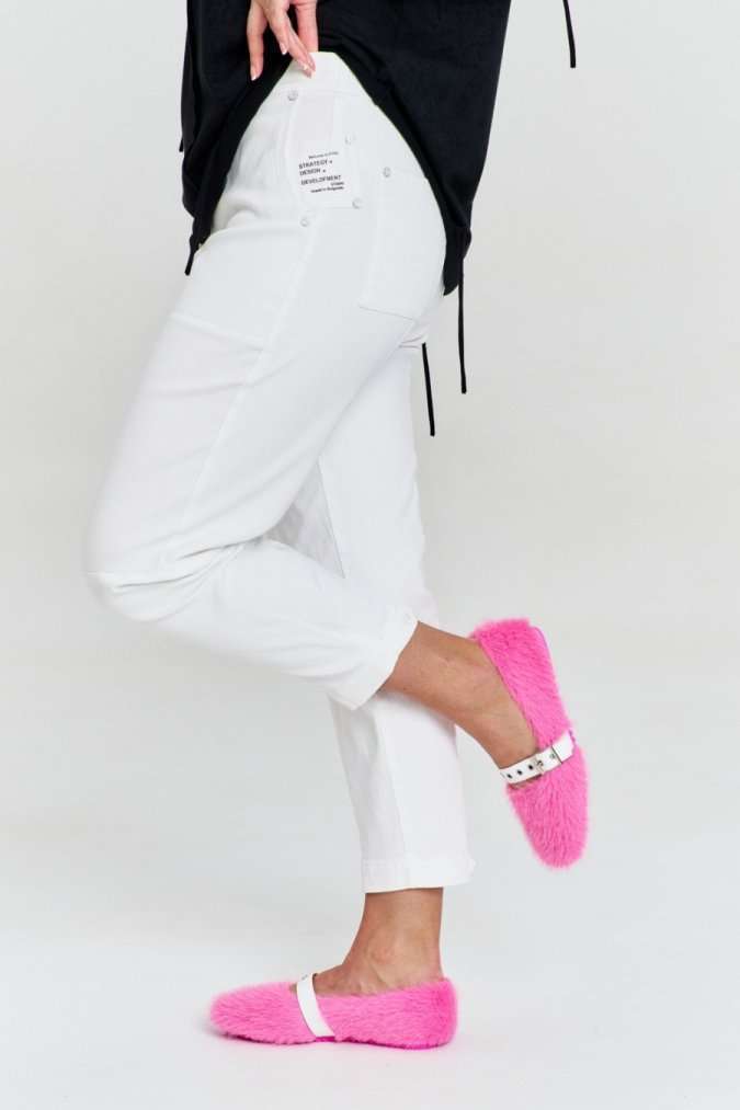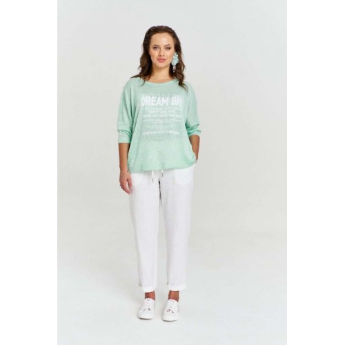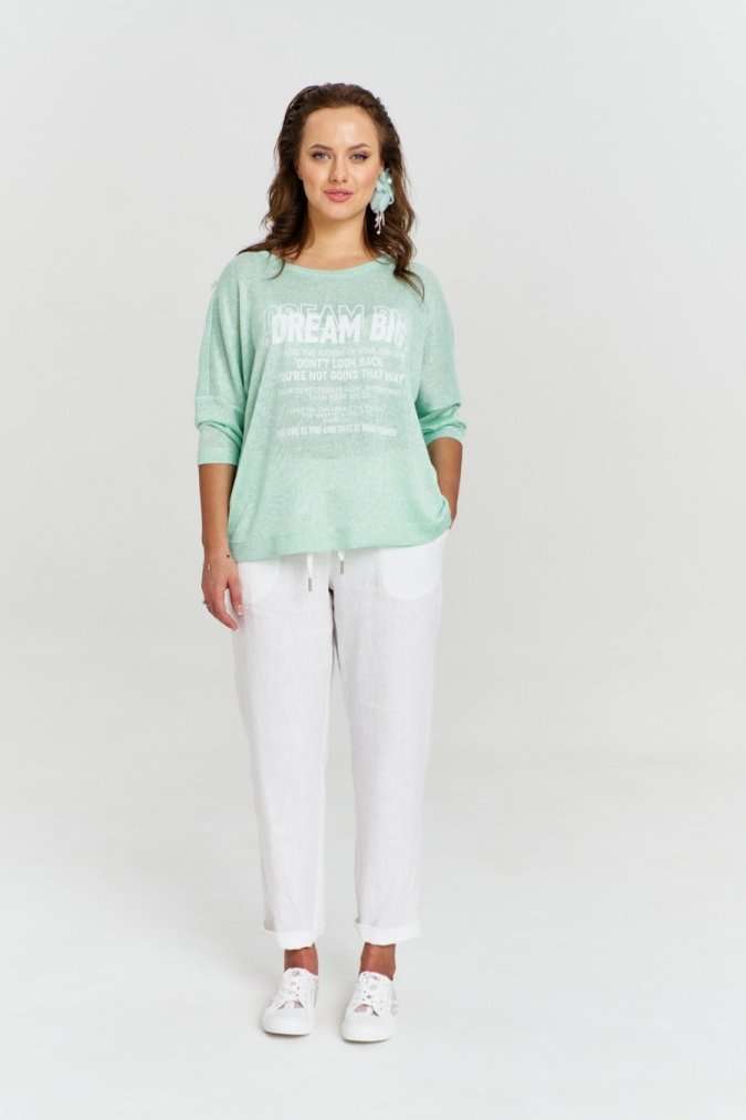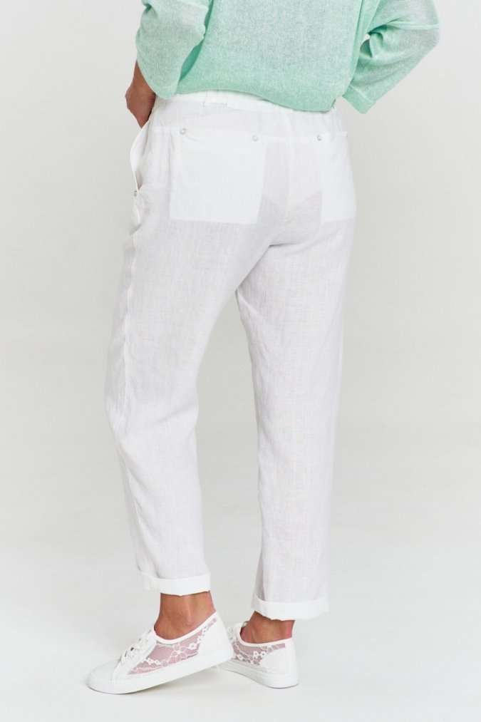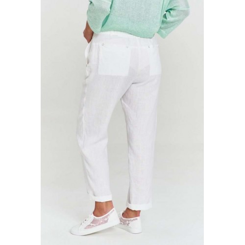 Брюки из 100% льна. Силуэтная форма - умеренные "бананы". Пояс с резинкой по спинке и декоративной кулисой с хлопковым шнуром. В брюках удобные боковые карманы спереди и накладные сзади. Изделие декорировано авторским принтом и металлическими хольнитенами.
