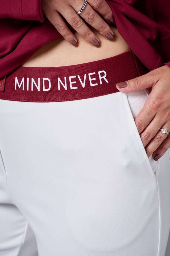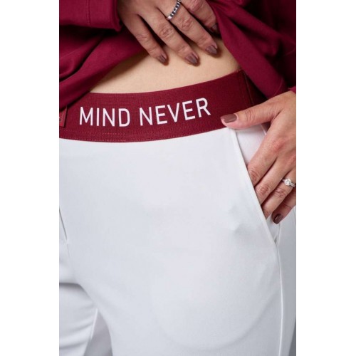 Брюки из плотного трикотажа с рубчиком, зауженные к низу, с боковыми карманами спереди и накладными сзади. Пояс - декоративная резинка со шрифтовым принтом. На отворотах низа брюк так же шрифтовой принт.
