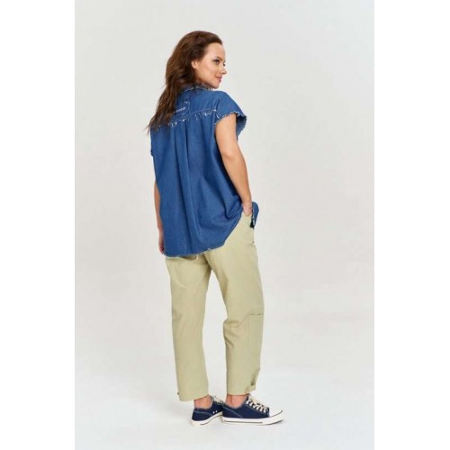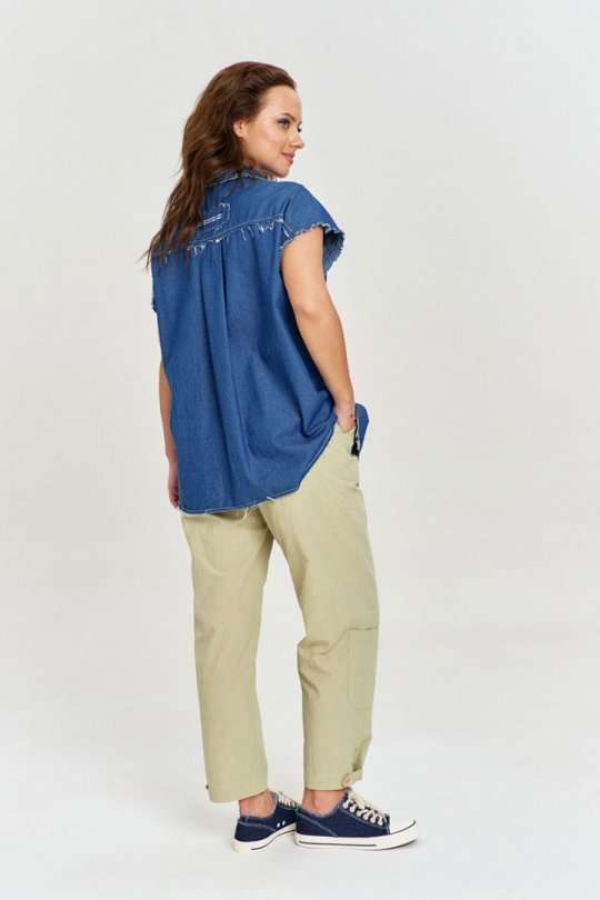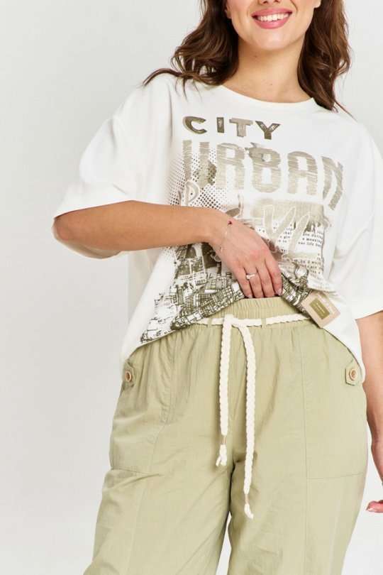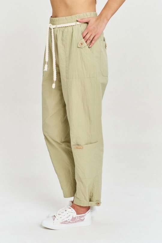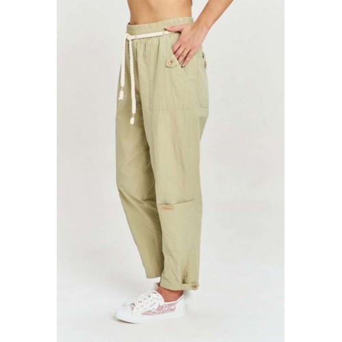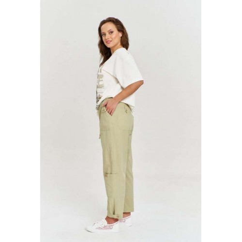 Брюки из 100% хлопковой ткани с легким крэш эффектом, свободного силуэта, зауженные к низу. В изделии шесть функциональных карманов, декорированных хлястиками с пуговицами. Пояс на резинке, с декоративным хлопковым шнуром. Ширина брюк внизу регулируется с помощью хлястика.