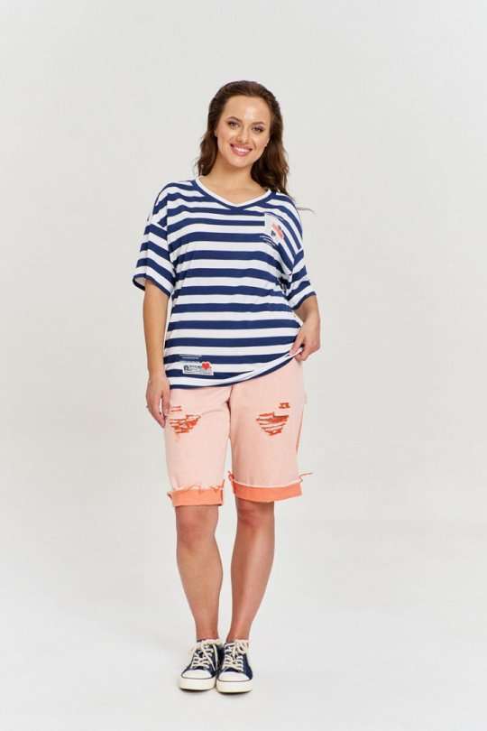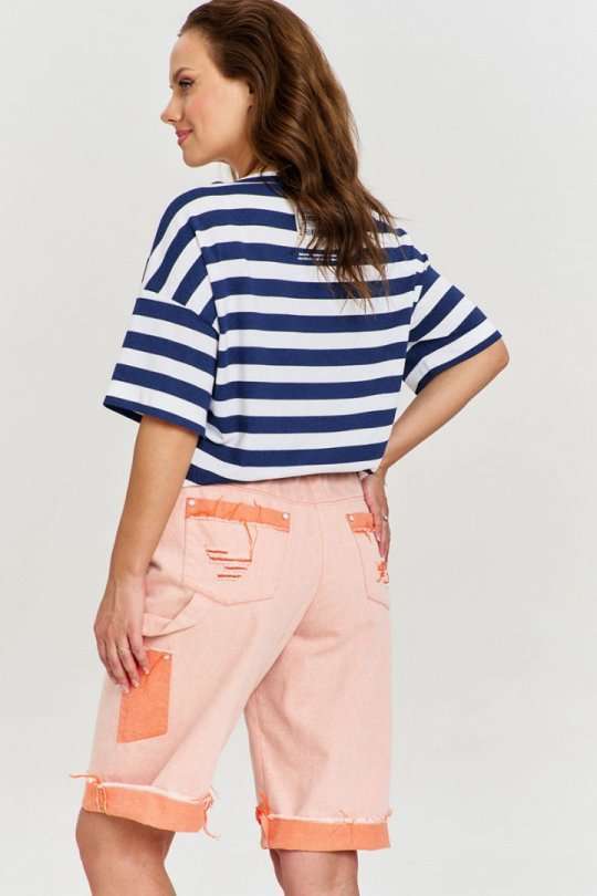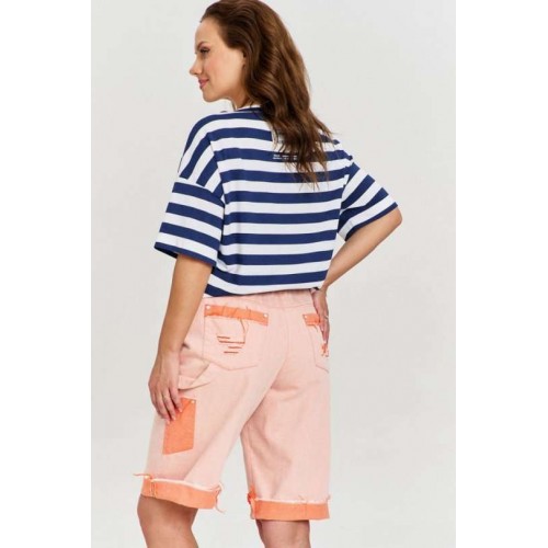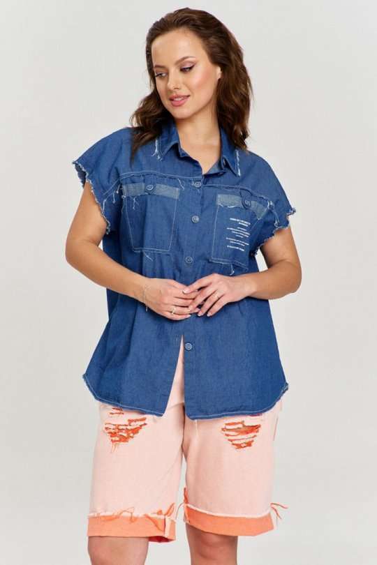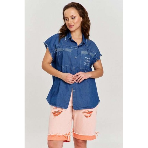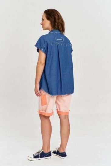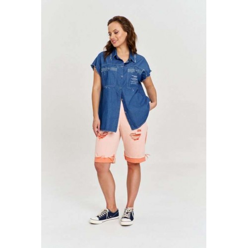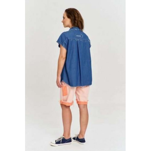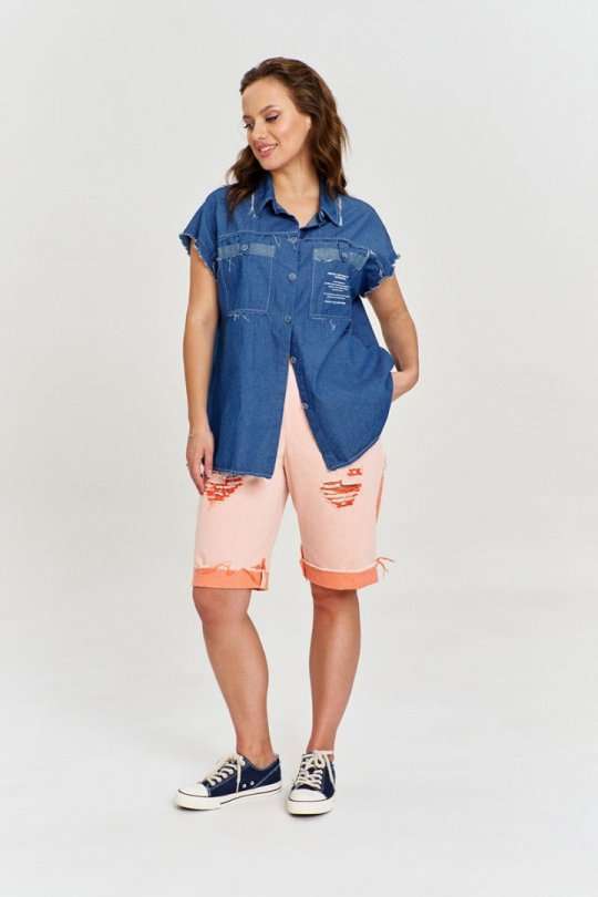 Шорты из двухстороннего хлопкового джинса, длиной до колена, с четырьмя функциональными карманами и двумя отделочными. Пояс с застежкой на пуговицу и резинкой. На шортах выполнены декоративные прорези. В изделии применяется энзимная стирка, придающая необработанным срезам и прорезям стильную вытрепанность и винтажность.