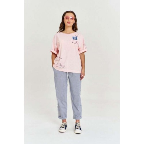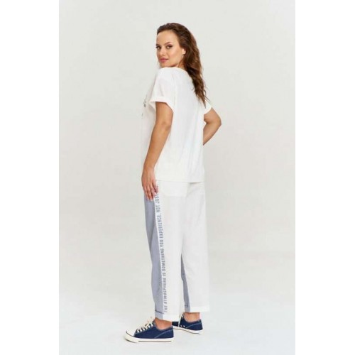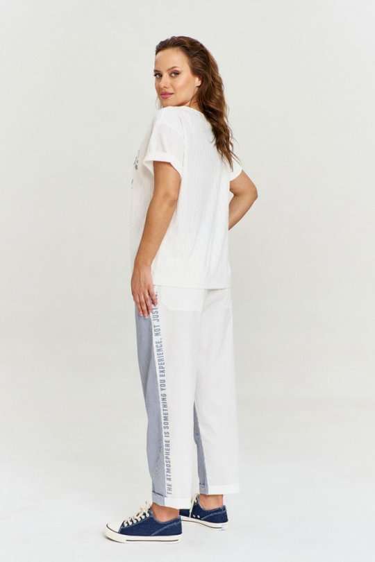 Брюки, силуэтной формы "бананы", выполнены из двух видов материала: задняя часть из хлопковой ткани цвета экрю, передняя из ткани в мелкую полоску. В изделии четыре функциональных кармана. Пояс широкий, на резинке, сс кулисой и шнуром. По бокам брюк шрифтовой авторский принт, эффектно сочетающий между собой два вида ткани.