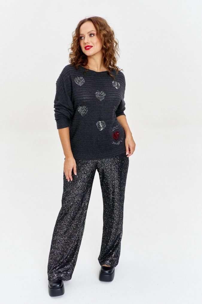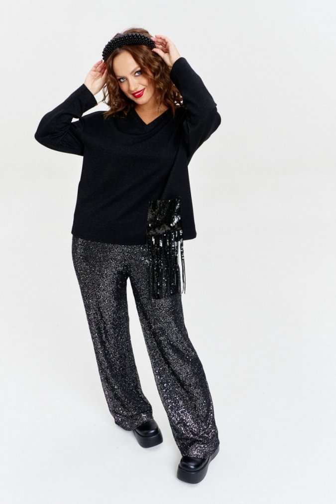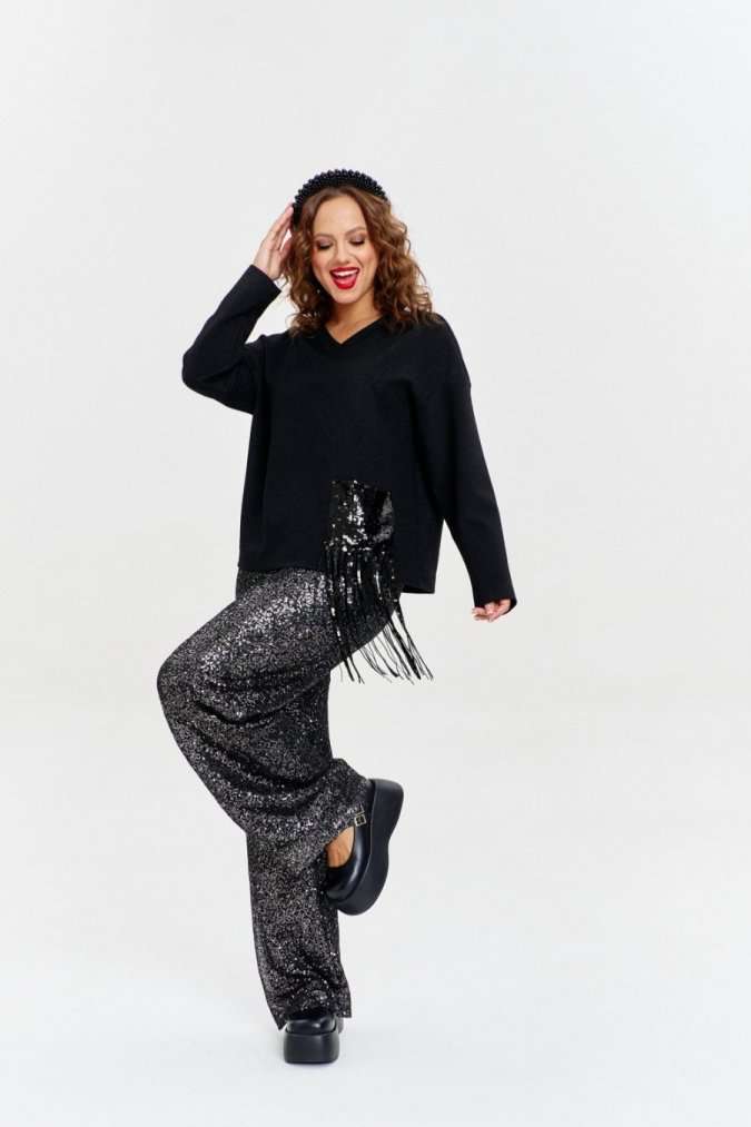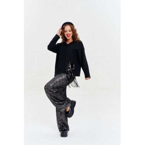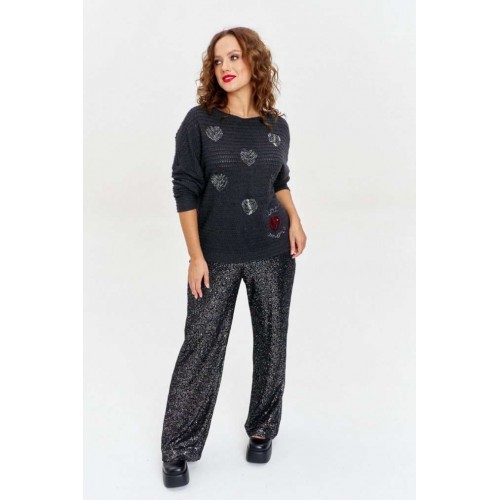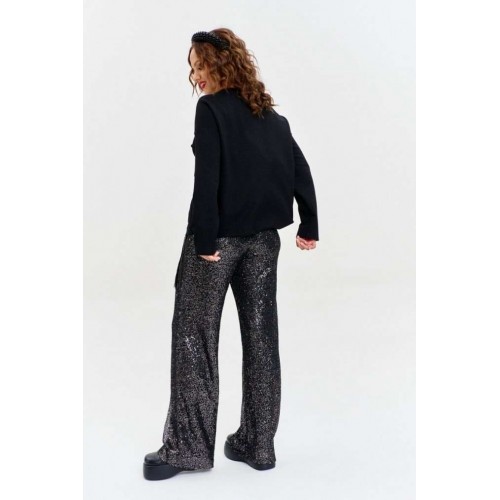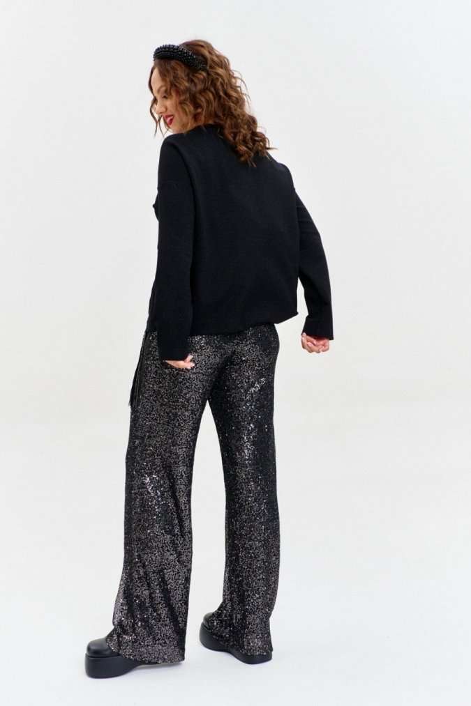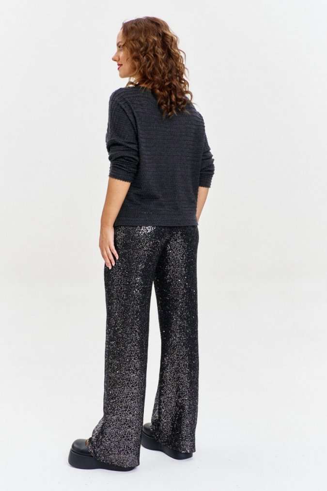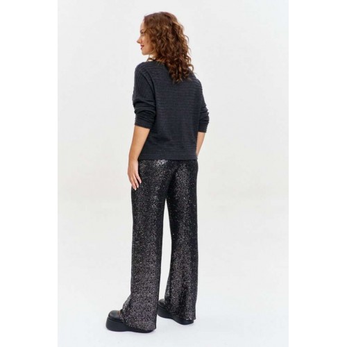 Эффектные брюки из хлопковой сетки с пайетками, прямого силуэта, с трикотажным поясом на резинке. По всей длине брюк мягкая трикотажная подкладка, что делает их невероятно комфортными.