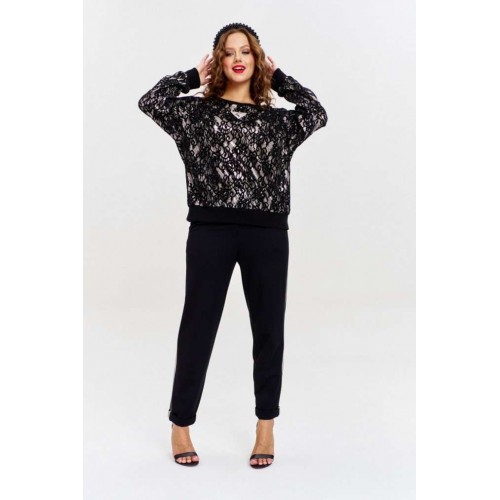Брюки из плотного трикотажа с рубчиком, зауженные к низу, с боковыми карманами спереди и накладными сзади. Пояс - декоративная резинка . По бокам брюк - золотистый лампас из ленты с пайетками.