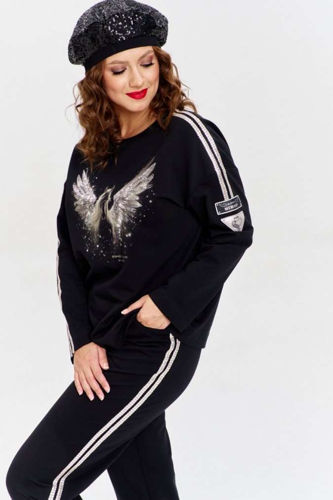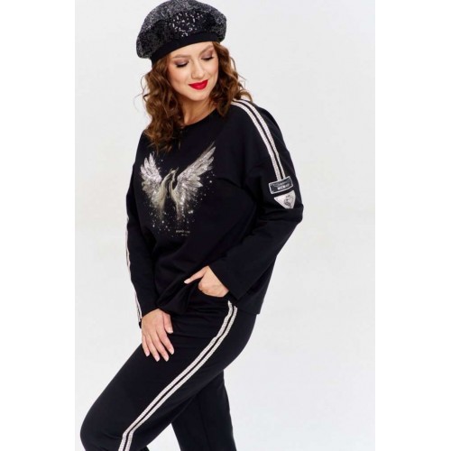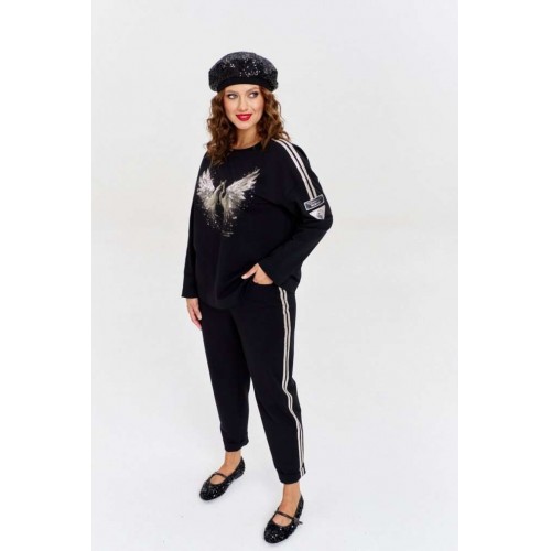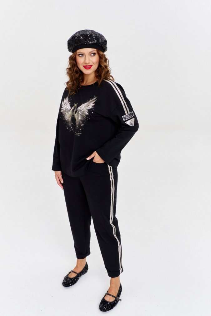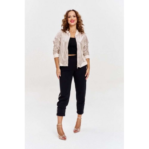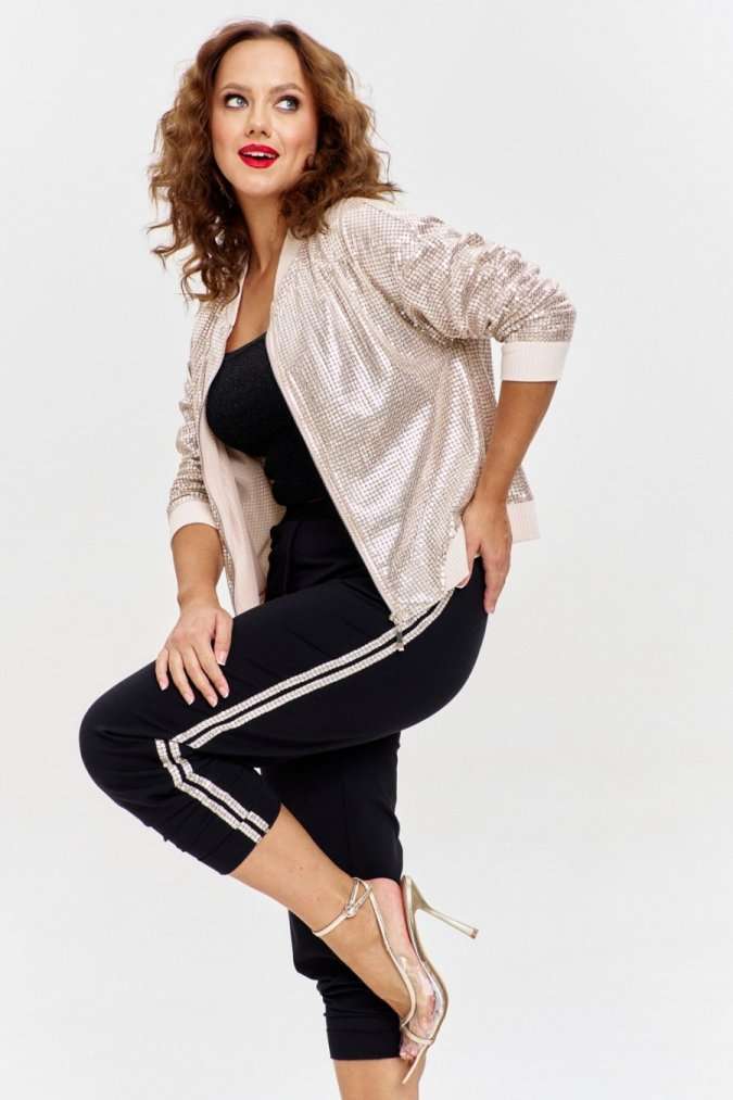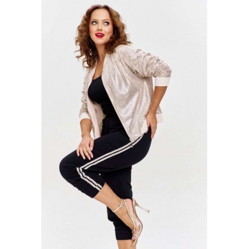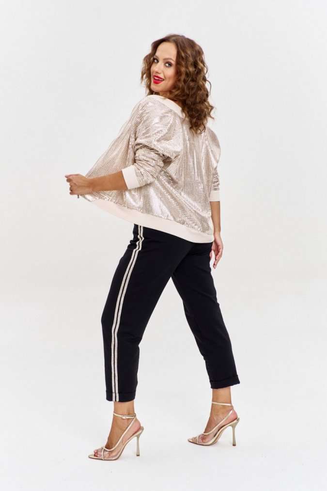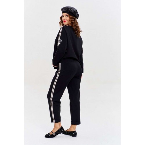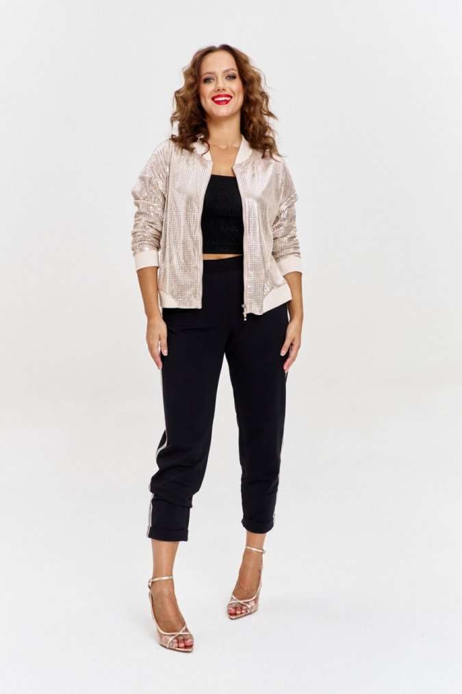 Джоггеры из футера двухнитки, зауженные к низу, с удобными боковыми карманами и поясом на резинке. По бокам золотистые лампасы из декоративной ленты с пайетками.