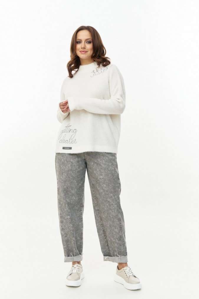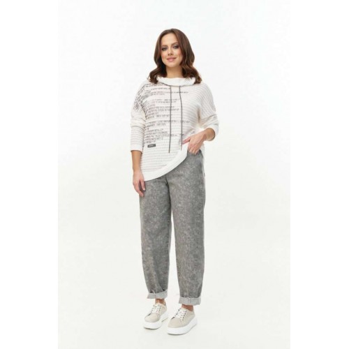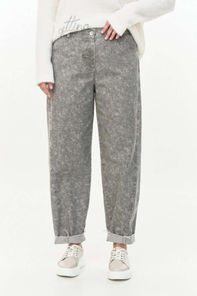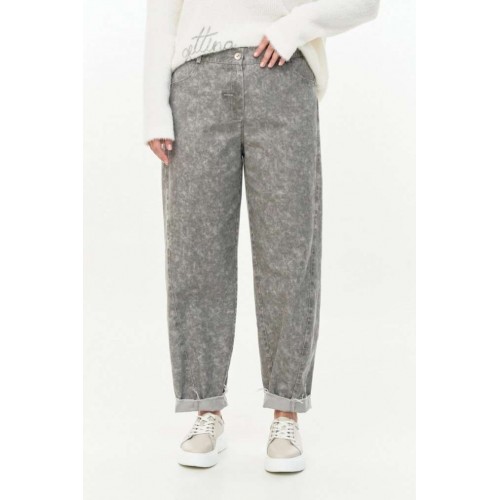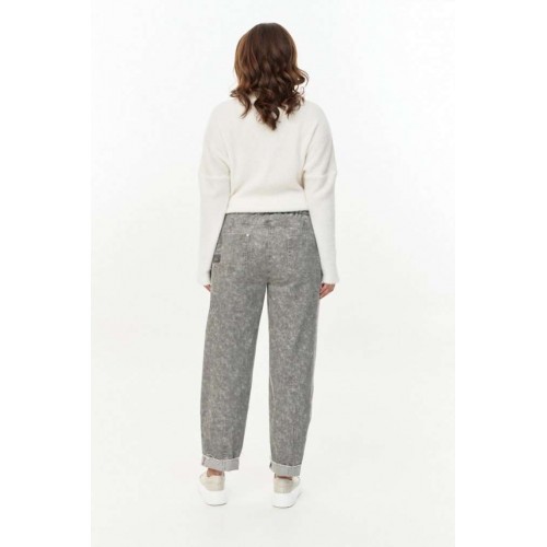 Джинсы из "мраморного" хлопка, с четырьмя функциональными карманами и поясом с резинкой на спинке. Боковые швы брюк переходят на перед. Изделие проходит энзимную стирку.