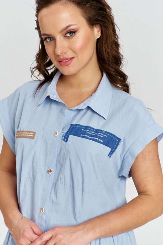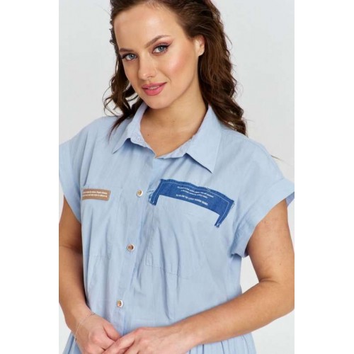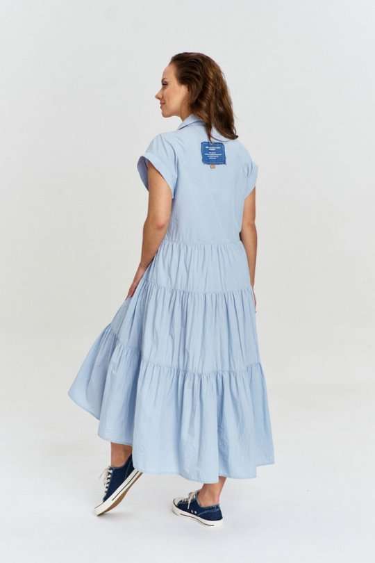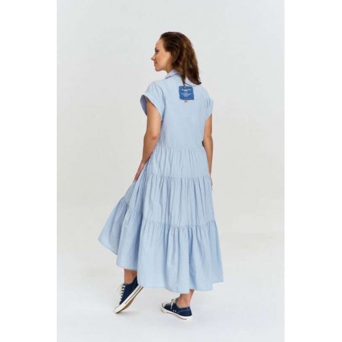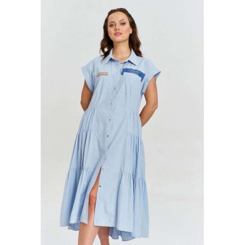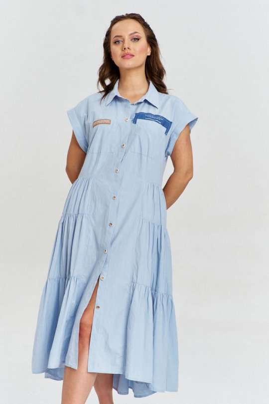Платье из 100% хлопка с легким крэш эффектом, длиной миди спереди и удлиненной спинкой, с застежкой на пуговицы по переду до низа и рубашечным воротником. Рукав короткий, цельнокроеный, с притачной манжетой. Платье отрезное по линии талии. Низ изделия - сосборенные воланы ярусами. На переде накладные карманы. Изделие декорировано авторскими джинсовыми нашивками с необработанными срезами