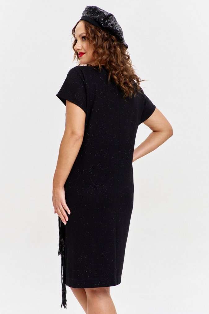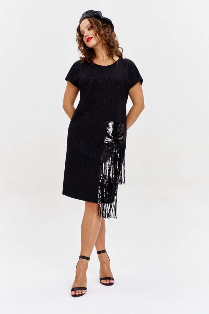 Платье из трикотажного полотна с эффектным мерцанием, прямого силуэта, со спущенным рукавом и круглой горловиной. Перед изделия с накладным карманом из пайеток с бахромой, каскадом спускающимся до низа изделия.