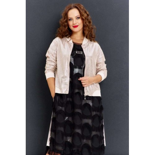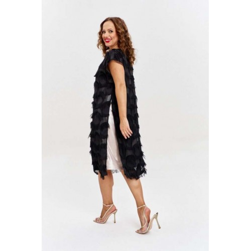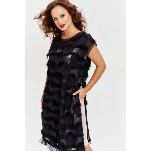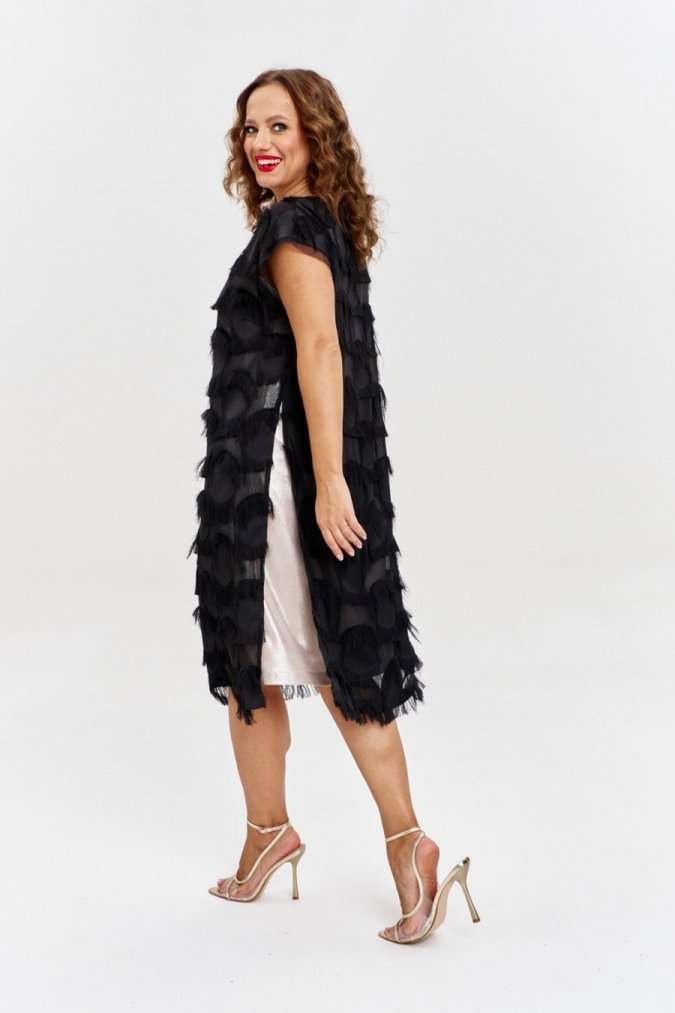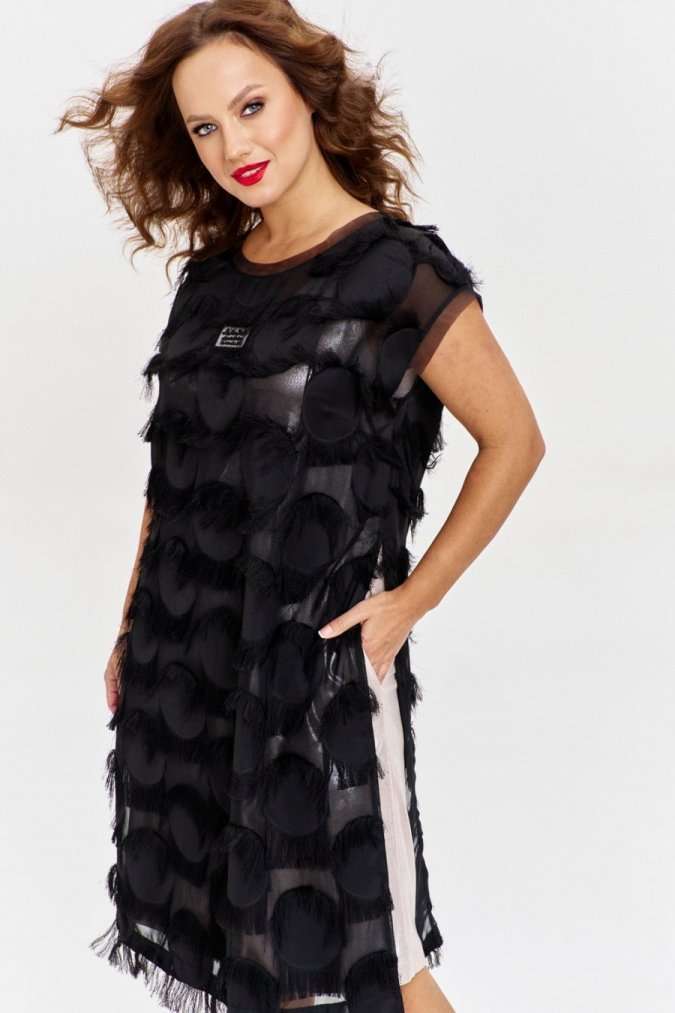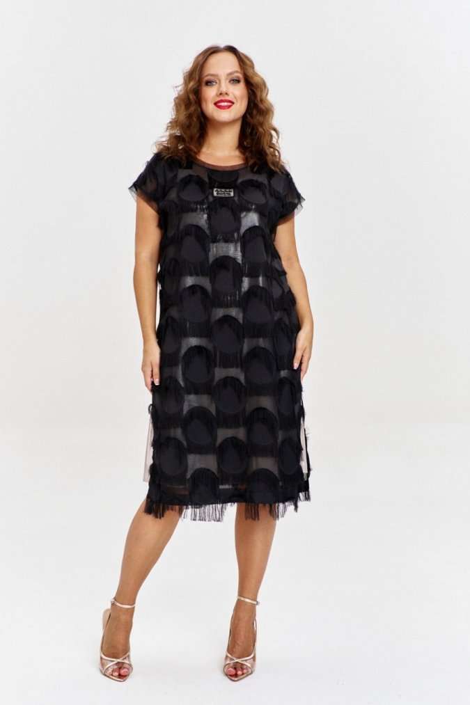 Двухслойное платье из жаккарда на шифоновой основе с бахромой, прямого силуэта, спущенным рукавом и круглой горловиной. По бокам высокие разрезы, на переде ажурная нашивка. Нижнее платье из золотистого трикотажа, без рукава, с карманами по бокам.