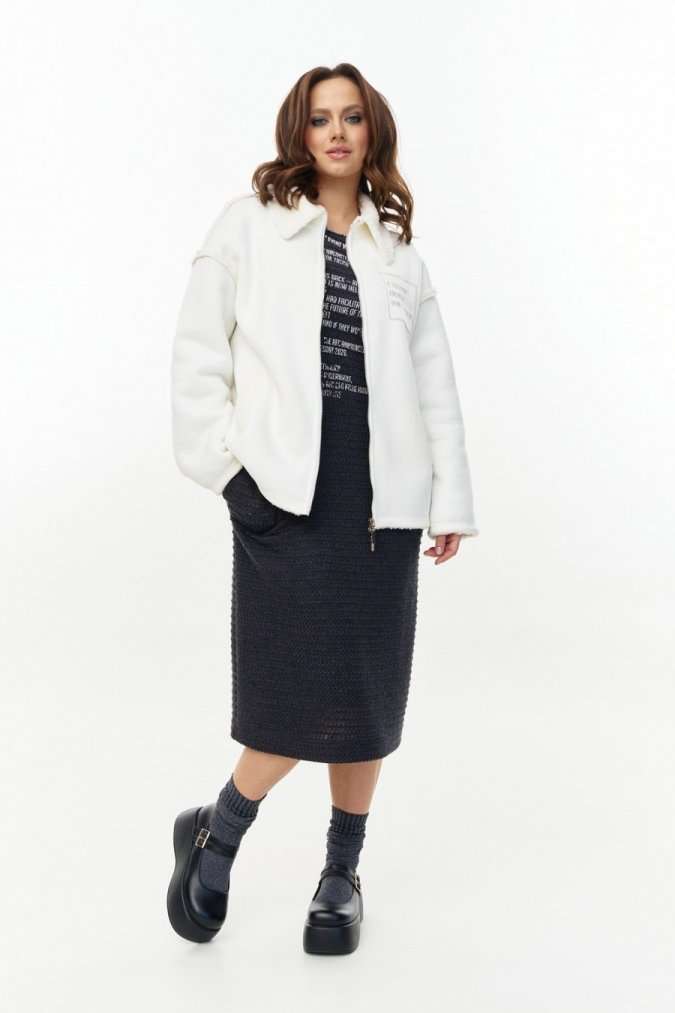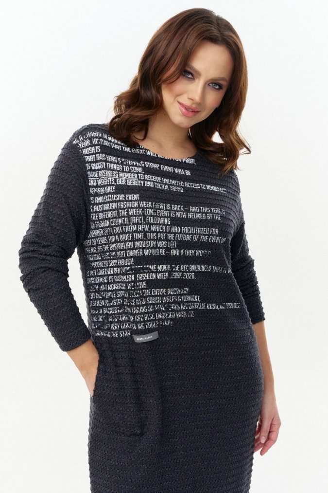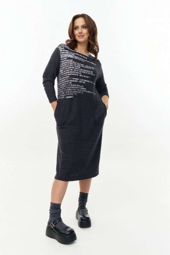 Платье из ажурного вискозного трикотажа, прямого силуэта с длинным рукавом, круглой горловиной и боковыми карманами. Перед декорирован авторским принтом. Изделие на трикотажной подкладке.