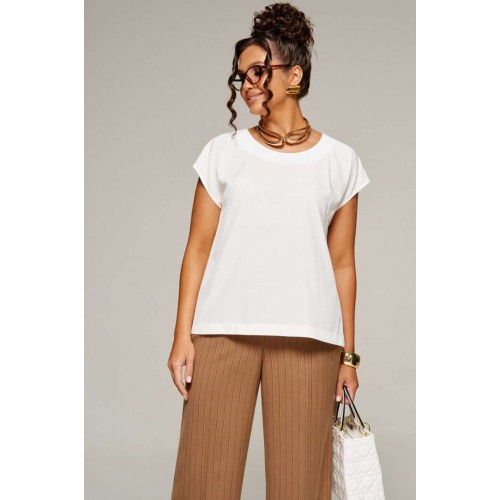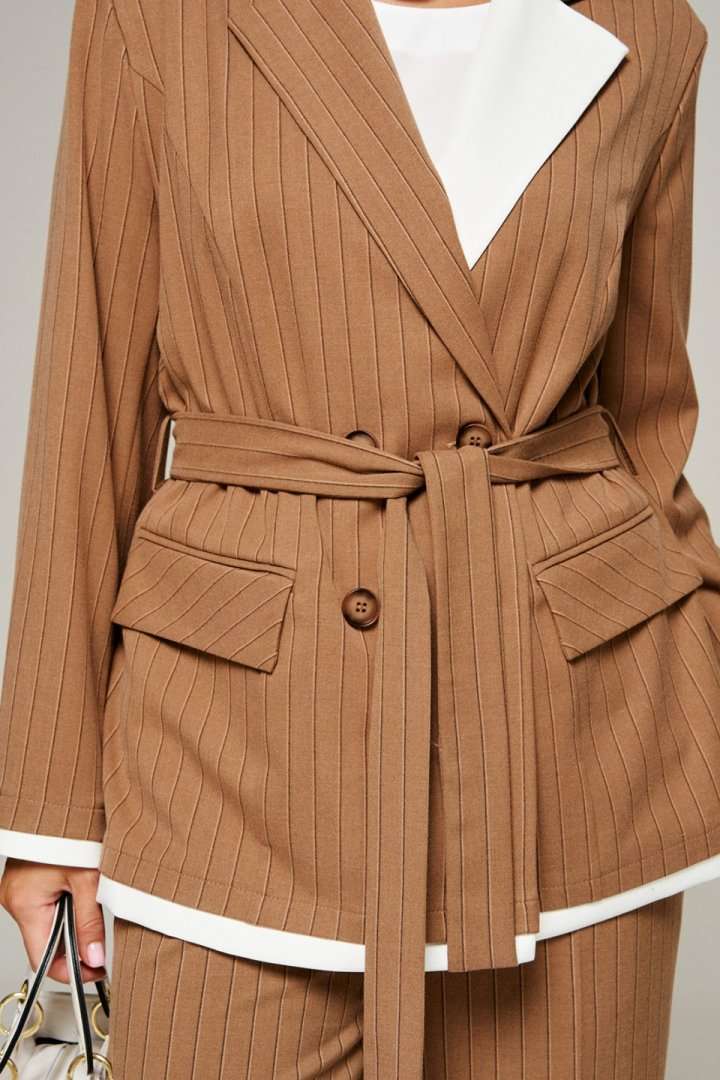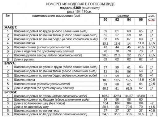 Деловой комплект 3-ка, состоящий из трех предметов: жакета, брюк и блузки. Блузка полуприлегающего силуэта. Горловина округлой формы. В боковых швах снизу разрезы. Перед цельный, с двумя нагрудными вытачками от бокового шва. Спинка разрезная по среднему шву с двумя вытачками на уровне талии. В верхней части среднего шва предусмотрен небольшой разрез с фиксацией на одну навесную петлю и пуговицу. Брюки классические прямые длинные. В верхней части брюк расположены функциональные карманы. Посадка стандартная высокая. Пояс притачной с резинкой по кругу. Жакет классический двубортный прямого силуэта длиной ниже бедер и с декоративными элементами в виде контрастных беек. К жакету прилагается пояс-завязка. Передняя часть с вертикальными рельефами от проймы и с прорезными боковыми карманами в рамку с клапаном. Спинка с центральным швом и с вертикальными рельефами от проймы. Рукав втачной двухшовный длинный. Воротник стояче-отложной с лацканами пиджачного типа. Низ борта прямой. Застёжка смещенная на две основные и одну потайную петли и пуговицы. Оригинальность модели придают контрастные левый лацкан и бейки по низу изделия и рукавам. Длина блузки (по середине спинки) ~ 61,5 см. Длина жакета (по середине спинки) – 70 см. Длина рукава жакета – 62 см. Длина брюк (по боковому с поясом) – 108 см
