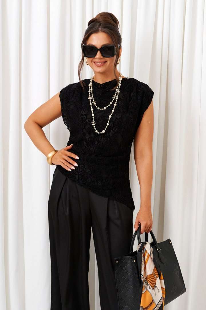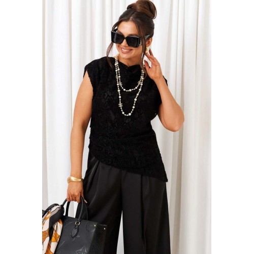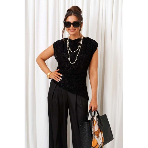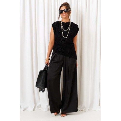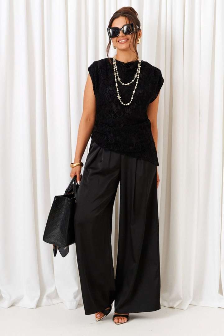 Брючный комплект в комбинации сияющего роскошного атласа с эффектным кружевом не останется незаметным! Блузон прилегающего силуэта асимметричного кроя выполнен из кружевного полотна на трикотажной основе. Блузон обработан мягкой трикотажной подкладкой. Передняя часть цельная с двумя вертикальными складками от каждого плечевого шва и двумя горизонтальными мягкими складками от правого бокового шва. Спинка цельная с двумя складками от бокового шва. Плечевая линия удлиненная, чуть приспущенная, мягко закрывающее плечо. Горловина легкой формы «качель». Застежка слева сбоку на потайную молнию. Брюки широкие фантазийного кроя со встречной складкой спереди от пояса. Высота посадки стандартная. В верхней части бокового шва предусмотрены функциональные карманы. Застежка боковая на потайную молнию слева. Задняя часть пояса на резинке, что придает изделию дополнительный комфорт при носке. Длина блузона (по середине спинки) – 66-67 см. Длина брюк (с поясом) – 108 см.