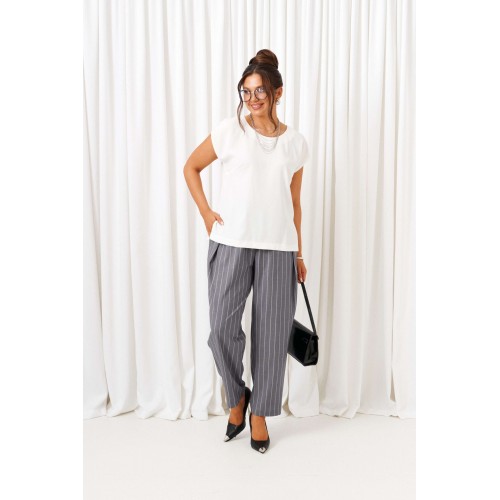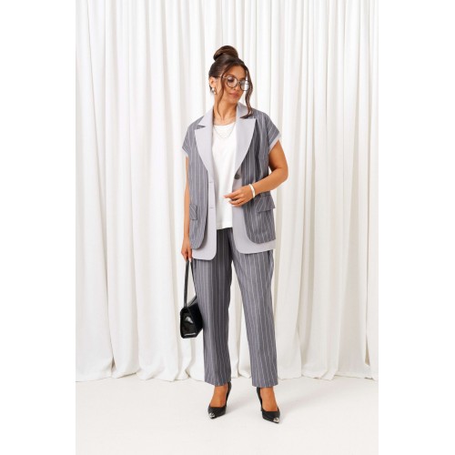 Брючный комплект в комбинации двух полотен компаньонов, дополненный лёгкой блузой не останется незаметным! Жилет полуприлегающего силуэта, имитирующий эффект двойного изделия, с цельнокроеным покроем рукава и удлиненной линией плеча, выполнен из костюмной ткани. Перед с нагрудными вытачками от бокового шва и боковыми накладными клапанами. Спинка со средним швом и вытачками на талии. Воротник отложной пиджачного типа с лацканами. Застежка центральная на две петли и пуговицы. Низ борта округлый. Центральная часть переда, спинка, воротник, лацканы, бейка рукава выполнены из отделочной ткани смежного тона. Брюки свободного силуэта прямые, с двумя верхними боковыми функциональными карманами. Высота сиденья классическая. Застежка центральная на молнию и петлю с пуговицей на поясе. Брюки на поясе, в задней части которого для удобного прилегания по талии вставлена резинка. Блузка полуприлегающего силуэта. Перед цельный, с двумя нагрудными вытачками от бокового шва. Спинка разрезная по среднему шву, в верхней части которого предусмотрен небольшой разрез для застежки на одну навесную петлю с пуговицей; с вытачками на талии. Горловина округлой формы. В боковых швах выполнены разрезы. Длина жилета (по середине спинки) ~ 73 см. Длина рукава жилета (+ плечо) ~ 27,5 см. Длина брюк (по боковому шву с поясом) ~ 108 см. Длина топа (по среднему шву спинки) ~ 60 см.