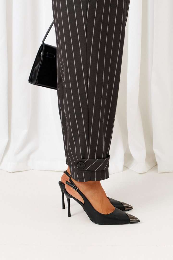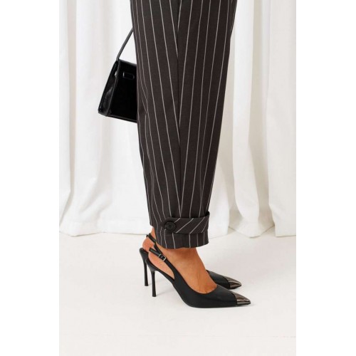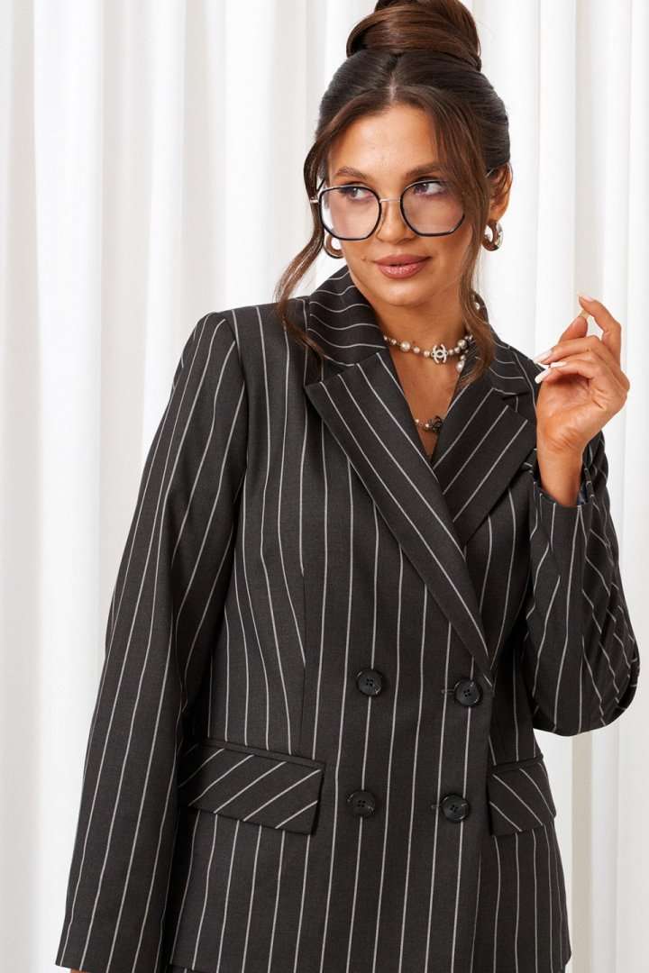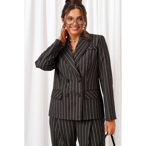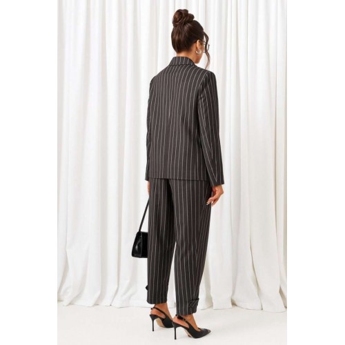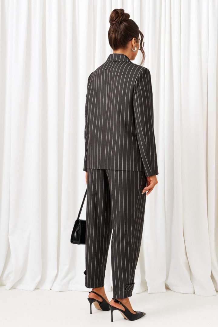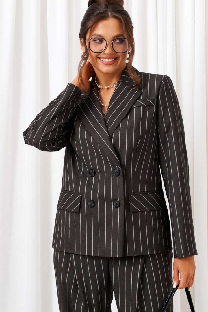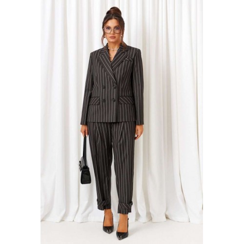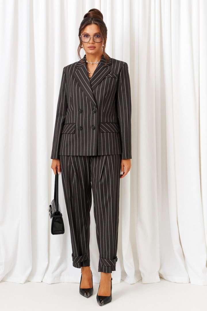 Брючный костюм из изысканного полотна в полоску идеально подходит для торжественных случаев и не только. Оба изделия можно смело комбинировать по отдельности с другими вещами Вашего гардероба. Элегантный костюм состоит из 2-х предметов одежды: жакета и брюк. Выполнен из костюмного полотна с содержанием натуральной вискозной нити классического рисунка в полоску. Жакет полуприлегающего силуэта двубортный, на подкладке. Перед с подрезом на талии, с функциональным боковым карманом с клапаном от него. Слева вверху расположена листочка. Спинка со средним швом и с вертикальными рельефами от проймы. Рукав двухшовный втачной длинный. Воротник стояче-отложной пиджачного типа с лацканами. Застежка смещенная на видимые прорезные петли и пуговицы, а также на дополнительную потайную петлю с пуговицей. Низ борта ровный. Брюки свободные, расширенного силуэта вверху и слегка зауженные к низу. С верхними наклонными глубокими складками и с двумя верхними боковыми карманами. Низ брюк оформлен декоративными патами с пуговицей. Высота сиденья стандартная. Застежка центральная на молнию и на петлю с пуговицей на поясе. Брюки на притачном поясе, в задней части которого для удобного прилегания по талии вставлена резинка.