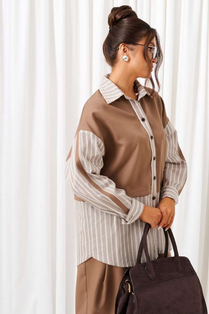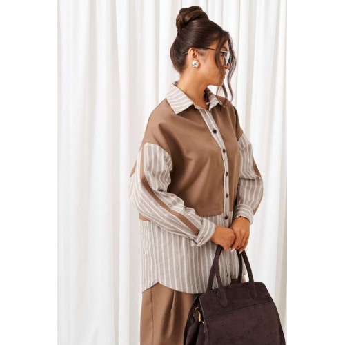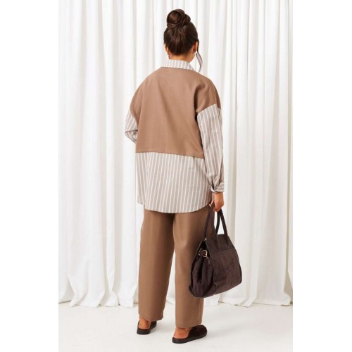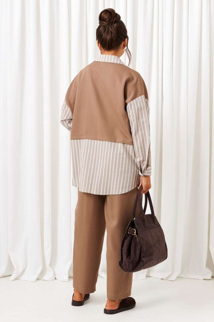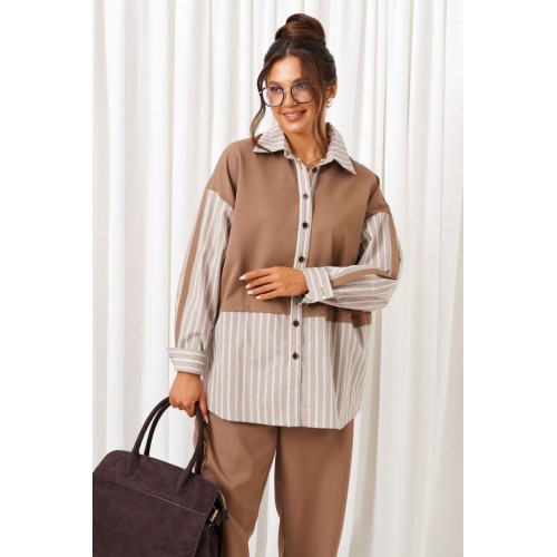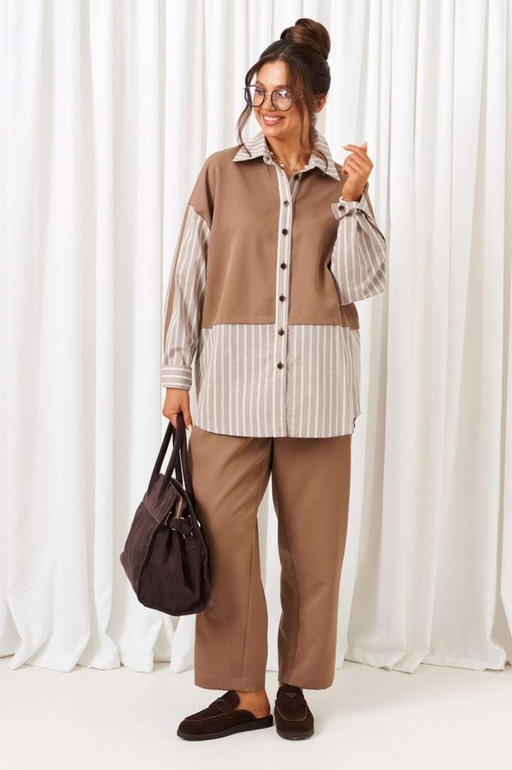 Стильный повседневный женский комплект в винтажном стиле, дополненный акцентными деталями, весьма актуален в будущем сезоне. Предметы комплекта можно смело комбинировать по отдельности с другими вещами гардероба. Комплект состоит из 2-х предметов одежды: рубашки и брюк. Выполнен из костюмной и рубашечной тканей стильного актуального дизайна с содержанием натуральных волокон. Брюки и верхняя часть, имитирующая жилет, из костюмного полотна. Нижняя часть из хлопковой ткани «в полоску». Рубашка прямого силуэта свободного кроя с удлиненной линией плеча. Перед из симметричных деталей, члененных чуть ниже талии. Спинка цельная по середине, но повторяет горизонтальным членением перед. Рукав рубашечный двухшовный полной длины с мягкими складками по низу от притачной манжеты, с возможностью отворота. По центральному верхнему шву располагается отделочная деталь из ткани компаньона. Манжет застегивается на две пуговицы. Застежка передняя центральная на прорезные петли и пуговицы по притачной отделочной планке. Воротник рубашечный стояче-отложной на отрезной стойке. Низ слегка округлой формы с поднятием к боковым участкам. Брюки прямого силуэта свободные вверху и слегка зауженные внизу, длиной до щиколотки, с двумя верхними боковыми карманами и двумя заложенными глубокими складками от пояса спереди. Высота сиденья классическая. Застежка центральная на молнию и на петлю с пуговицей на поясе. Брюки на притачном поясе, в задней части которого для удобного прилегания по талии вставлена резинка. Длина рубашки (по середине спинки) ~ 78 см. Длина рукава рубашки ~ 51 см. Длина брюк с поясом ~ 96 см.