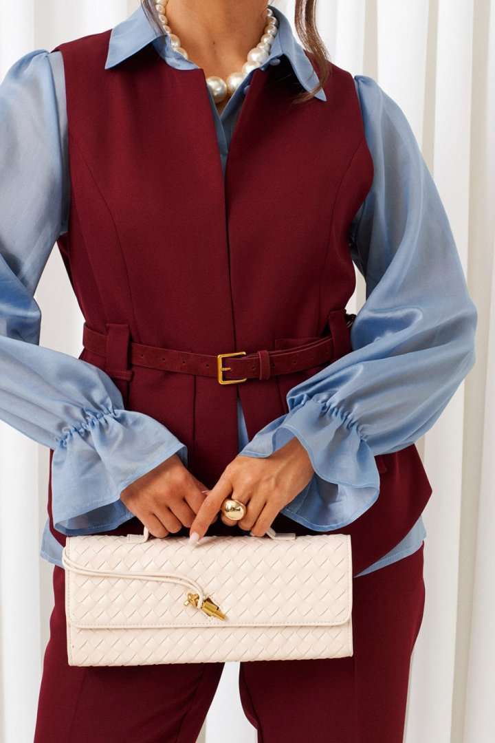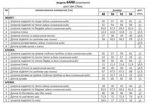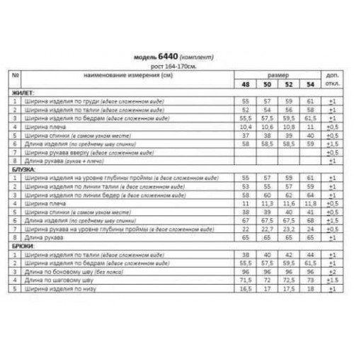 Деловой комплект 3-ка, состоящий из трех предметов: блузки, брюк и жилета. Жилет и брюки выполнены из костюмно-смесового полотна с нежной бархатистой поверхностью, приятной на ощупь и отличительно красивого внешнего вида актуальных оттенков. Блузка рубашечного типа выполнена из легкой, струящейся вуальной ткани. Передняя часть блузки с двумя нагрудными вытачками. Спинка цельнокроеная. Низ ровный. Рукав длинный одношовный, втачной. Нижний край рукава декоративный с кулисой на эластичной тесьме. Застежка центральная на петли и пуговицы. Воротник рубашечный, на стойке. Брюки классической посадки, со складками от пояса. Пояс широкий, сзади вставлена резинка. В верхней части брюк расположены функциональные карманы. Застежка центральная на молнию и на две петли и пуговицы на поясе. Жилет полуприлегающего силуэта, без застежки. На подкладке. Передняя часть с вертикальными рельефами от проймы, с накладными карманами фантазийной формы и декоративными патами, фиксируемые шлевками на карманах. Спинка разрезная по среднему шву. Горловина округлой формы. Низ жилета неровный (спереди длиннее, чем сзади). В комплекте предусмотрен пояс из экозамши шириной 2,5 см. с декоративной металлической пряжкой. Длина блузки (по среднему шву спинки) – 67,5 (+1) см. Длина рукава (блузка) – 65 (+1) см. Длина жилета (по среднему шву спинки) – 58,5 (+1) см. Длина брюк (по боковому шву с поясом) – 100(+1) см.