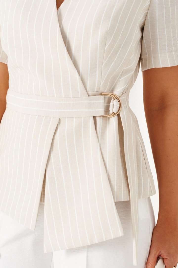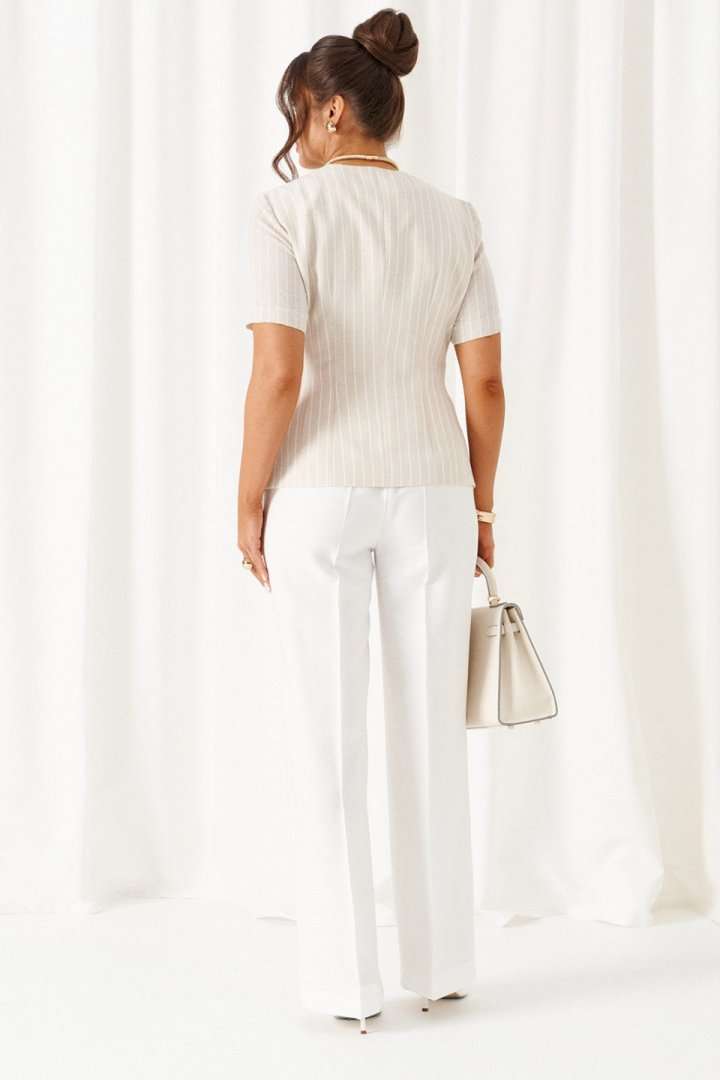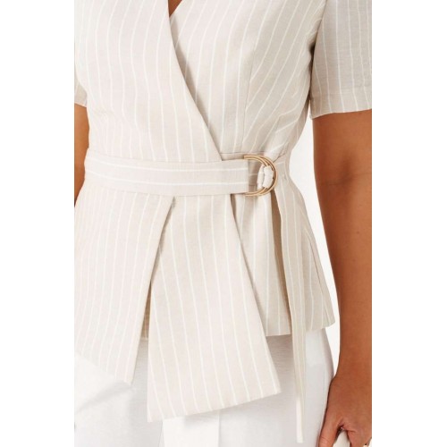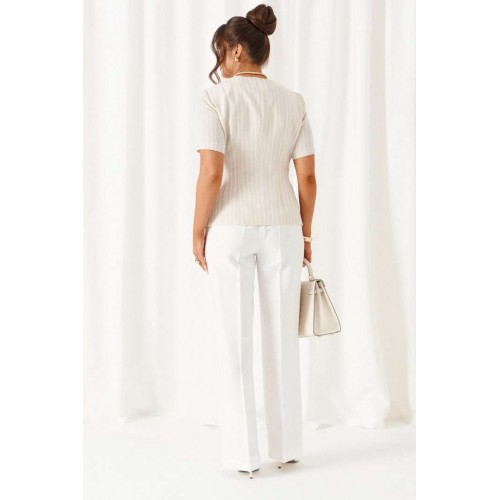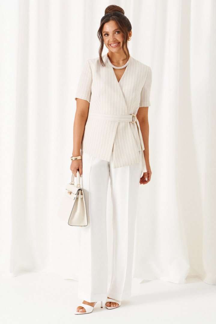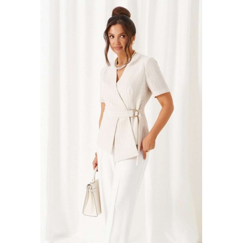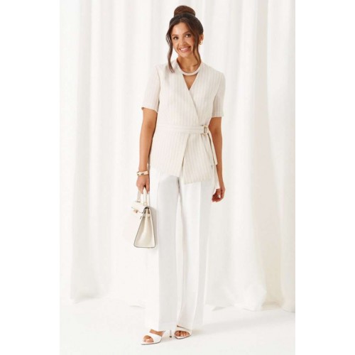 Комплект женский 2-ух предметный: жакет и брюки в деловом стиле. Выполнен из льняного полотна с содержанием вискозной нити. Жакет прилегающего силуэта на подкладке. Передняя часть с горизонтальным подрезом в виде декоративного пояса. Верхняя часть переда с двумя боковыми рельефами и дополнительными вытачками на уровне талии. Нижняя часть переда с декоративными подрезными вставками. Спинка разрезная по среднему шву и с дополнительными вытачками на линии талии и горловины. V- образный вырез горловины. Рукав короткий втачной одношовный. Застежка двубортная на декоративные пряжку в виде полуколец и пояс, и потайные петлю и пуговицу. Брюки классические, свободные с боковыми подрезами, имитирующими карманы. Посадка классическая. В задней части пояса для удобства использования вставлена резинка. Застежка центральная на молнию и петлю с пуговицей на поясе. Длина жакета (по среднему шву спинки) – 60 см. Длина рукава – 26,5 см. Длина брюк (по боковому шву с поясом) –108 см.