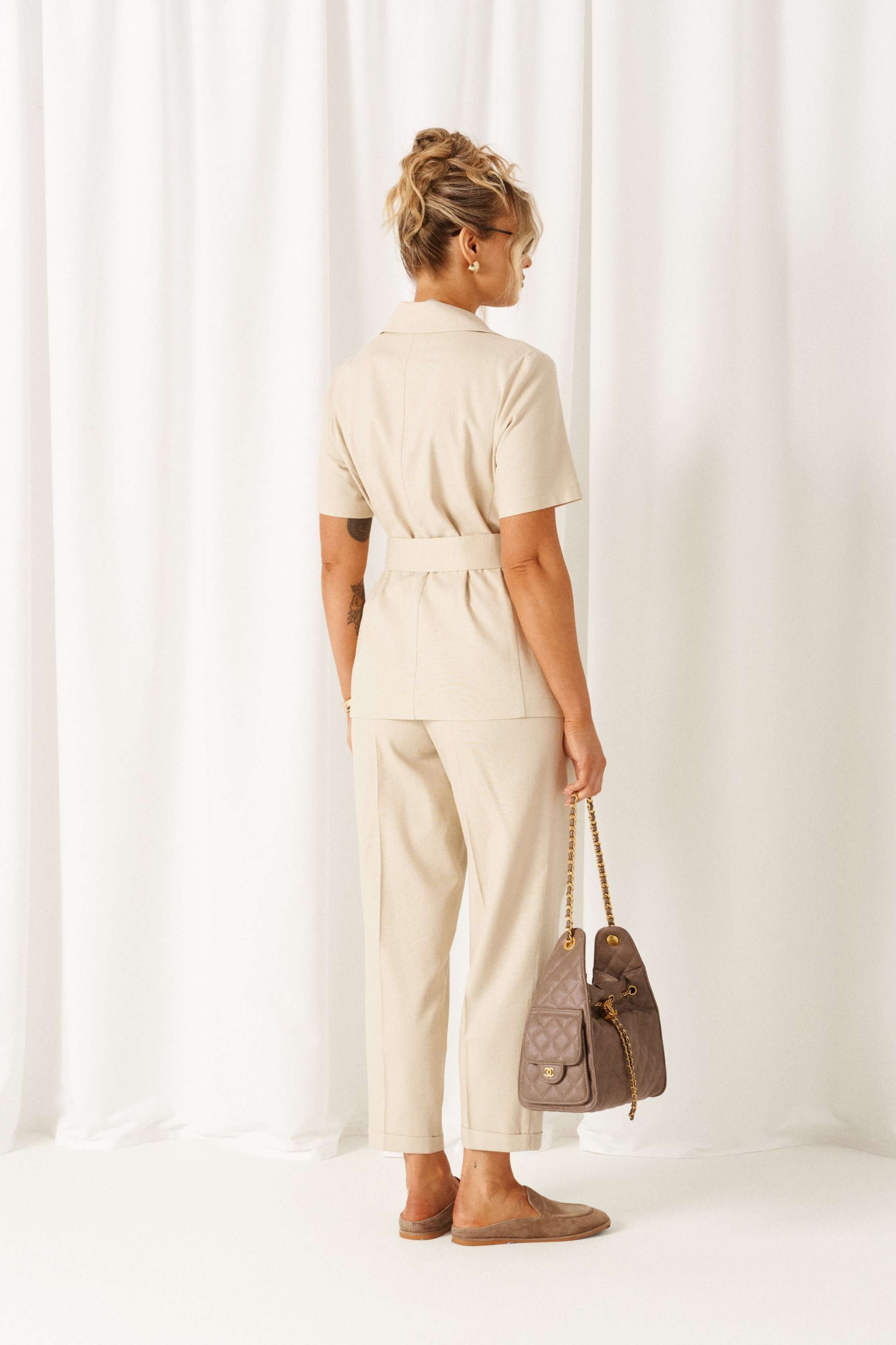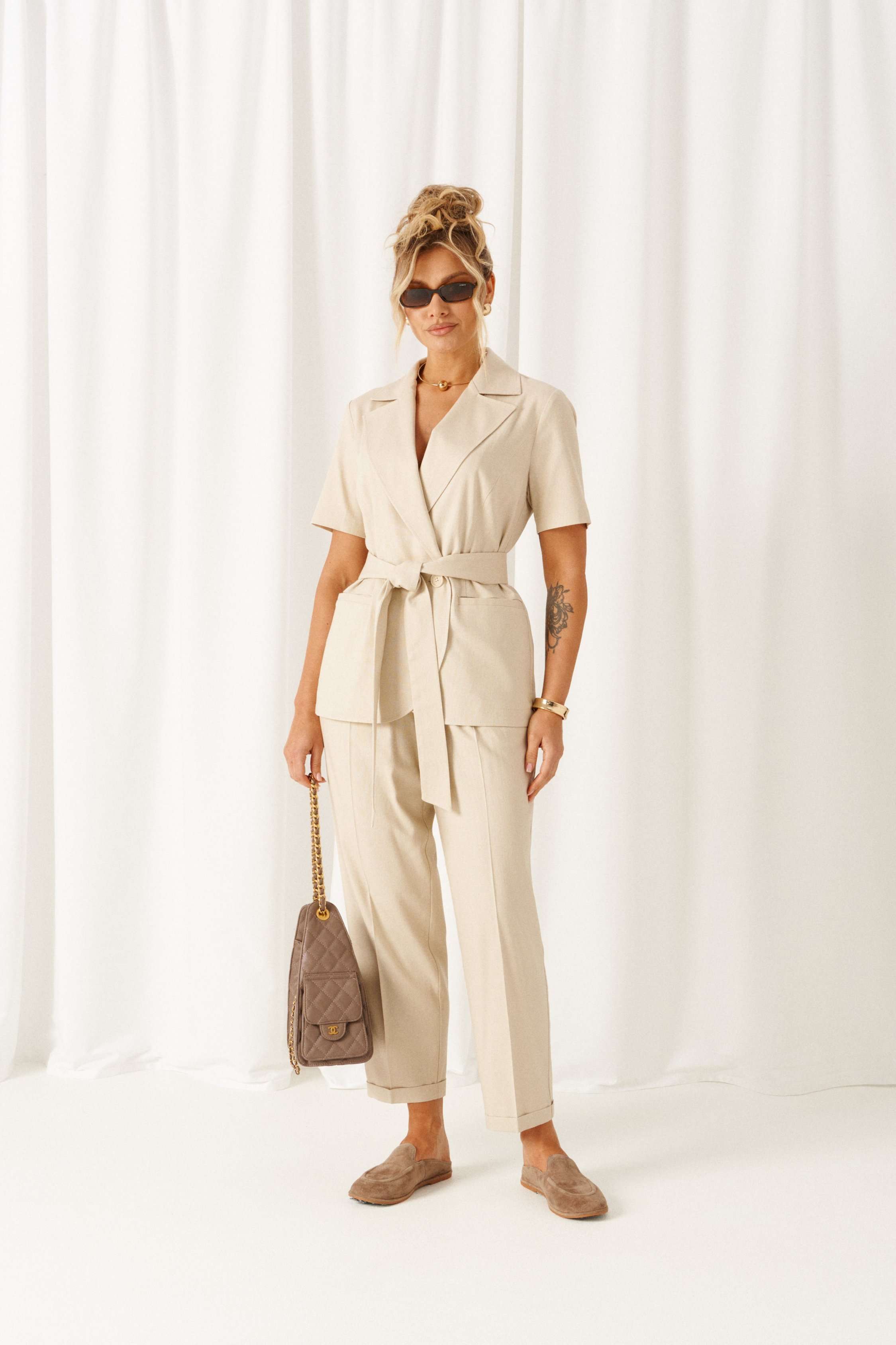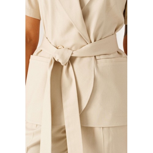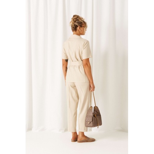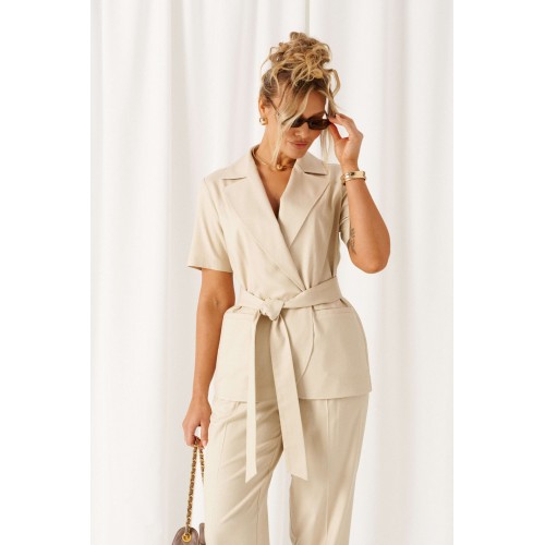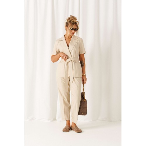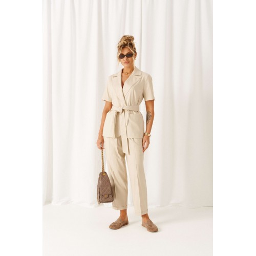 Женский льняной комплект - классический, но с выразительным характером! Созданный с акцентными деталями из ткани с натуральными волокнами, костюм подойдет для любой летней погоды и для любого случая выхода. Эффектный комплект состоит из жакета и брюк, выполнен из мягкой смесовой ткани с органическими льном и вискозой, практичен в носке. Жакет полуприлегающего силуэта, двубортный. Передняя часть из двух половинок, с вертикальными рельефами от проймы и прорезными боковыми карманами с обтачкой. Низ борта округлый. Спинка со средним швом и с вертикальными рельефами от проймы. Воротник пиджачного типа с фигурными лацканами. Рукав втачной одношовный короткий. Застежка смещенная на одну видимую петлю и пуговицу, а также на одну внутреннюю петлю и потайную пуговицу. Дополнительным элементом служит пояс-завязка. Брюки длинной 7/8, свободные в верху и заужены к низу. В верхней части с мягкой складкой от пояса, внизу с отворотом. Посадка классическая. Спереди расположены боковые функциональные карманы. Пояс притачной с эластичной резинкой по кругу, шириной 4см. длина жакета (по среднему шву спинки) – 69 см. длина рукава жакета – 26-27 см длина брюк (по боковому шву с поясом) – 100 см.