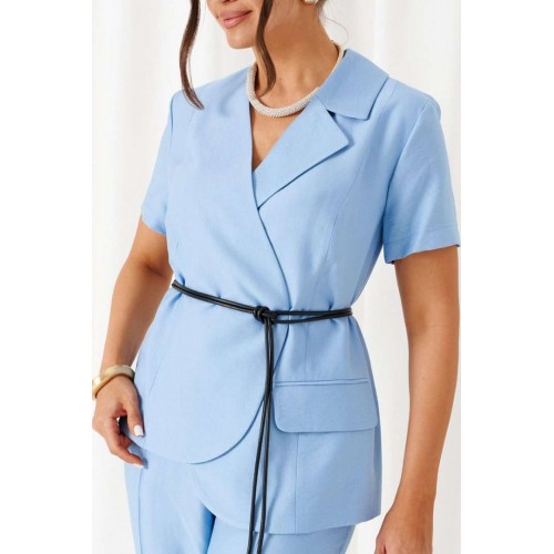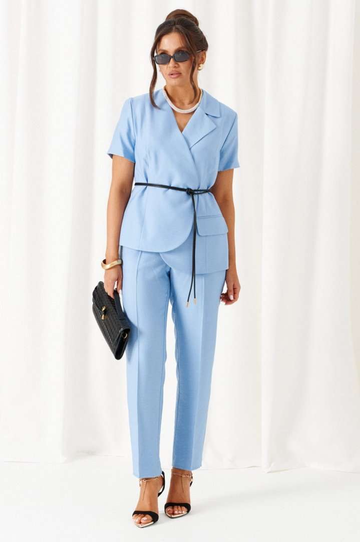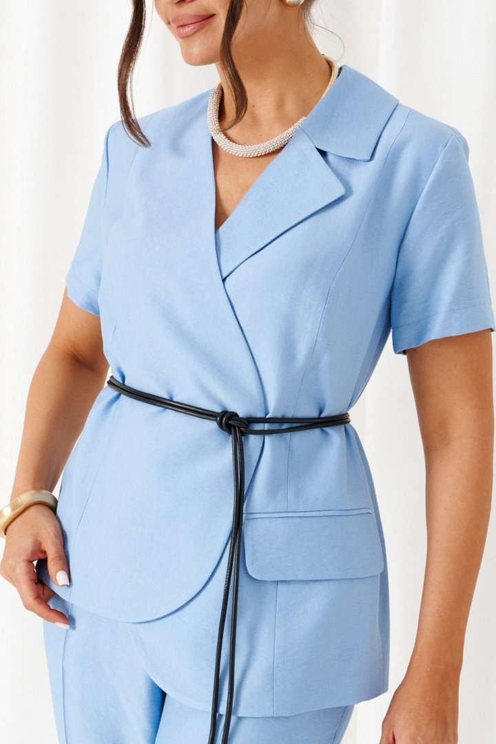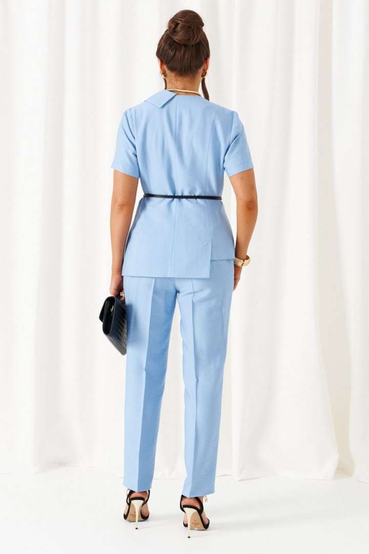Женский льняной костюм с акцентными деталями и эффектные оттенки! Созданный отличительным кроем с подчеркнутыми деталями, костюм задаст уверенное настроение образу и подчеркнет индивидуальность при любом случае выхода. Выразительный костюм состоит из жакета и брюк, выполнен из мягкой смесовой ткани с натуральными волокнами льна и вискозы, практичен в носке. Жакет полуприлегающего силуэта, двубортный, асимметричный разноуровневый. На подкладке. Передняя часть из двух половинок, с вертикальными рельефами от плеча. На левой полочке расположен прорезной нижний карман с обтачкой и клапаном, вырез горловины оформлен пиджачным воротником с лацканом. Правая полочка укорочена и без дополнительных элементов. Спинка со средним швом и с вертикальными рельефами от плеча. Правый рельеф заканчивается функциональным разрезом-шлица. Рукав втачной, одношовный короткий. Застежка смещенная на потайные петли и пуговицы. Низ борта округлый. Дополнительным элементом служит декоративный пояс. Брюки длинной до щиколотки, слегка заужены к низу. Посадка классическая. Застежка центральная на молнию и на петлю с пуговицей на поясе. Спереди расположены боковые функциональные карманы. Пояс притачной, сзади на резинке, шириной 4см. длина жакета (по среднему шву спинки) – 65-66 см. длина рукава жакета – 21,5 см длина брюк (по боковому шву с поясом) – 100 см.