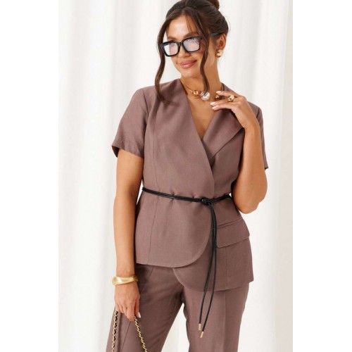 Женский льняной костюм с акцентными деталями и эффектные оттенки! Созданный отличительным кроем с подчеркнутыми деталями, костюм задаст уверенное настроение образу и подчеркнет индивидуальность при любом случае выхода. Выразительный костюм состоит из жакета и брюк, выполнен из мягкой смесовой ткани с натуральными волокнами льна и вискозы, практичен в носке. Жакет полуприлегающего силуэта, двубортный, асимметричный разноуровневый. На подкладке. Передняя часть из двух половинок, с вертикальными рельефами от плеча. На левой полочке расположен прорезной нижний карман с обтачкой и клапаном, вырез горловины оформлен пиджачным воротником с лацканом. Правая полочка укорочена и без дополнительных элементов. Спинка со средним швом и с вертикальными рельефами от плеча. Правый рельеф заканчивается функциональным разрезом-шлица. Рукав втачной, одношовный короткий. Застежка смещенная на потайные петли и пуговицы. Низ борта округлый. Дополнительным элементом служит декоративный пояс. Брюки длинной до щиколотки, слегка заужены к низу. Посадка классическая. Застежка центральная на молнию и на петлю с пуговицей на поясе. Спереди расположены боковые функциональные карманы. Пояс притачной, сзади на резинке, шириной 4см. длина жакета (по среднему шву спинки) – 65-66 см. длина рукава жакета – 21,5 см длина брюк (по боковому шву с поясом) – 100 см.