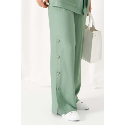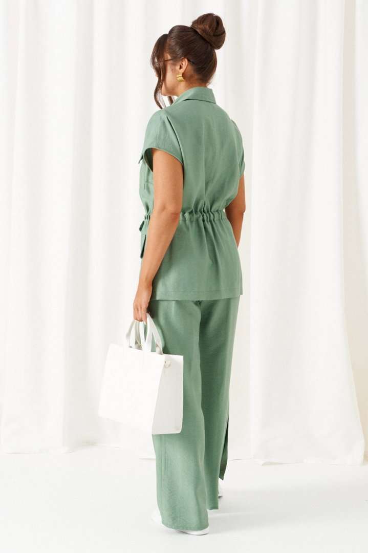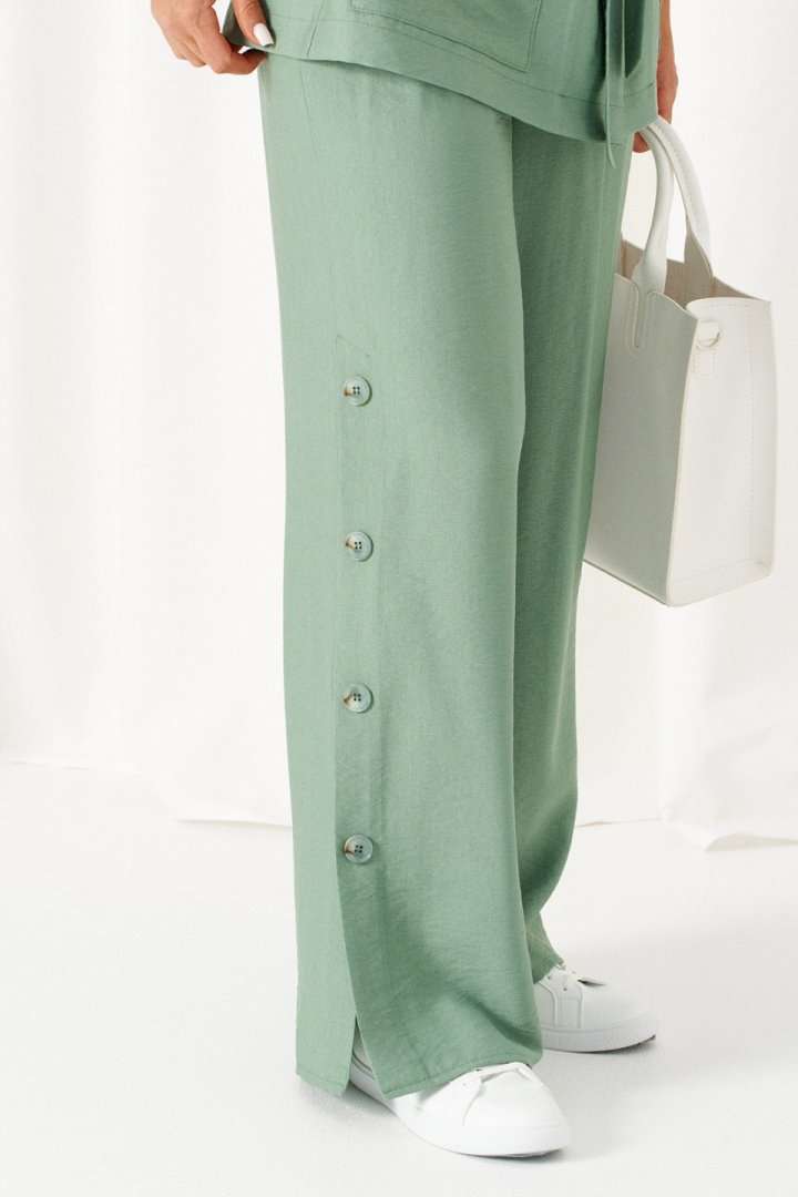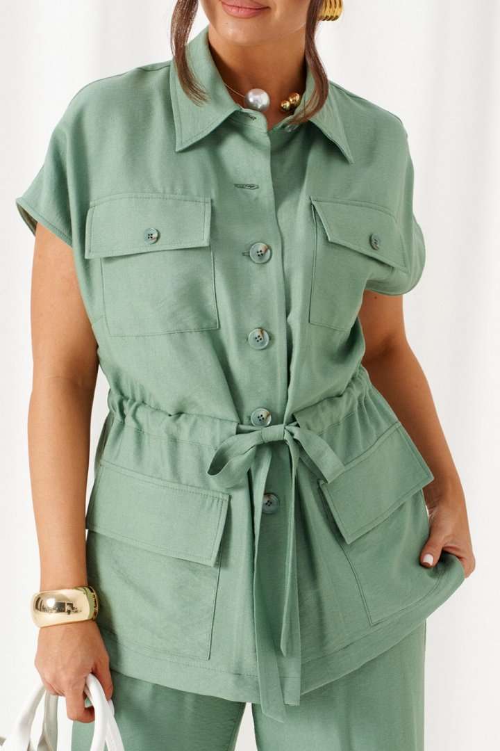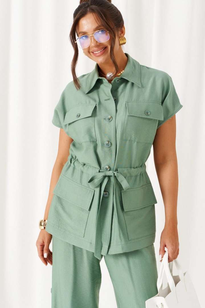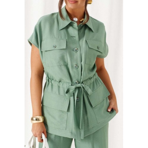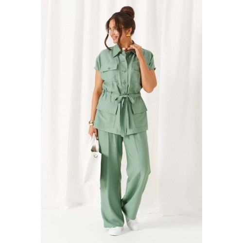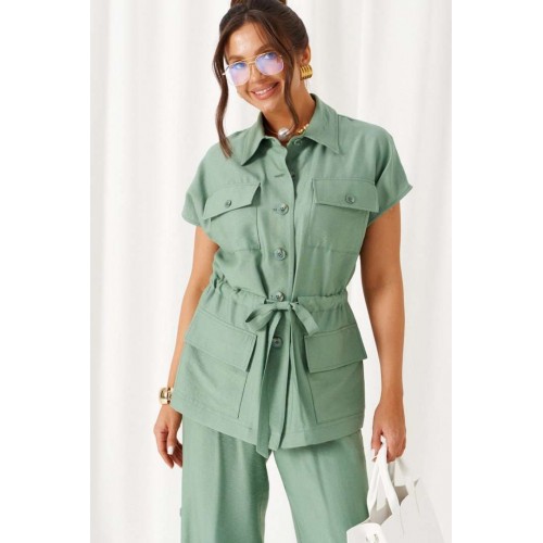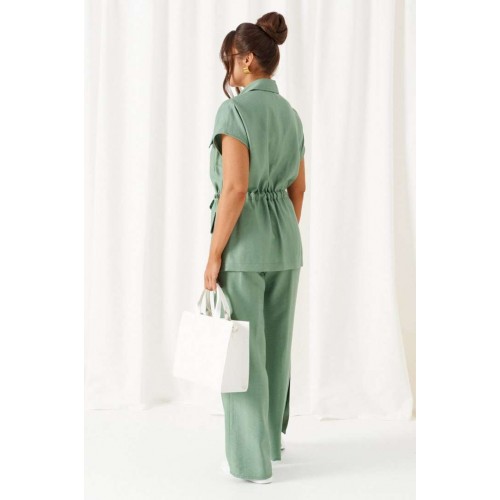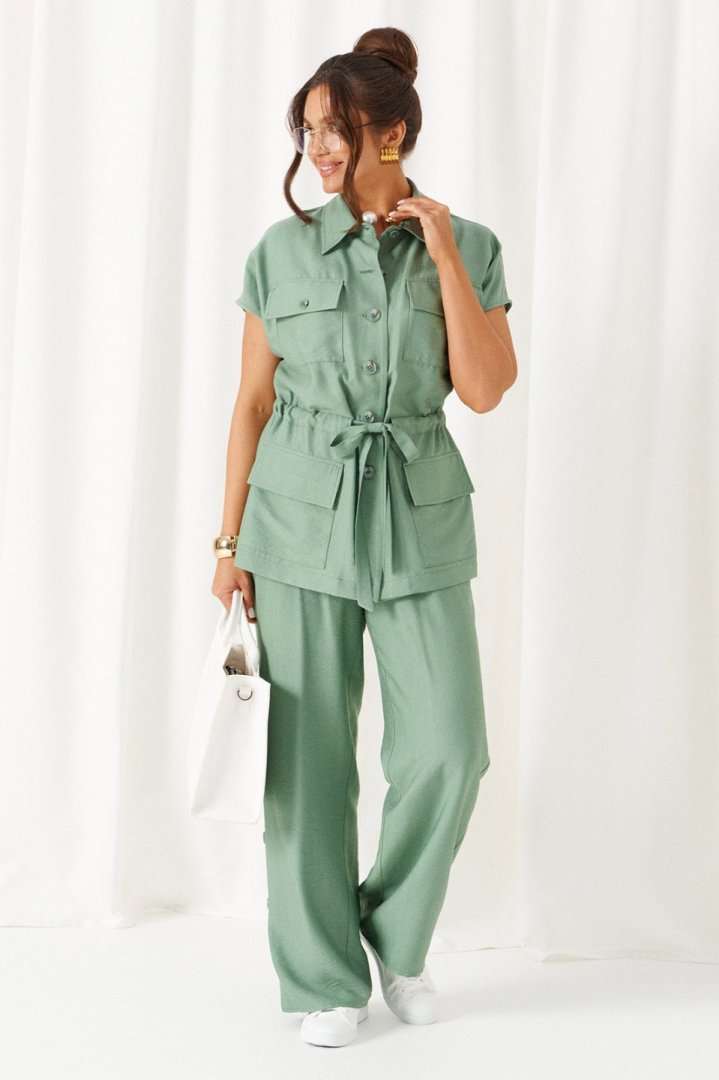 Женский льняной костюм из смесовой ткани с натуральным составом, акцентные накладные карманы и безупречные любимые оттенки. Созданный в расслабленном крое с подчеркнутыми деталями, костюм позволит чувствовать себя комфортно и непринужденно. Стильный костюм состоит из жакета-рубашки и брюк, выполнен из мягкой ткани с волокнами льна и вискозы, практичен в носке. Жакет свободного силуэта, удлиненный с кулисой и пояском-завязкой. Передняя часть из двух половинок, с нагрудными вытачками от бокового шва и накладными верхними и нижними функциональными карманами с клапанами. Спинка разрезная со средним швом. Воротник классический стояче-отложной на отрезной стойке. Линия плеча удлиненная, спущенная, переходящая в цельнокроеный рукав. Застежка центральная на петли и пуговицы. Низ прямой. Брюки длинные, прямые свободные. Посадка стандартная. В боковом шве на одной брючине ниже уровня колена выполнена шлица с закреплением на декоративные пуговицы, вторая брючина классического кроя. Пояс притачной, шириной 4см с эластичной тесьмой по кругу. длина жакета (по среднему шву спинки) - 72 см. длина брюк (по боковому шву с поясом) – 108 см.