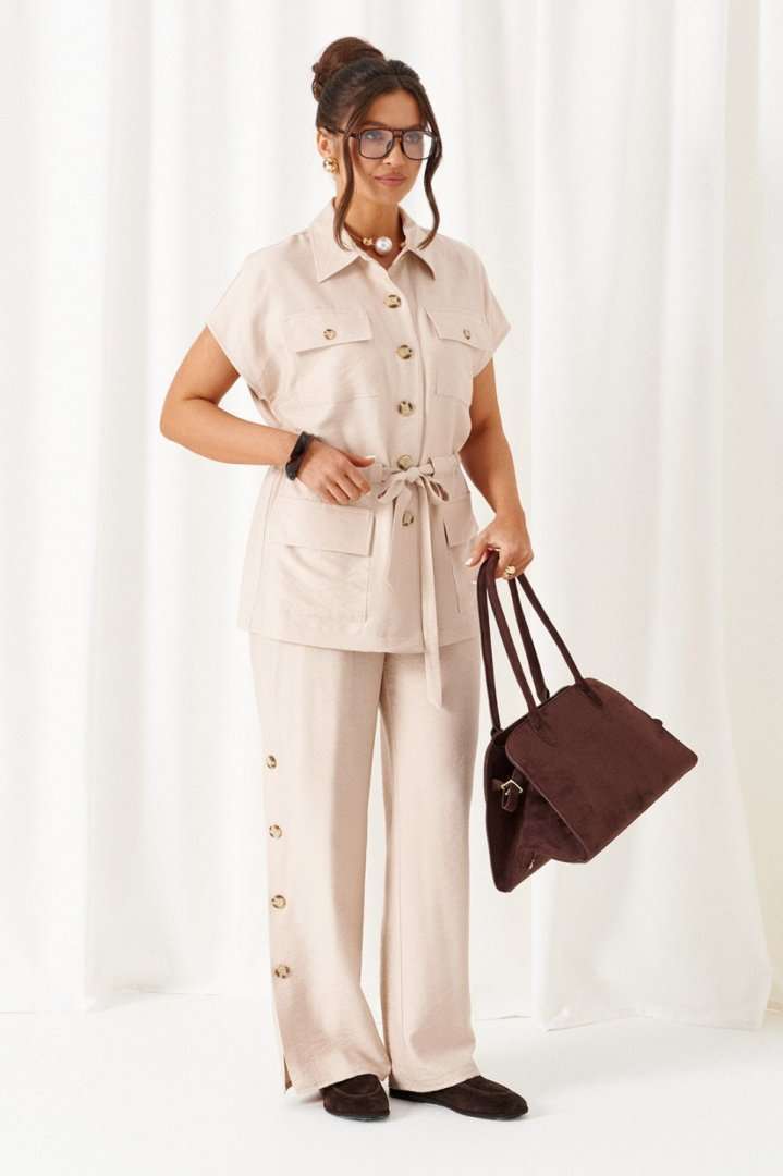 Женский льняной костюм из смесовой ткани с натуральным составом, акцентные накладные карманы и безупречные любимые оттенки. Созданный в расслабленном крое с подчеркнутыми деталями, костюм позволит чувствовать себя комфортно и непринужденно. Стильный костюм состоит из жакета-рубашки и брюк, выполнен из мягкой ткани с волокнами льна и вискозы, практичен в носке. Жакет свободного силуэта, удлиненный с кулисой и пояском-завязкой. Передняя часть из двух половинок, с нагрудными вытачками от бокового шва и накладными верхними и нижними функциональными карманами с клапанами. Спинка разрезная со средним швом. Воротник классический стояче-отложной на отрезной стойке. Линия плеча удлиненная, спущенная, переходящая в цельнокроеный рукав. Застежка центральная на петли и пуговицы. Низ прямой. Брюки длинные, прямые свободные. Посадка стандартная. В боковом шве на одной брючине ниже уровня колена выполнена шлица с закреплением на декоративные пуговицы, вторая брючина классического кроя. Пояс притачной, шириной 4см с эластичной тесьмой по кругу. длина жакета (по среднему шву спинки) - 72 см. длина брюк (по боковому шву с поясом) – 108 см.