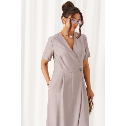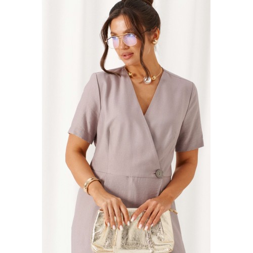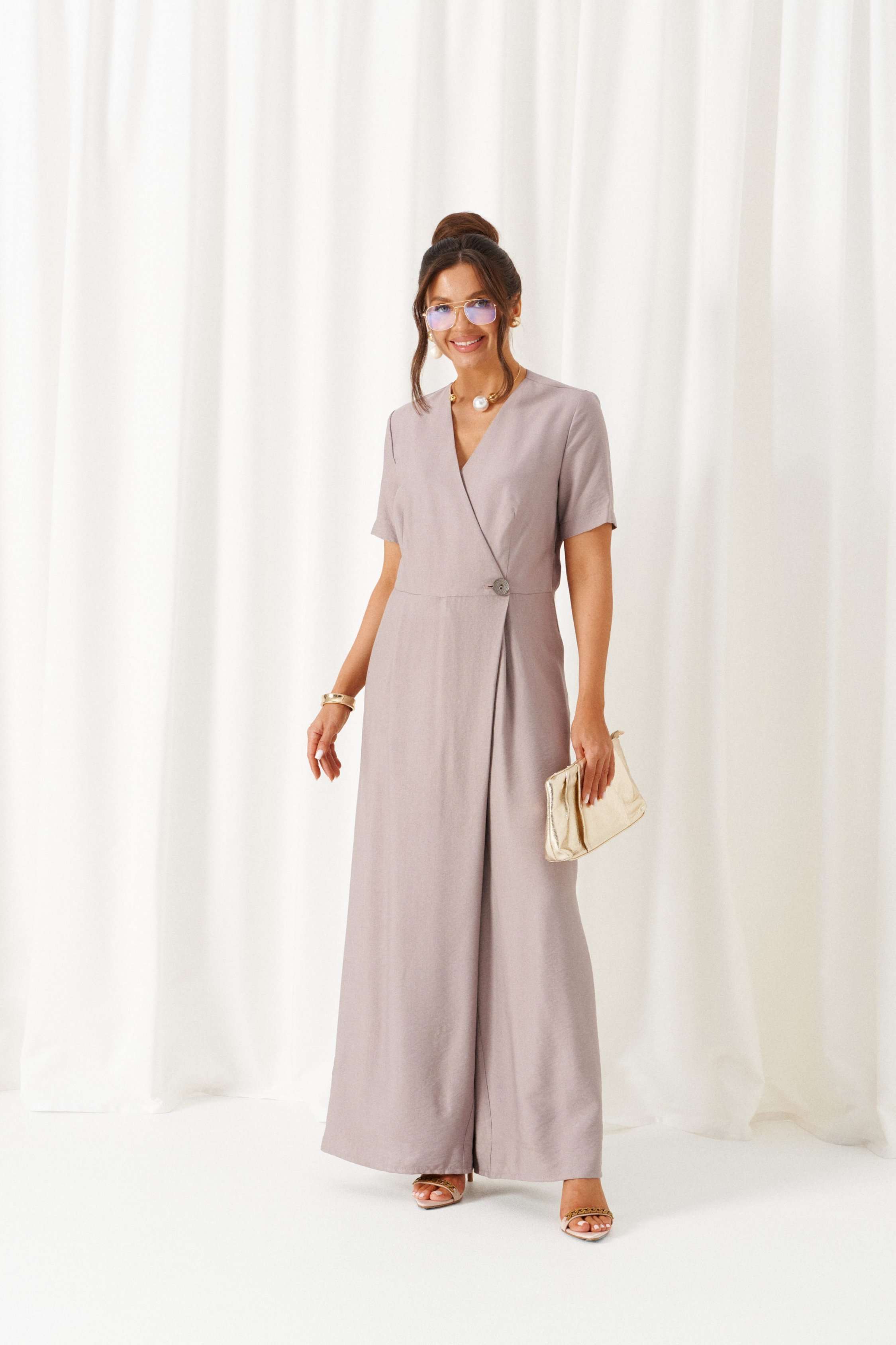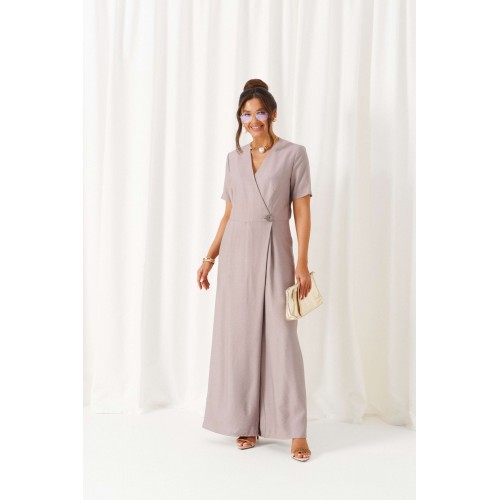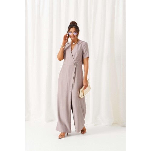 Данная модель предназначена для повседневного использования. Это не только красивый, но и очень практичный предмет гардероба. Соединение в одно целое женских брюк и топа является чрезвычайно функциональным решением. Комбинезон отрезной по линии талии, полуприлегающего силуэта. Передняя часть выполнена в полюбившемся многим стиле «на запах», с двумя вытачками на талии лифа и двумя складками на талии брюк. В боковом шве брюк предусмотрены внутренние функциональные карманы. Рукав короткий, одношовный, втачной. Задняя часть комбинезона разрезная по среднему шву, с талиевыми вытачками на лифе и на брюках. Брюки комбинезона прямые, широкие. Вырез горловины V-образной формы. Застёжка смещенная на одну петлю и большую пуговицу, также предусмотрена внутренняя фиксация на одну петлю и потайную пуговицу. По брюкам спереди застёжка центральная на потайную молнию. Верхняя часть переда комбинезона на хлопковой подкладке. Длина верхней части (по среднему шву спинки) – 41см. Длина брюк (по боковому шву) – 106 см. Длина рукава – 23,5 см.
