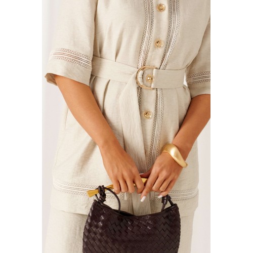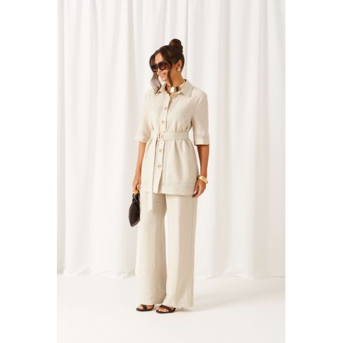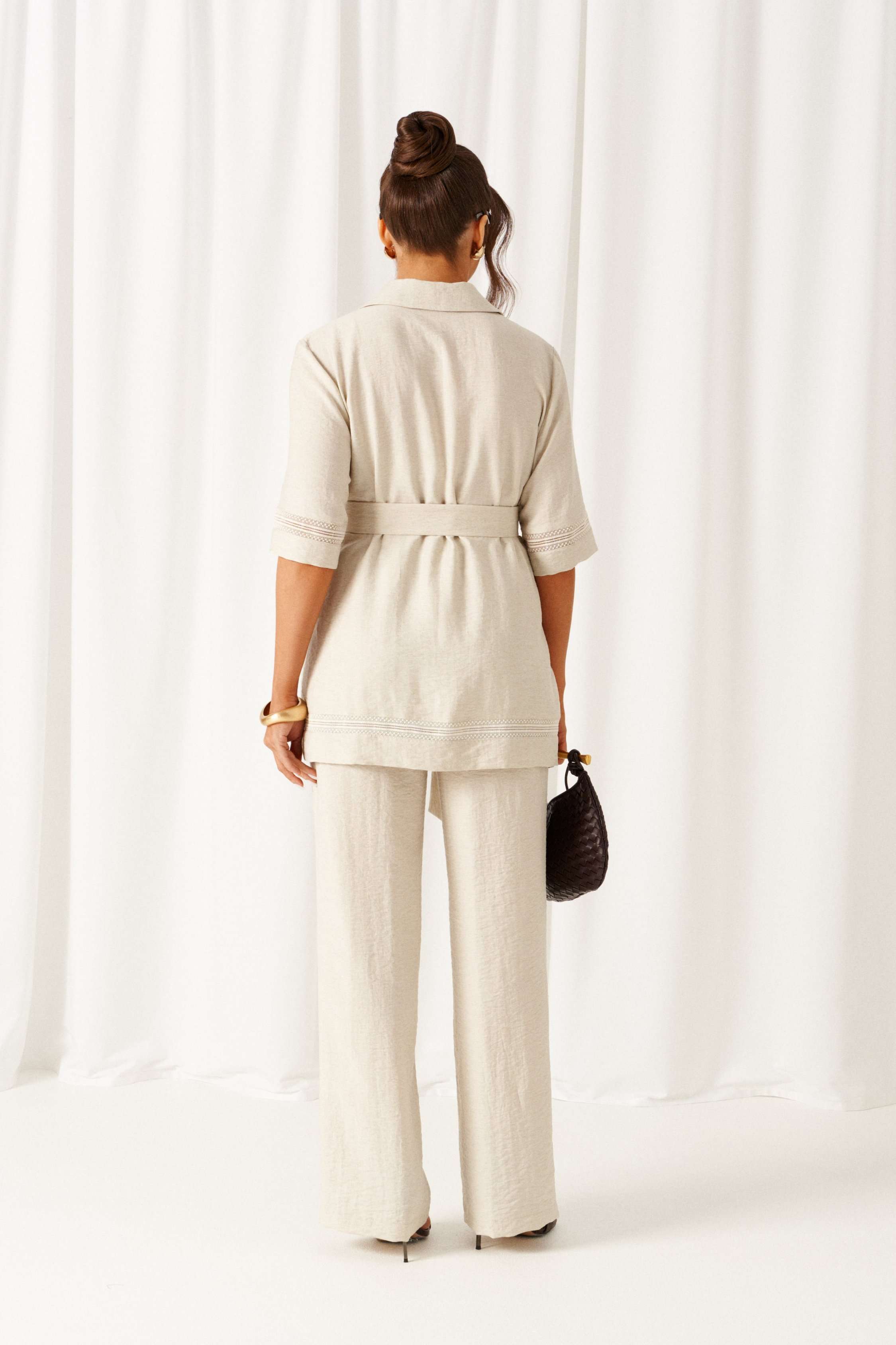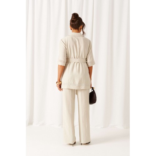 Женский льняной костюм из смесовой ткани с натуральным составом, акцентные кружевные детали и безупречные любимые оттенки. Созданный в расслабленном крое с подчеркнутыми деталями, костюм позволит чувствовать себя комфортно и непринужденно. Стильный костюм состоит из блузы и брюк, выполнен из мягкой ткани с волокнами льна и вискозы, практичен в носке. Блуза полуприлегающего силуэта, длиной до середины бедра с пояском-завязкой. Передняя часть из двух половинок, с нагрудными вытачками от бокового шва и вставками из кружева по борту и низу. Спинка цельная, низ отделан кружевной тесьмой аналогично переду. Воротник классический стояче-отложной на отрезной стойке. Рукав втачной, одношовный длиной до локтя, по низу вставлена отделочная кружевная тесьма. Застежка центральная на петли и пуговицы. Низ прямой. Брюки длинные, прямые свободные. Посадка стандартная, крой классический. Пояс притачной, шириной 4см с эластичной тесьмой по кругу. длина блузы (по среднему шву спинки) - 72 см. длина рукава блузы – 33 см. длина брюк (по боковому шву с поясом) – 108 см.