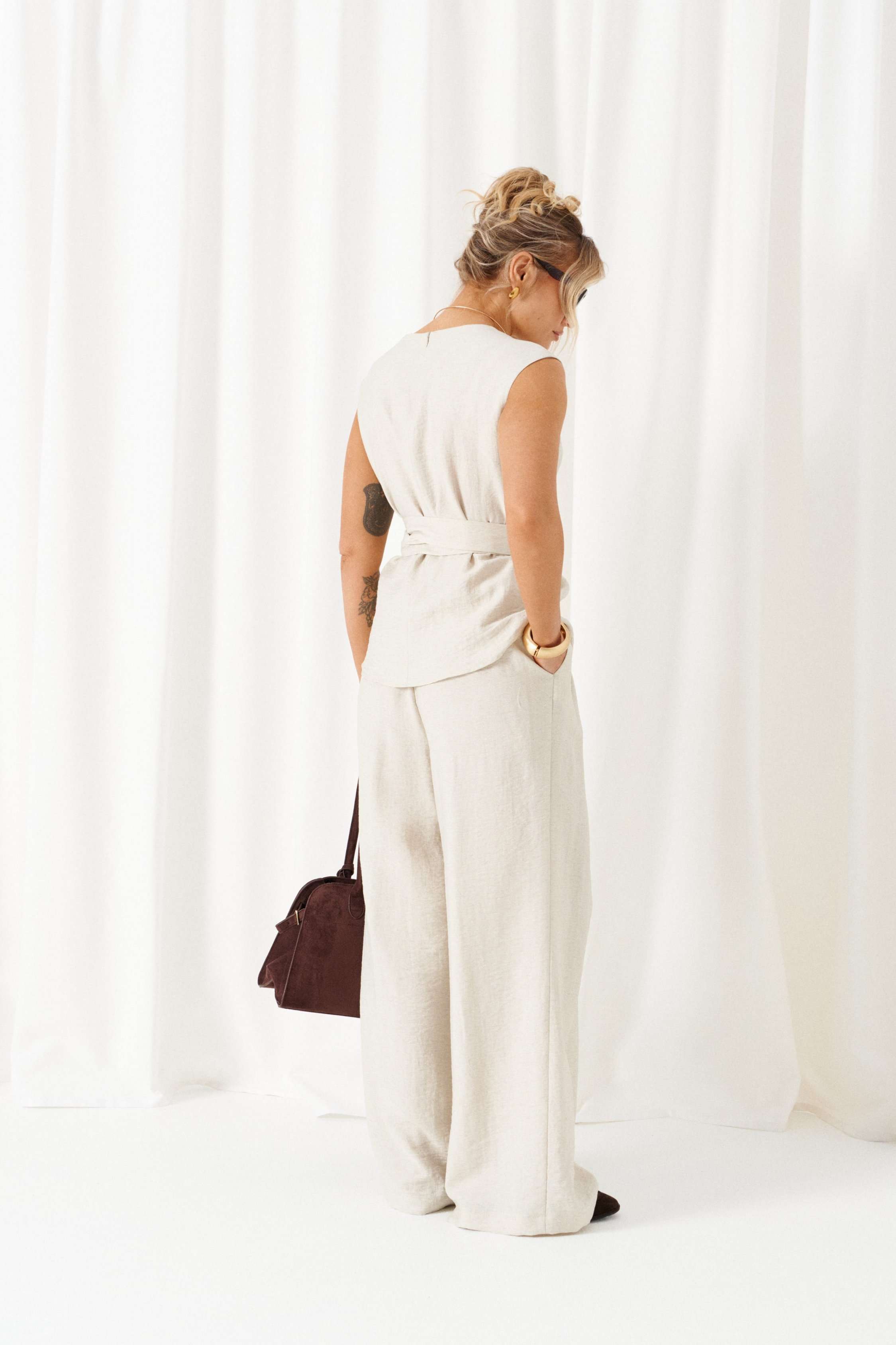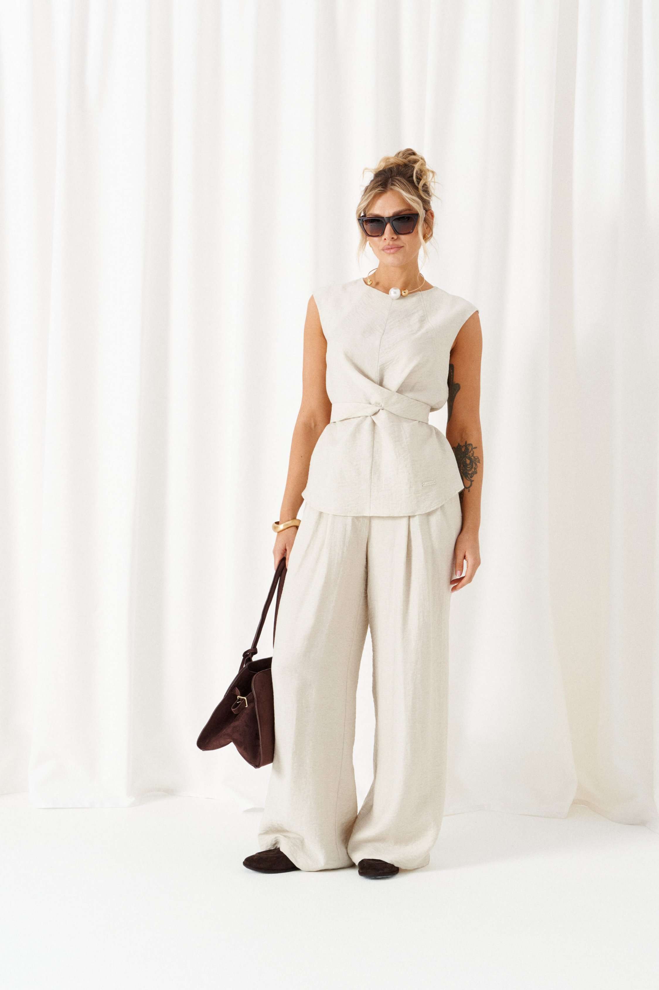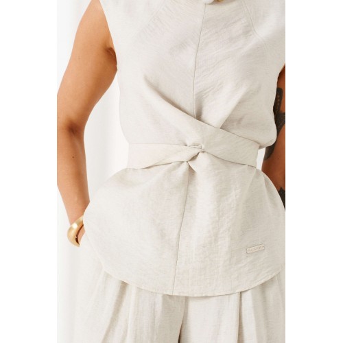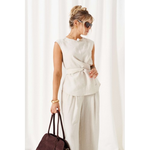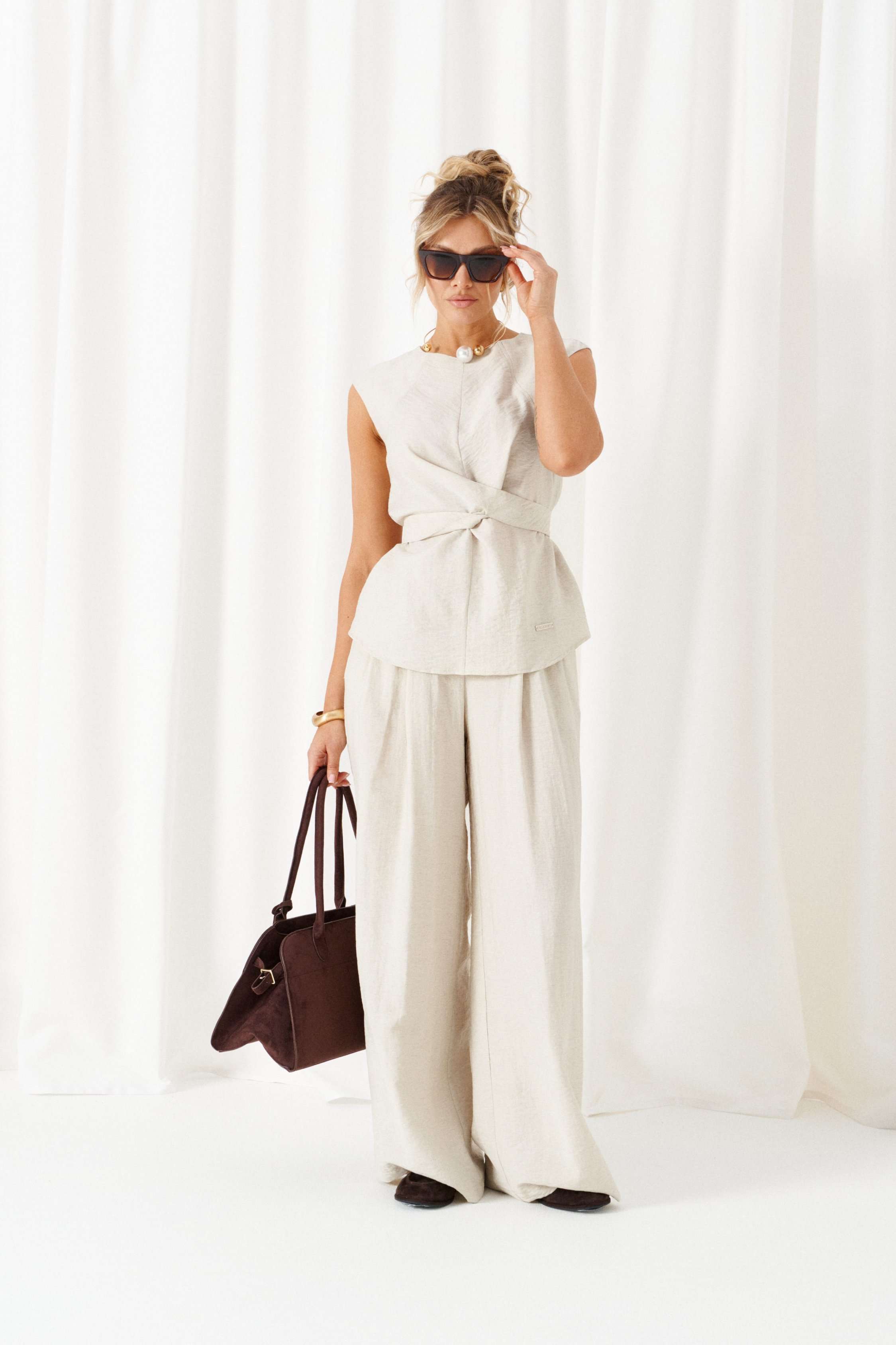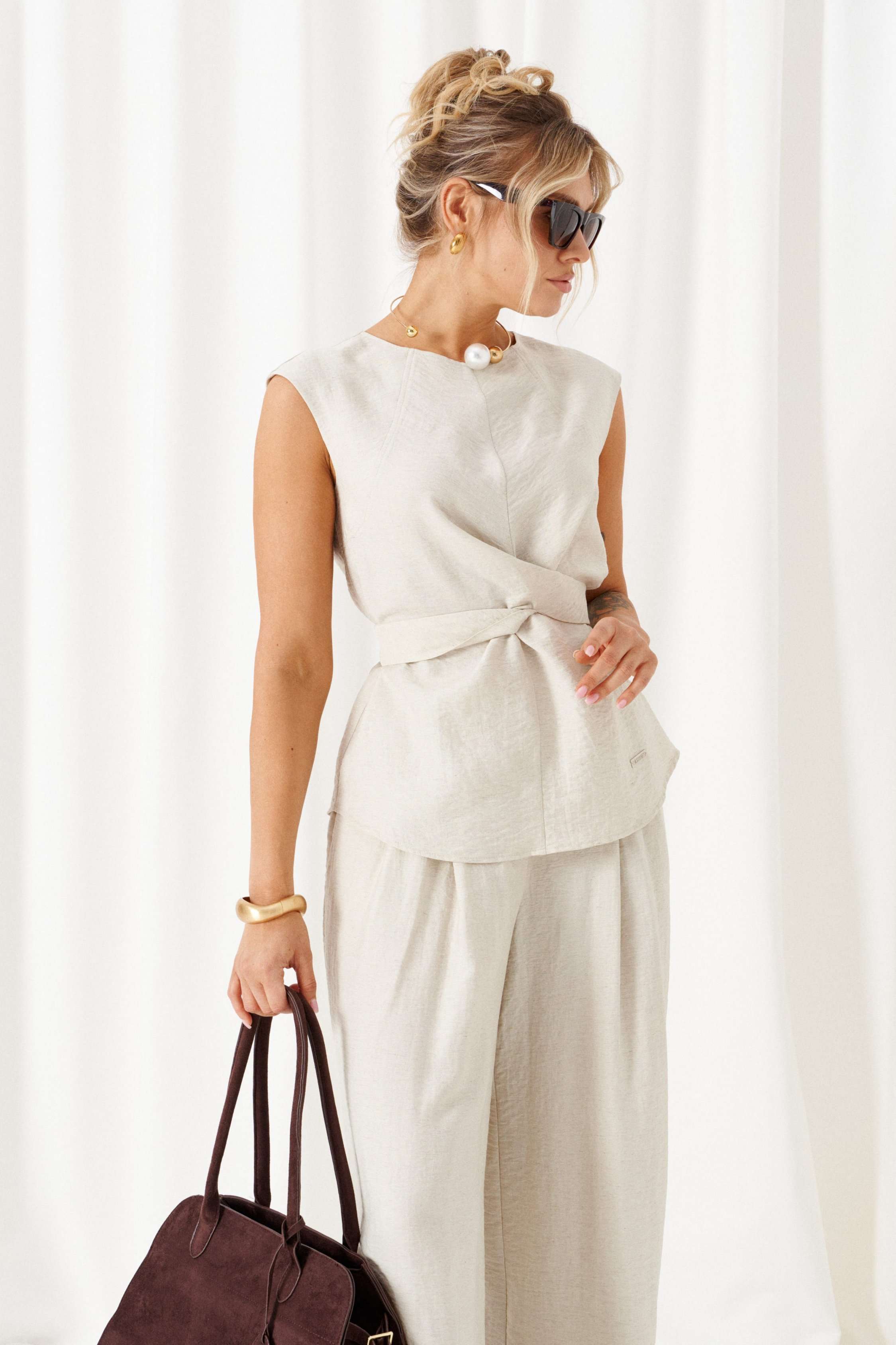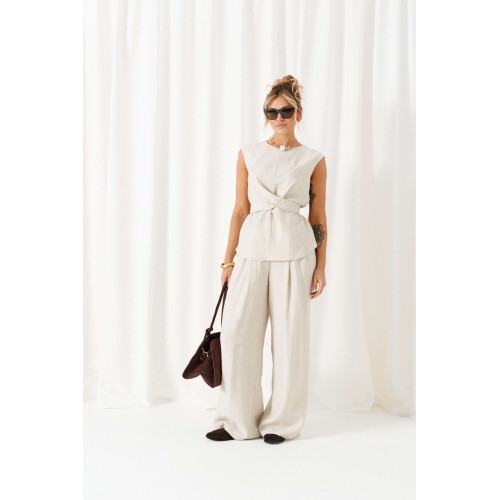 Стильный женский костюм в стиле фьюжн, дополненный акцентными деталями, весьма актуален в будущем сезоне. Предметы костюма можно смело комбинировать по отдельности с другими вещами гардероба. Костюм состоит из 2-х предметов одежды: блузки и брюк. Выполнен из ткани с содержанием натуральных волокон льна и вискозы. Блузка полуприлегающего силуэта свободного кроя, со слегка удлиненной линией плеча, без рукава. Индивидуальность изделию придает цельнокроеная деталь, выполняющая роль пояса-завязки, который перекручиваясь создает красивый узел спереди и фиксирует талию. Перед из двух симметричных деталей с вертикальным швом посередине. Спинка со средним швом, сверху вставлена потайная застежка-молния. О-образный вырез горловины. Низ блузки слегка закругленный к боковым участкам. Брюки прямого силуэта, длинные, свободные, со складками от пояса, с двумя верхними боковыми карманами спереди. Высота сидения классическая. Застежка центральная на молнию и на петлю с пуговицей на поясе. Брюки на притачном поясе, в который для удобного прилегания вставлена резинка по заднему участку. Длина блузки (по середине спинки) ~ 65 см. Длина брюк (с поясом) ~ 110 см.