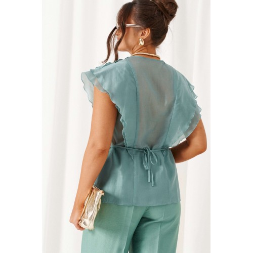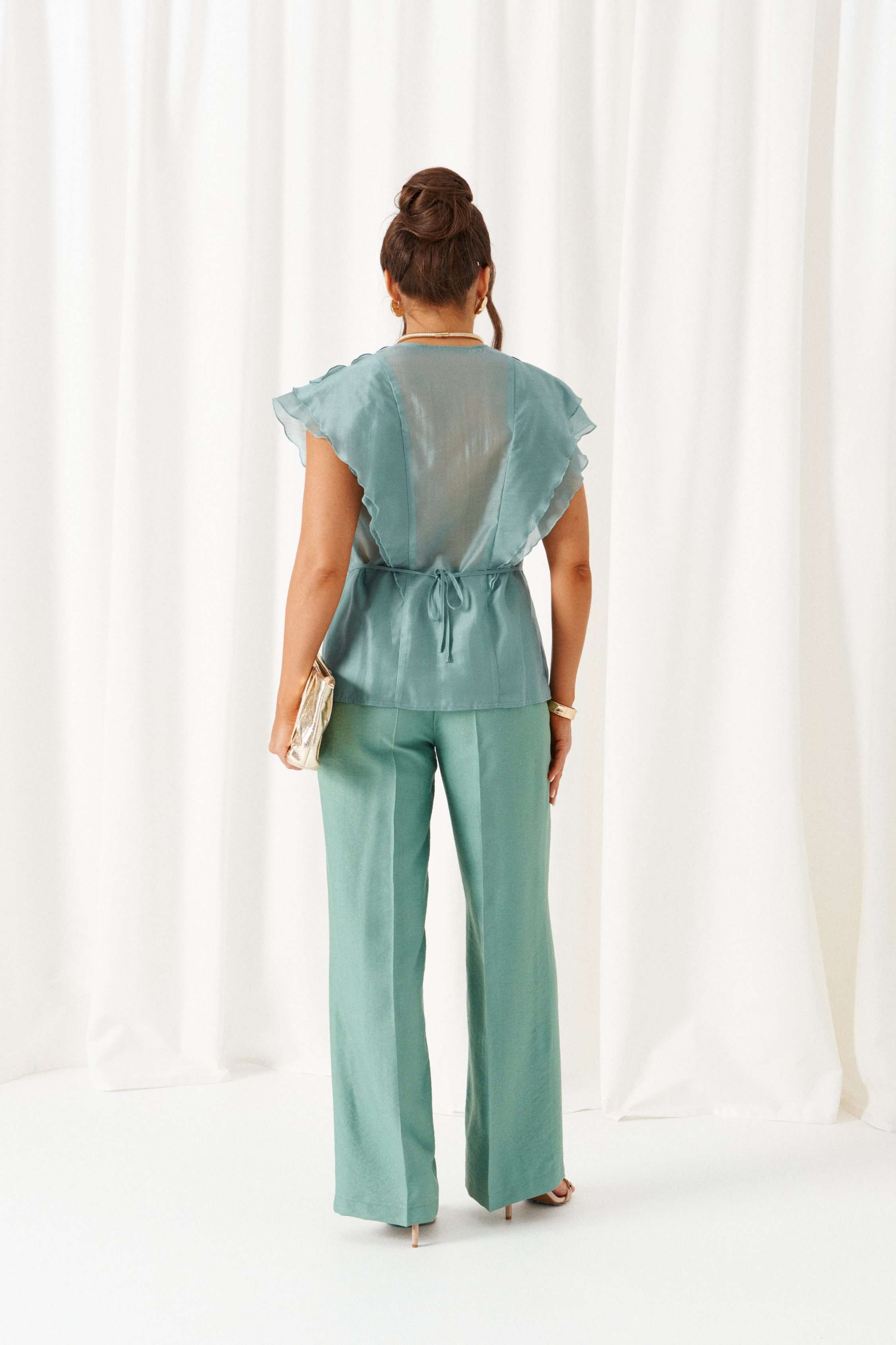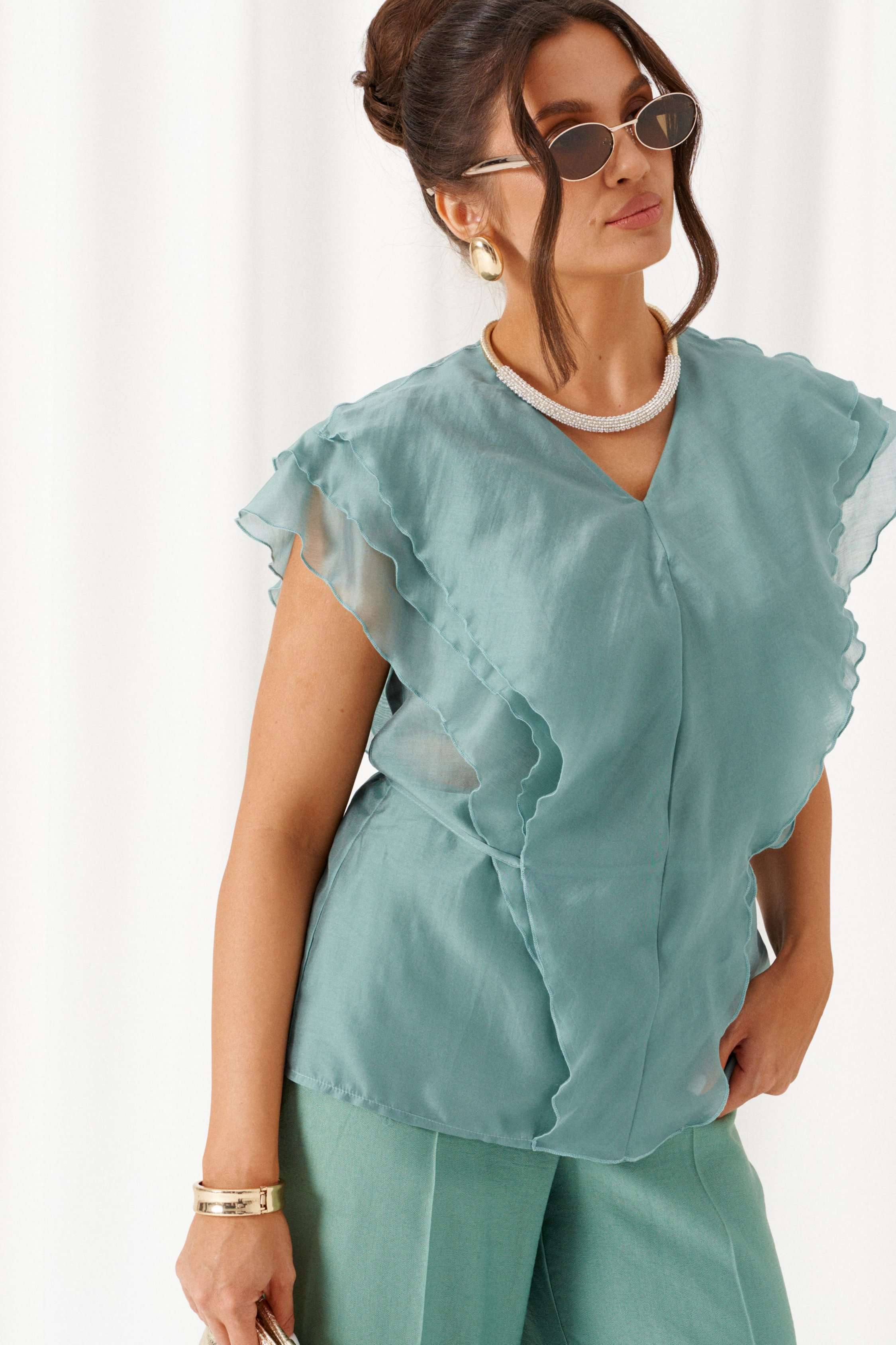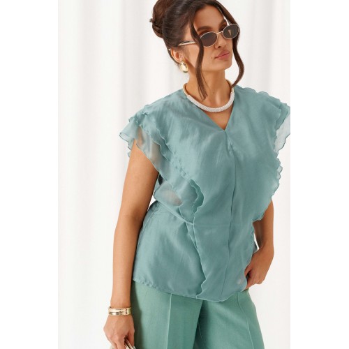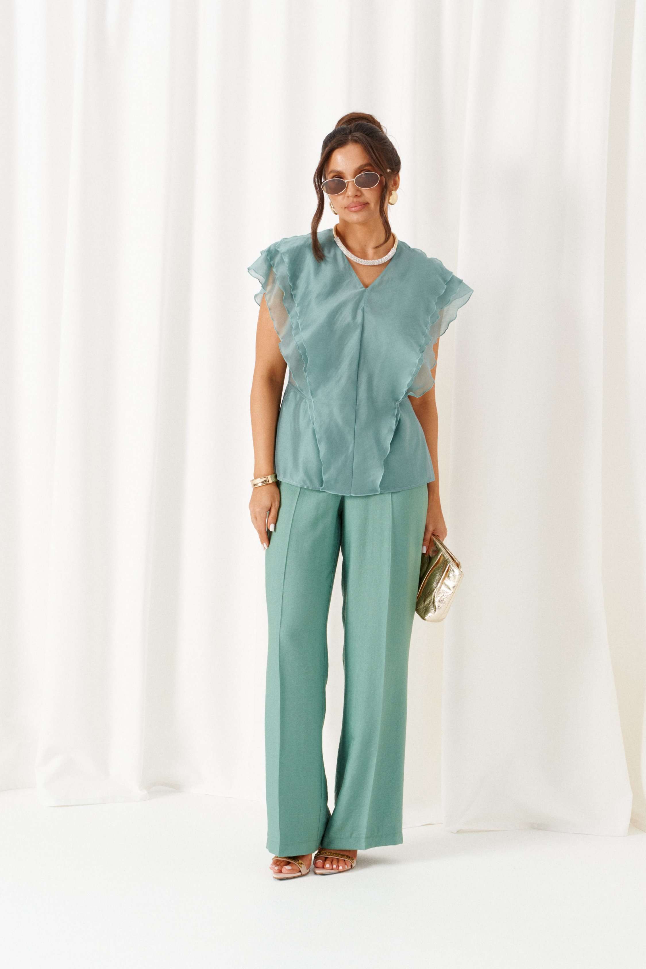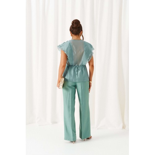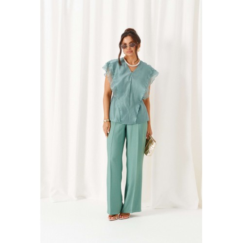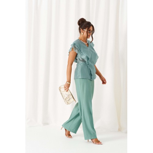 Есть вещи, которые незаметно становятся любимыми и остаются в гардеробе надолго. Комплект в романтическом стиле, состоящий из блузки и брюк, будет идеально сопровождать на любой выход. Блузка полуприлегающего силуэта выполнена из смесовой ткани с содержанием вискозной нити, дополнена несъемным пояском-завязками, которые регулируют прилегание по талии. Передняя часть симметричная, разрезная по центру и с вертикальными рельефами от плеча, спрятанными под тремя воланами разной ширины. Спинка цельная по середине и с двумя дополнительными вертикальными рельефами от плеча, в которые переходят воланы с переда. Вырез горловины V-образной формы. Брюки классические, свободные с боковыми подрезами, имитирующими карманы. Посадка стандартная. В задней части пояса для удобства использования вставлена резинка. Застежка центральная на молнию и петлю с пуговицей на поясе. Длина блузки (по середине спинки) – 63 см. Длина брюк (по боковому шву с поясом) – 108 см.