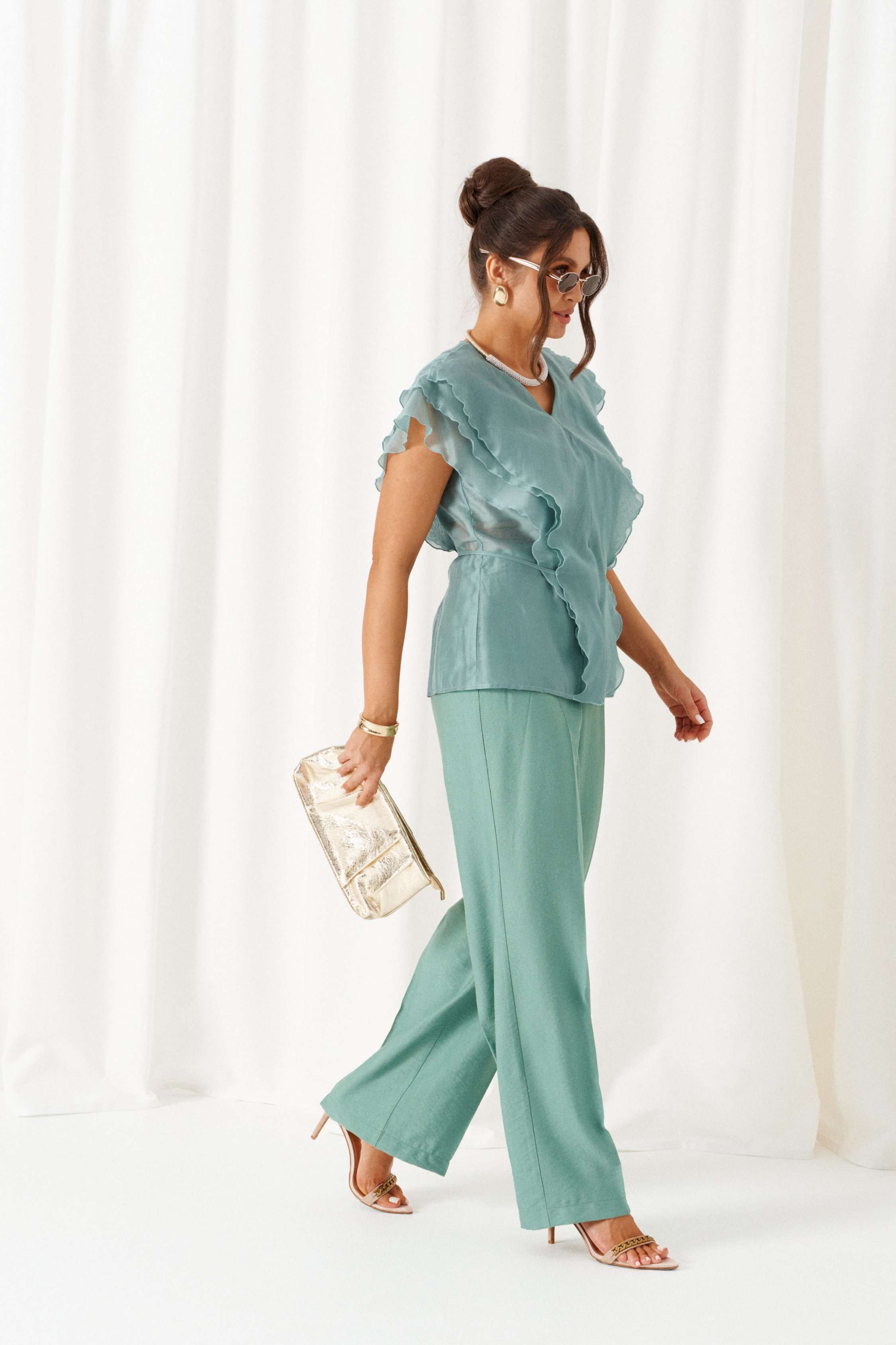 Состав: блузка – вискоза 87%, нейлон 13%, брюки - лен 80%, вискоза 20%