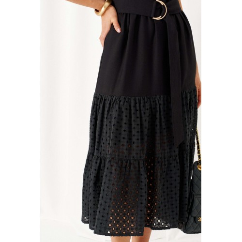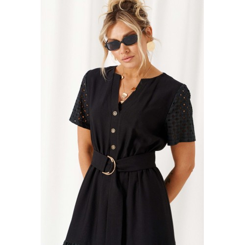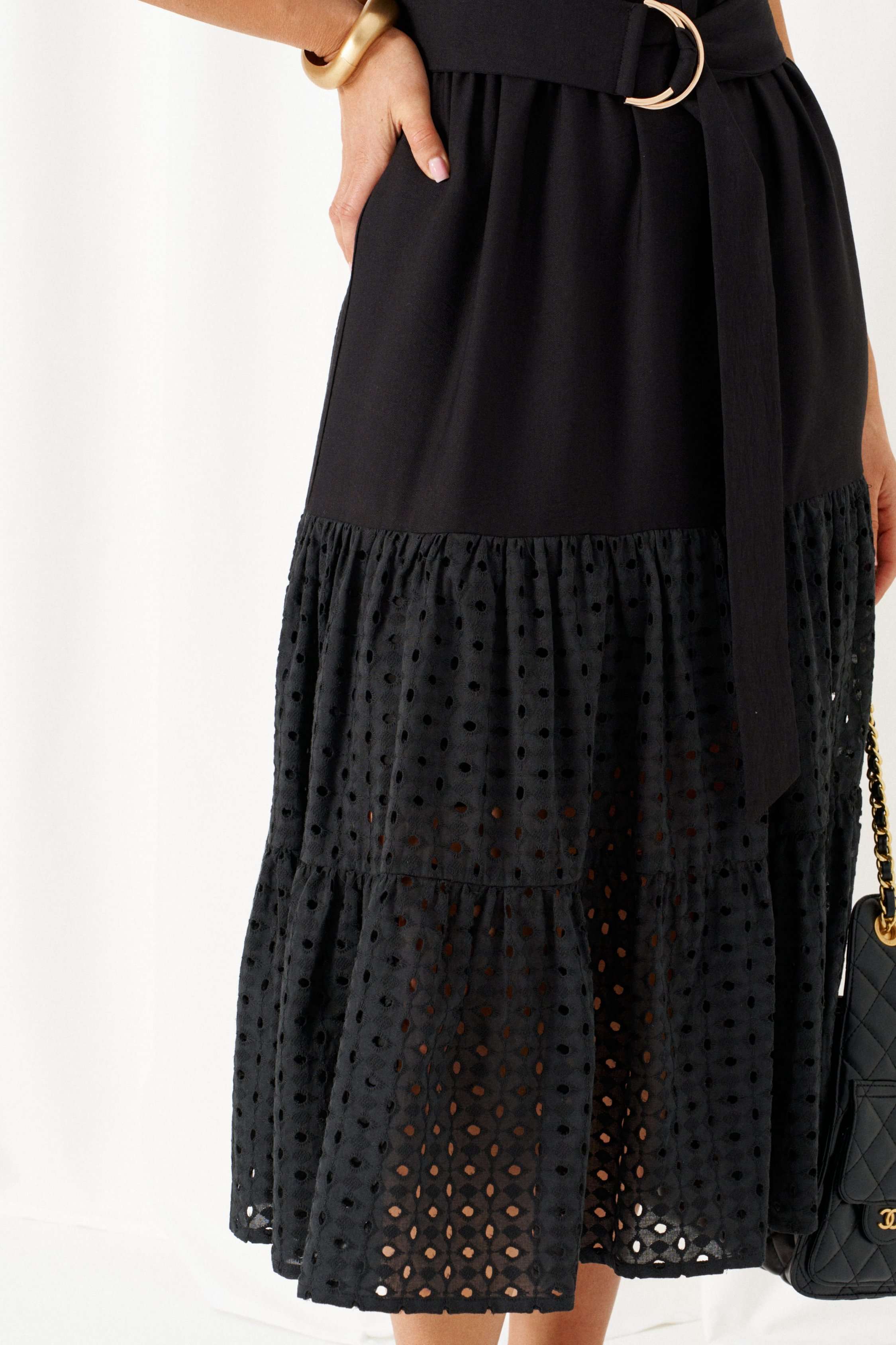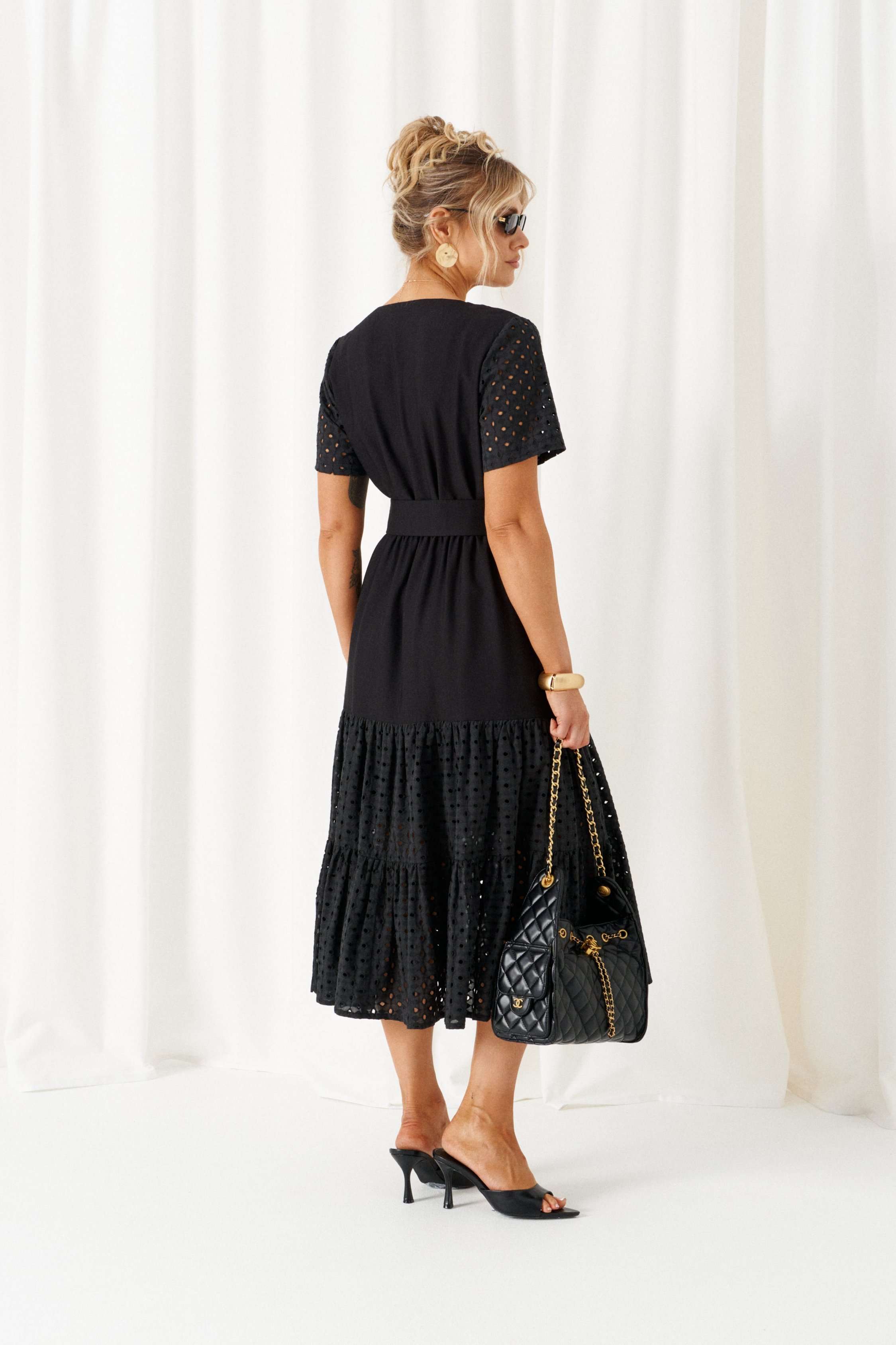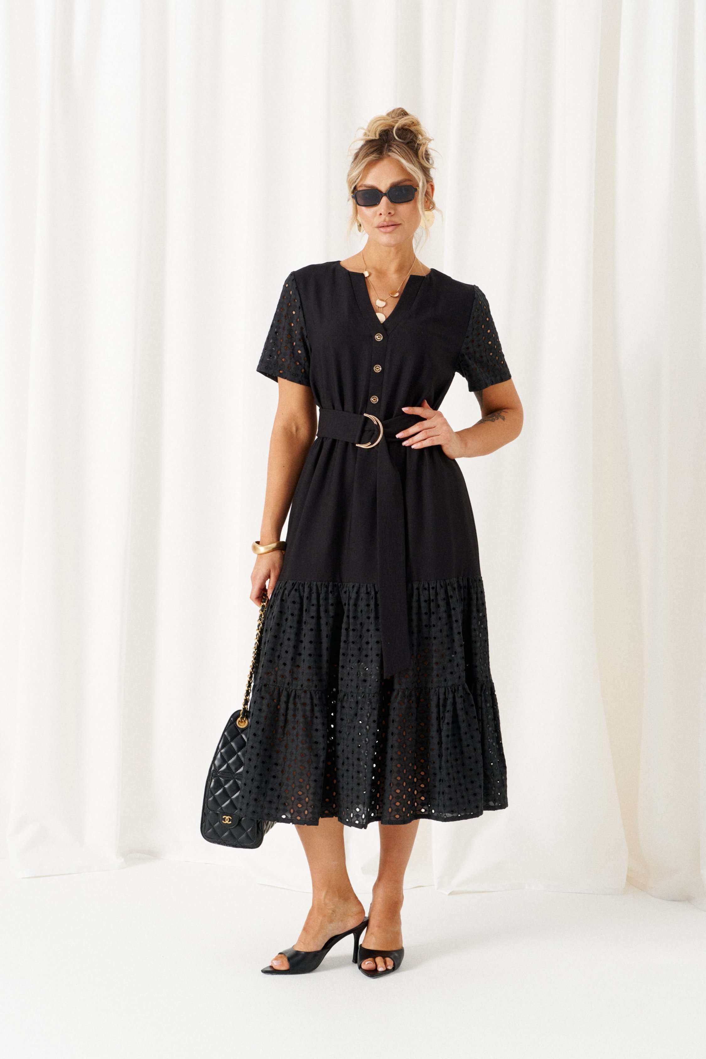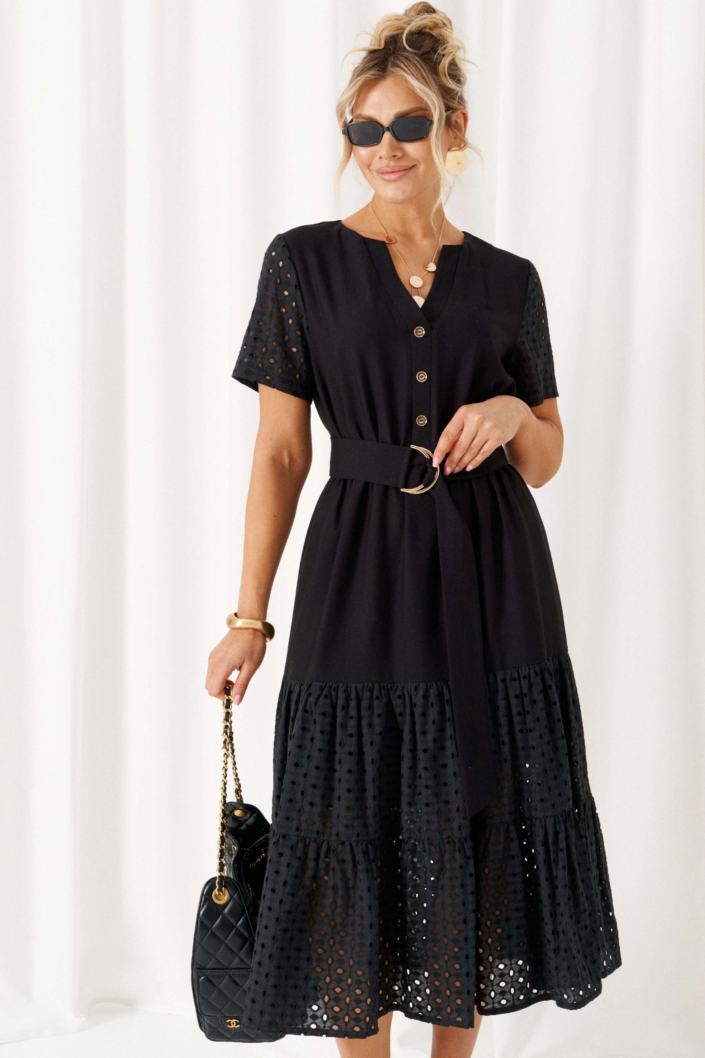 Легкое, струящееся платье – идеальный выбор для лета! Универсального фасона, подходящее для любого мероприятия, длинное хлопковое платье свободного прилегания станет любимым в гардеробе! Даже в самый жаркий день вы будете чувствовать уверенно и комфортно. Платье полуприлегающего силуэта, длинное, на хлопковой подкладке, отрезное по линии талии, дополнено поясом с декоративной пряжкой. Верхняя часть переда из двух частей с центральной притачной планкой, имитирующей застежку, и мягкой сборкой по талии. Спинка цельнокроеная со сборкой по талии. Низ платья объемный, широкий состоит из трех частей: юбки и двух воланов со сборкой. Рукав короткий, одношовный, втачной. Горловина V-образной формы, обработана по переду планкой с тремя декоративными пуговицами. Рукав платья и воланы выполнены из отделочной ткани с вышивкой, что придает платью отличительный и эффектный вид. Длина изделия по спинке ~ 125 см. Длина рукава ~ 24,5 см.
