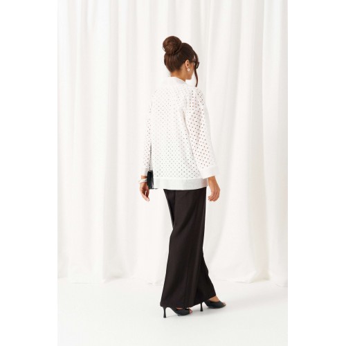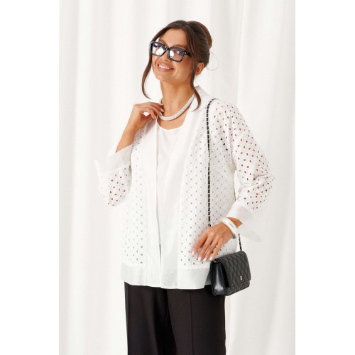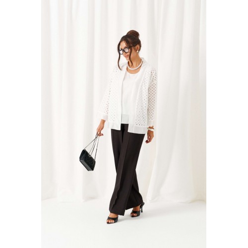 Брючный комплект в комбинации роскошного льняного полотна с эффектным шитьем не останется незаметным в весенне-летнем сезоне! Жакет свободного силуэта, напоминающий кардиган, с удлиненной линией плеча. Перед с нагрудными вытачками от бокового шва. Спинка цельнокроеная. Рукав рубашечный одношовный длиной 7/8 на притачной манжете. Нижняя часть блузона и борта обработаны притачной планкой из отделочной ткани. Брюки свободного силуэта прямые, с двумя верхними боковыми функциональными карманами. Высота сиденья классическая. Застежка центральная на молнию и на петлю с пуговицей на поясе. Брюки на поясе, в задней части которого для удобного прилегания по талии вставлена резинка. Топ полуприлегающего силуэта. Перед цельный, с двумя нагрудными выточками от бокового шва. Спинка цельная. Низ слегка закругленный к боковым участкам. Горловина округлой формы. Длина жакета (по середине спинки) ~ 66,5 см. Длина рукава жакета (+ плечо) ~ 65,5 см. Длина брюк (по боковому шву с поясом) ~ 108 см. Длина топа (по середине спинки) ~ 62,5 см.