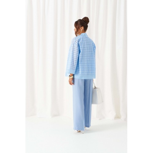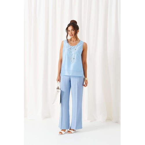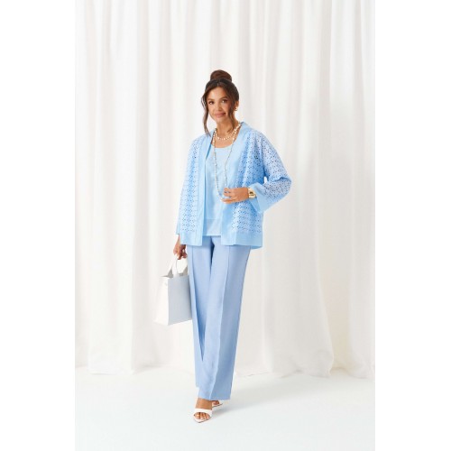 Брючный комплект в комбинации роскошного льняного полотна с эффектным шитьем не останется незаметным в весенне-летнем сезоне! Жакет свободного силуэта, напоминающий кардиган, с удлиненной линией плеча. Перед с нагрудными вытачками от бокового шва. Спинка цельнокроеная. Рукав рубашечный одношовный длиной 7/8 на притачной манжете. Нижняя часть блузона и борта обработаны притачной планкой из отделочной ткани. Брюки свободного силуэта прямые, с двумя верхними боковыми функциональными карманами. Высота сиденья классическая. Застежка центральная на молнию и на петлю с пуговицей на поясе. Брюки на поясе, в задней части которого для удобного прилегания по талии вставлена резинка. Топ полуприлегающего силуэта. Перед цельный, с двумя нагрудными выточками от бокового шва. Спинка цельная. Низ слегка закругленный к боковым участкам. Горловина округлой формы. Длина жакета (по середине спинки) ~ 66,5 см. Длина рукава жакета (+ плечо) ~ 65,5 см. Длина брюк (по боковому шву с поясом) ~ 108 см. Длина топа (по середине спинки) ~ 62,5 см.