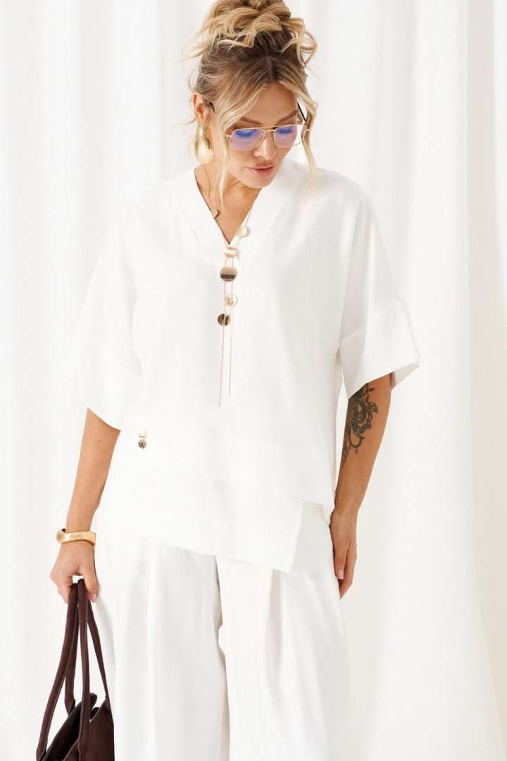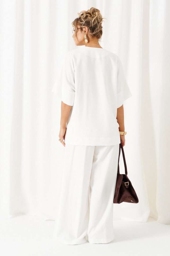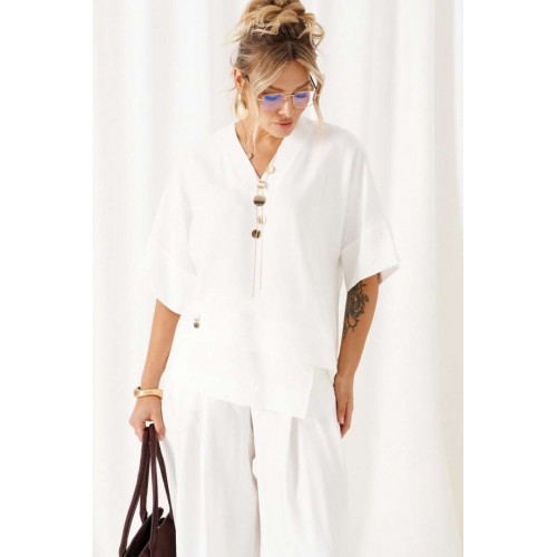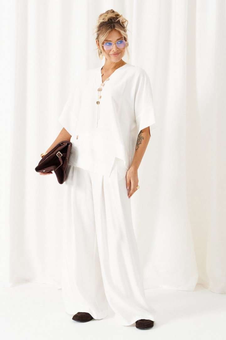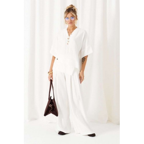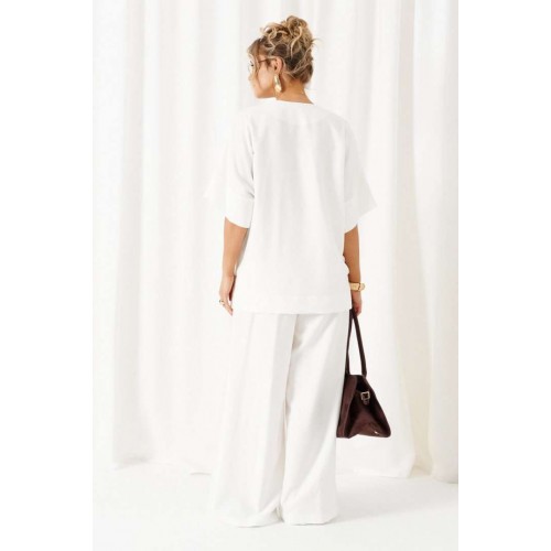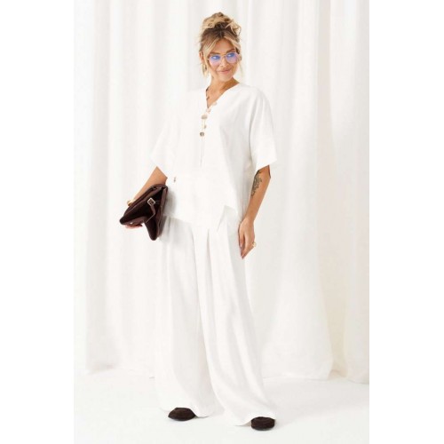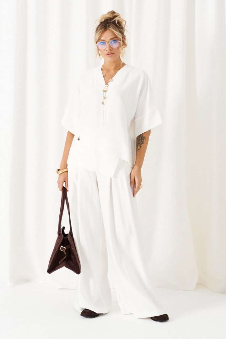 Женский льняной костюм из смесовой ткани с натуральным составом, с акцентными деталями и в безупречных любимых оттенках. Созданный в расслабленном крое с подчеркнутыми линиями, костюм позволит чувствовать себя комфортно и непринужденно. Стильный костюм состоит из блузона и брюк, выполнен из мягкой ткани с волокнами льна и вискозы, практичен в носке. Блузон свободного силуэта, цельнокроеного покроя с удлиненной линией плеча. Передняя часть цельная, с асимметричным подрезом, который оформлен разноуровневыми деталями-планками. Спинка цельная, чуть длиннее переда. Вырез горловины V-образный, обработан планками. Линия плеча удлиненная, спущенная, переходящая в цельнокроеный рукав, который заканчивается притачной манжеткой. Низ неровный, по боковым участкам выполнены разрезы. Брюки длинные, прямые свободные. Посадка стандартная, на поясе. Спереди выполнены карманы с обтачкой и заложены глубокие складки от пояса и от кармана. Сзади вытачки. Застежка центральная на молнию и на петлю с пуговицей на поясе. Пояс притачной, шириной 4см с эластичной тесьмой по заднему участку. длина блузона (по среднему шву спинки) - 75 см. длина брюк (по боковому шву с поясом) – 110 см.