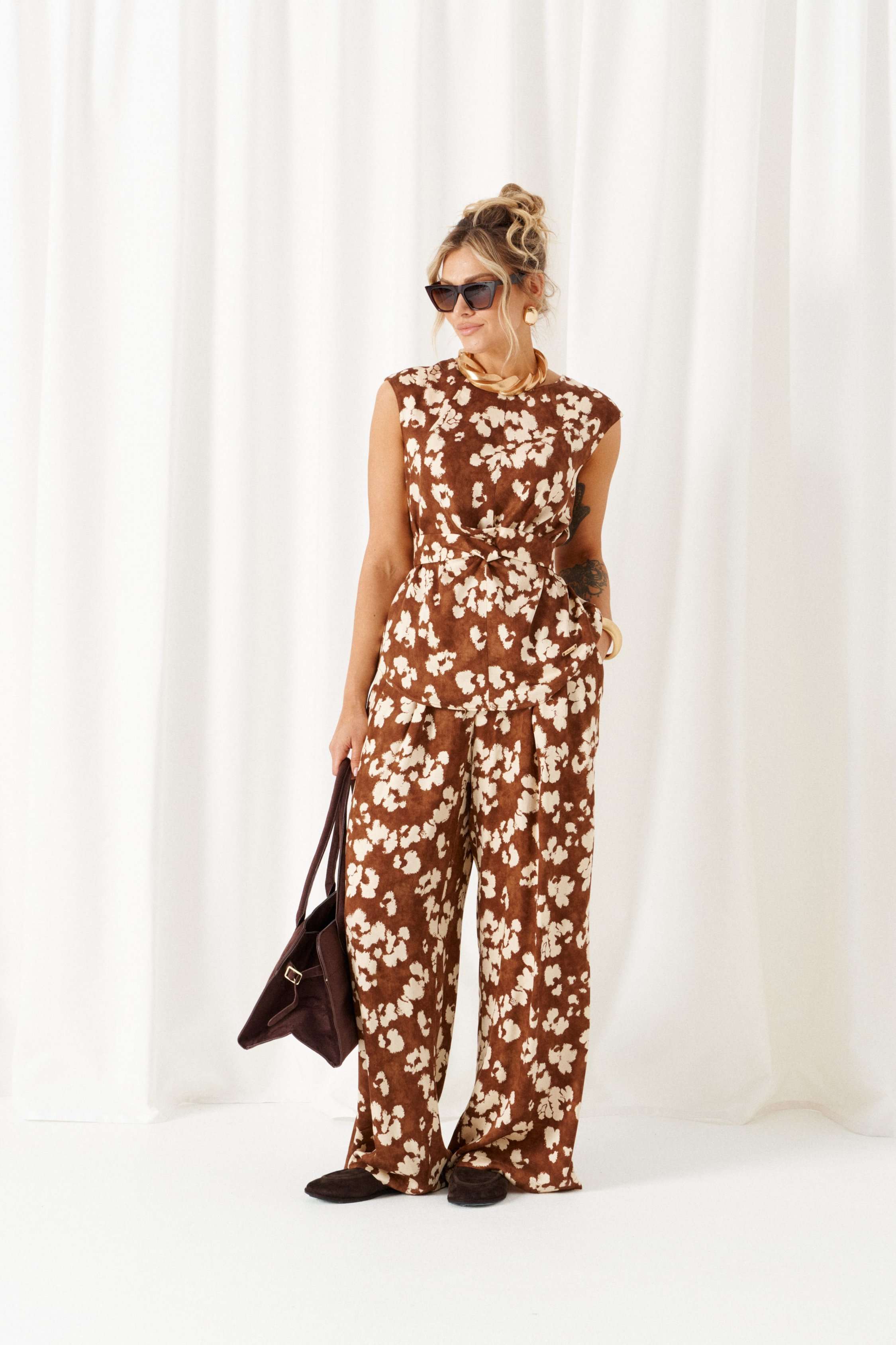 Стильный женский костюм в стиле фьюжн, дополненный акцентными деталями, весьма актуален в будущем сезоне. Предметы костюма можно смело комбинировать по отдельности с другими вещами гардероба. Костюм состоит из 2-х предметов одежды: блузки и брюк. Выполнен из ткани с содержанием натуральных волокон льна и вискозы. Блузка полуприлегающего силуэта свободного кроя, со слегка удлиненной линией плеча, без рукава. Индивидуальность изделию придает цельнокроеная деталь, выполняющая роль пояса-завязки, который перекручиваясь создает красивый узел спереди и фиксирует талию. Перед из двух симметричных деталей с вертикальным швом посередине. Спинка со средним швом, сверху вставлена потайная застежка-молния. О-образный вырез горловины. Низ блузки слегка закругленный к боковым участкам. Брюки прямого силуэта, длинные, свободные, со складками от пояса, с двумя верхними боковыми карманами спереди. Высота сидения классическая. Застежка центральная на молнию и на петлю с пуговицей на поясе. Брюки на притачном поясе, в который для удобного прилегания вставлена резинка по заднему участку. Длина блузки (по середине спинки) ~ 65 см. Длина брюк (с поясом) ~ 110 см.
