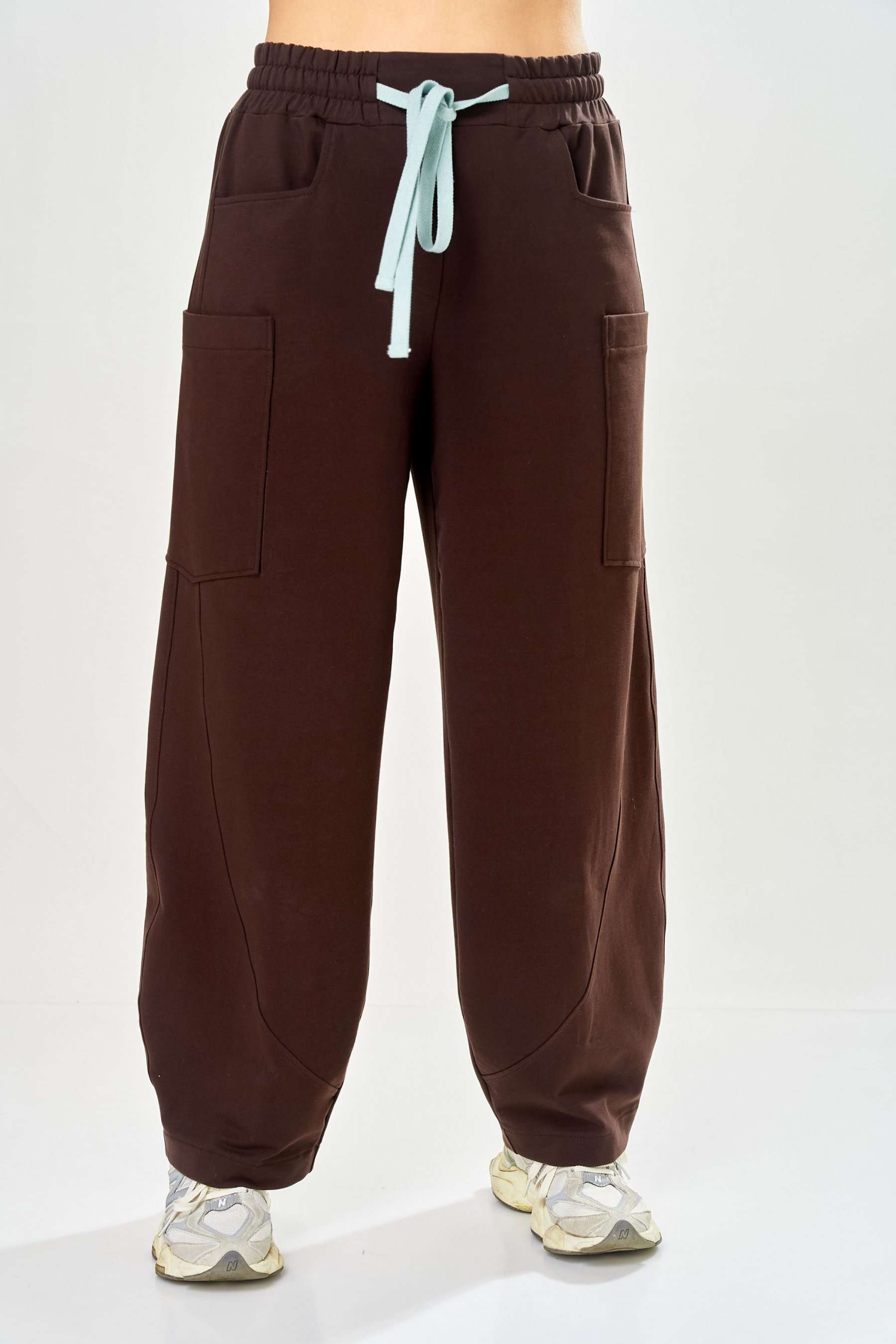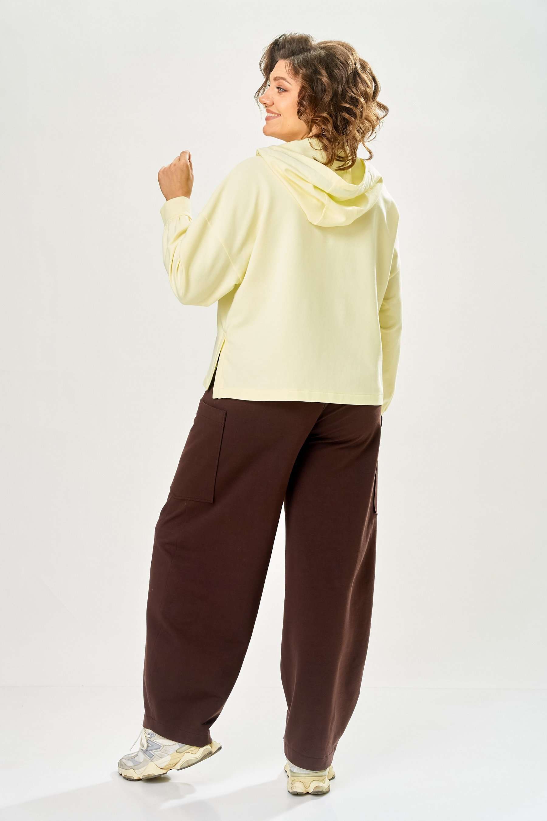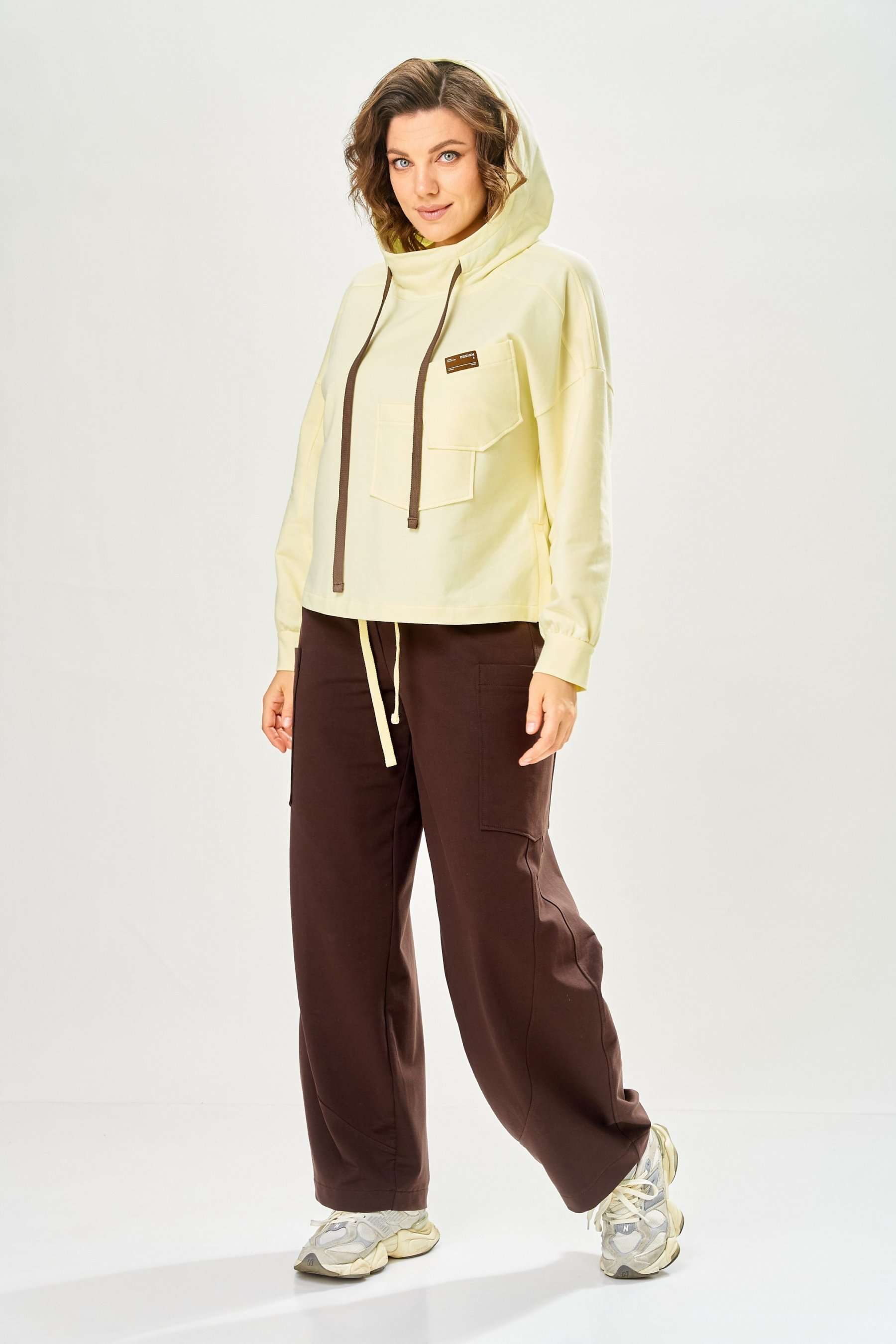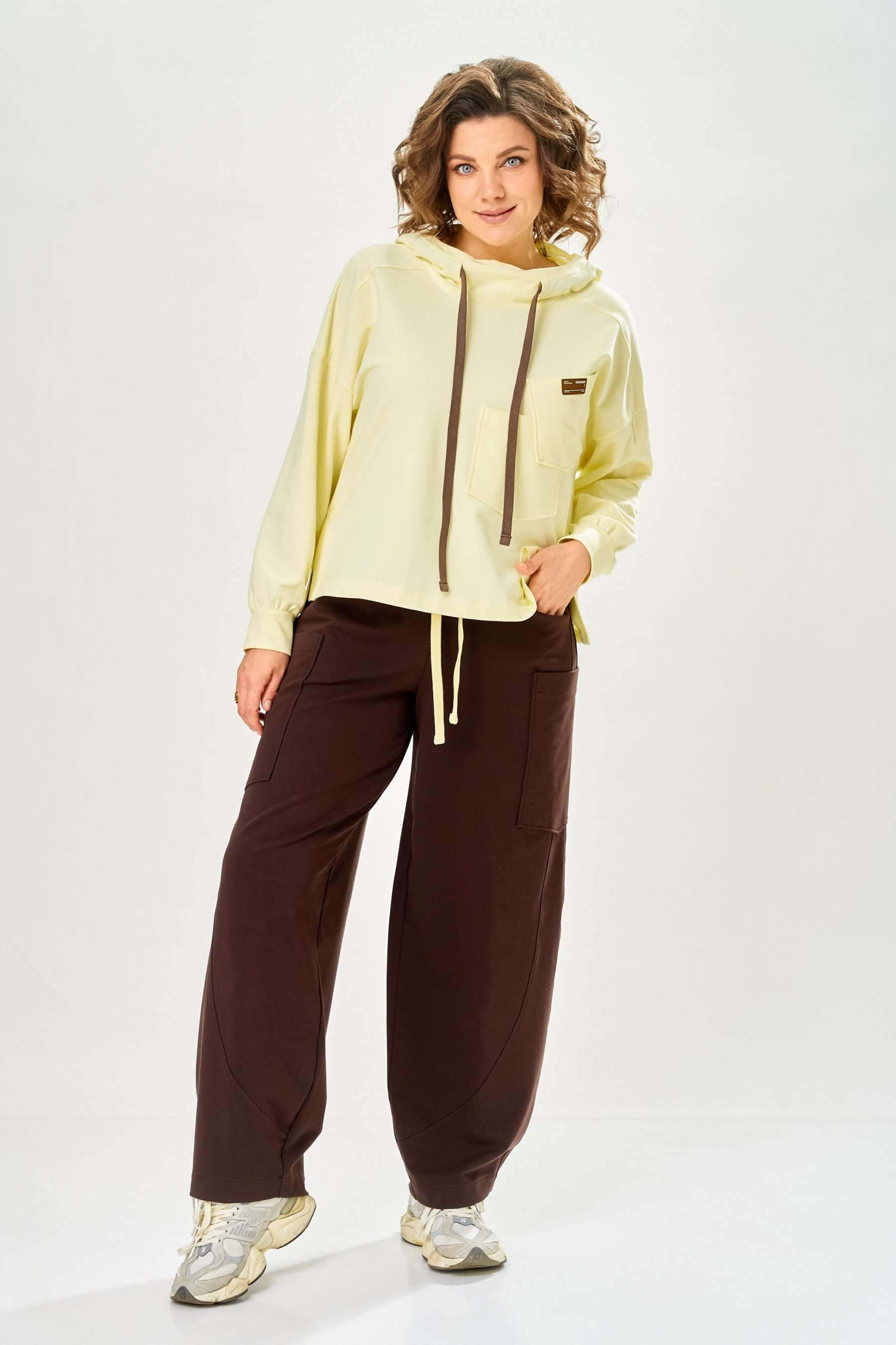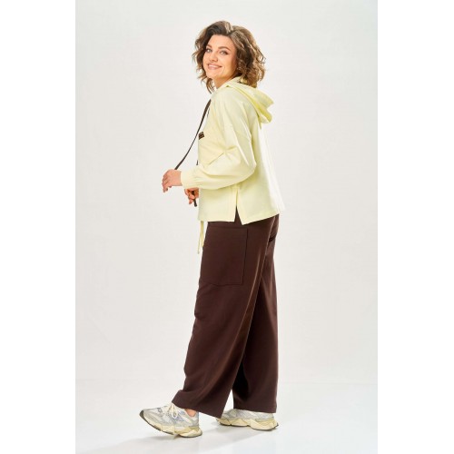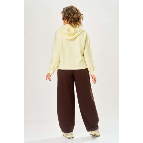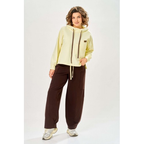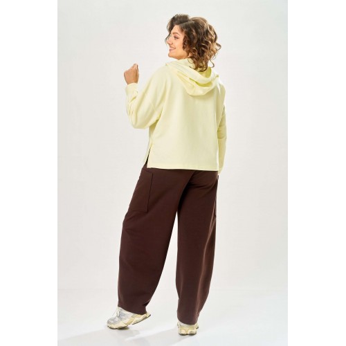 Стильный женский костюм, выполнен из футера. Состоит из свитшота и брюк. Свитшот свободного силуэта со спущенной линией плеча. Горловина оформлена капюшоном, по переду два накладных кармана. В боковых швах разрезы. Рукава с манжетом и сборкой по низу. На кармане декоративная нашивка. Брюки свободного силуэта, заужены к низу. В боковых швах карманы с подрезным бочком, на уровне бедер накладные карманы. Верх брюк оформлен поясом на резинке. В пояс вставлен шнур. Длина свитшота – 58 см Длина рукава – 44 см Ширина плеча – 25 см Длина брюк по боковому срезу – 108 см Длина брюк по шаговому шву – 78 см